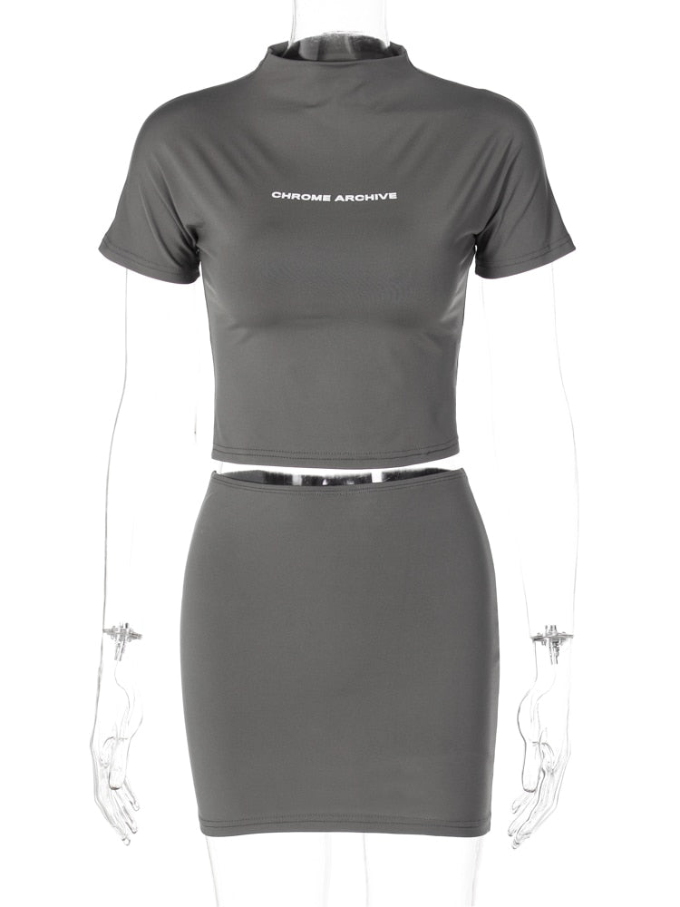 Hugcitar Letter Print Solid Turtleneck Short Sleeves Crop Top Skirts 2 Pcs Set Sexy Slim Summer Fashion Outfit Streetwear Sports