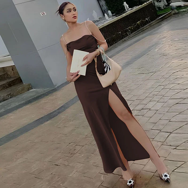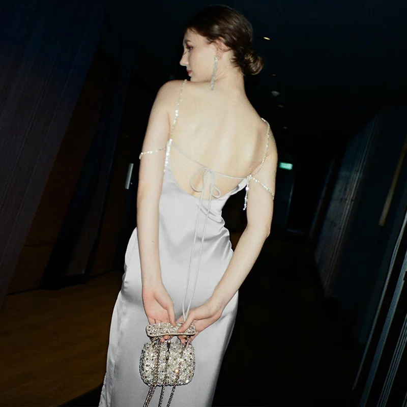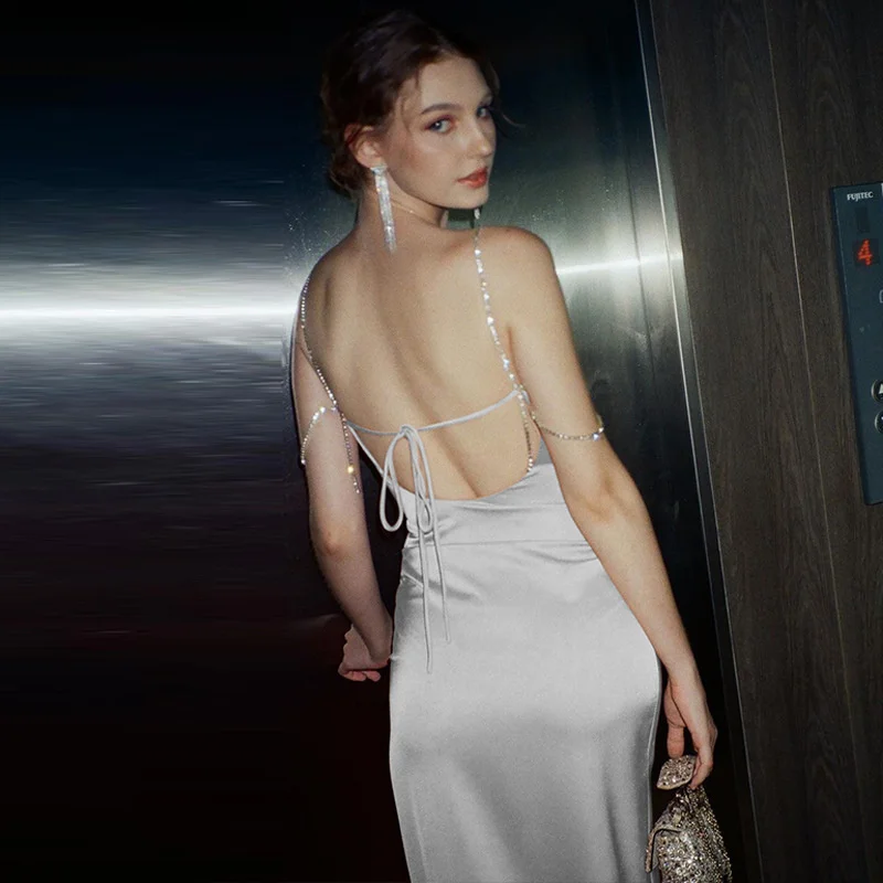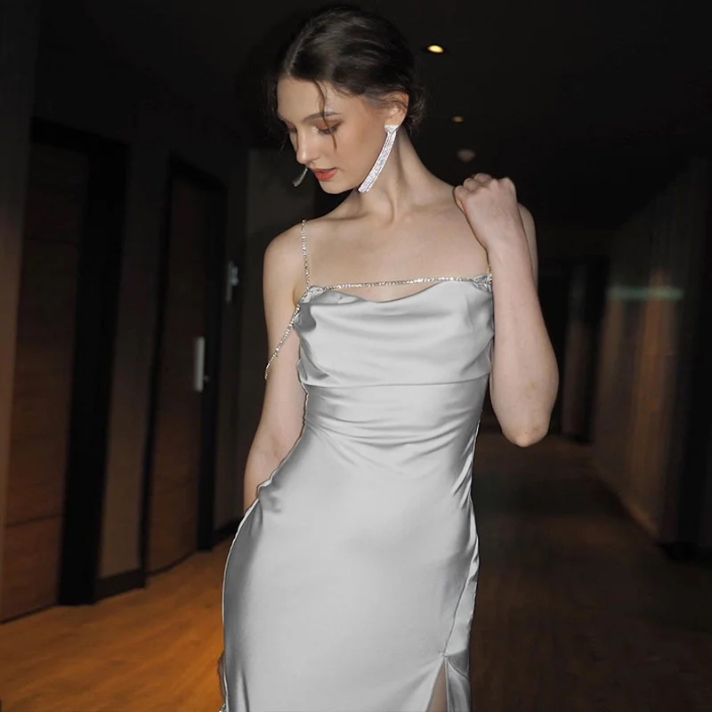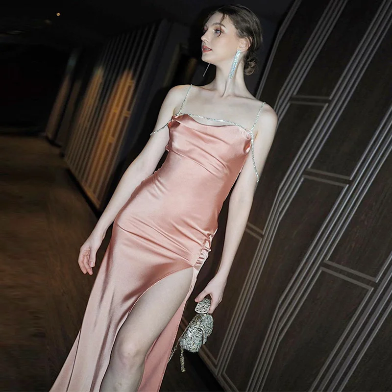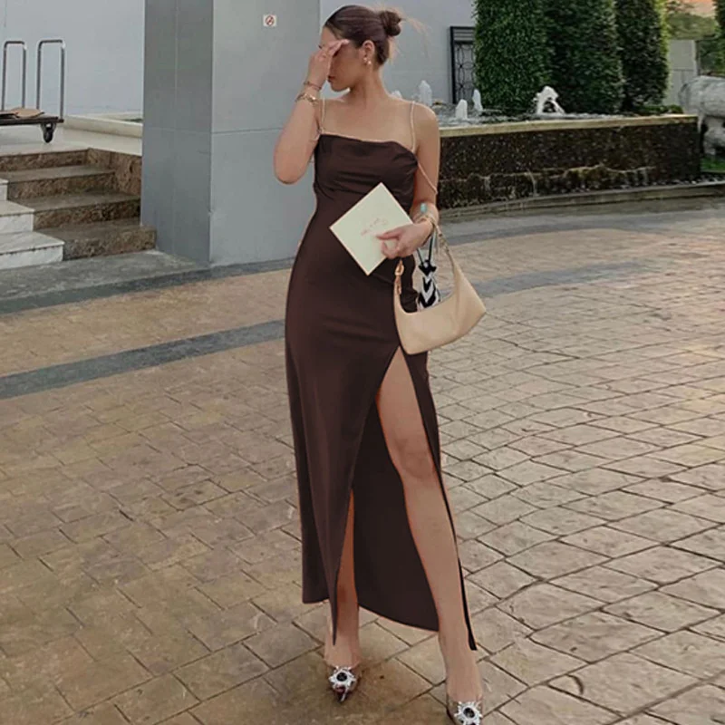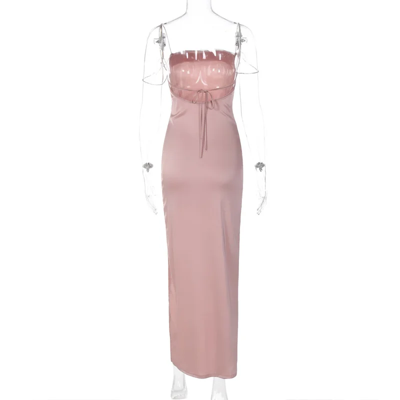JULISSA MO Sexy Sparkling Spaghetti Strap Side Split Maxi Dress For Women Elegant Satin Backless Party Club Evening Dress