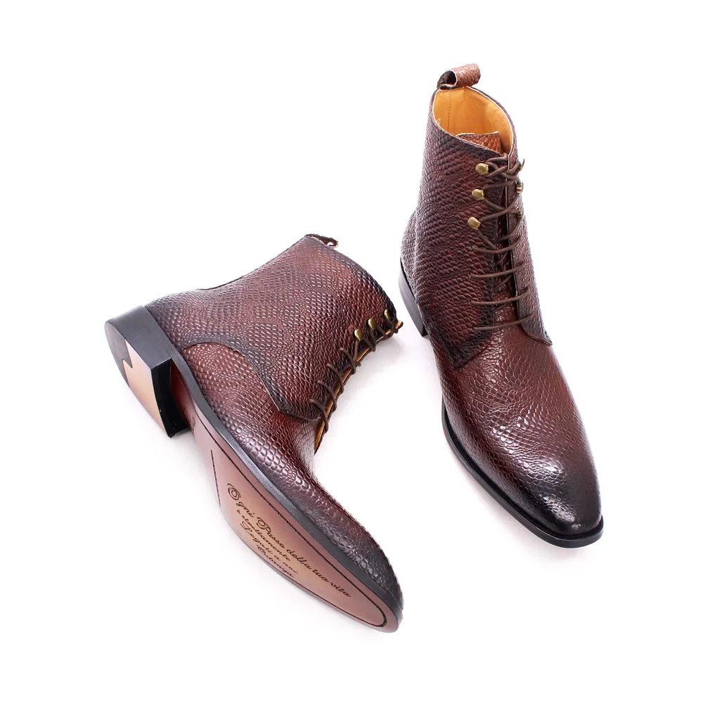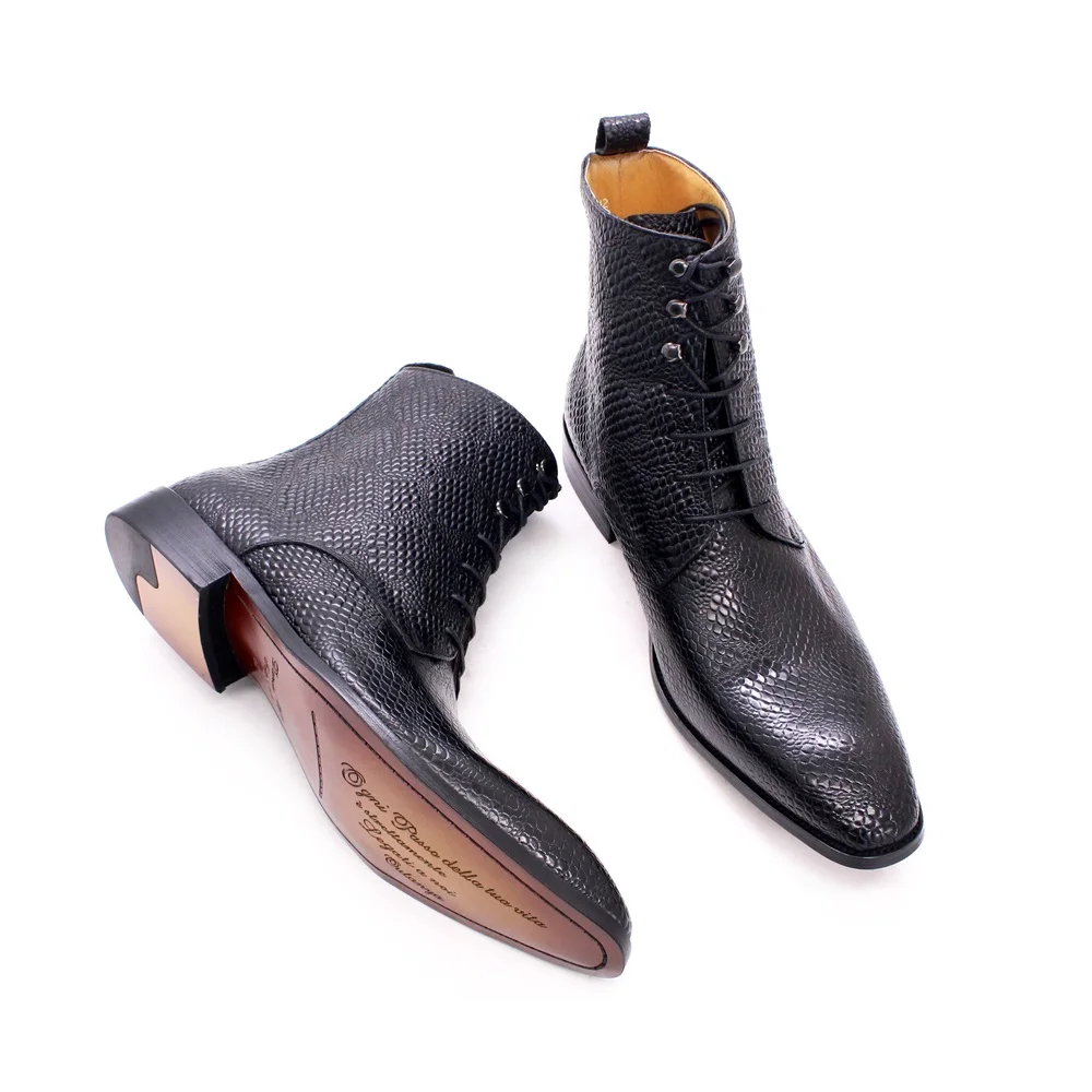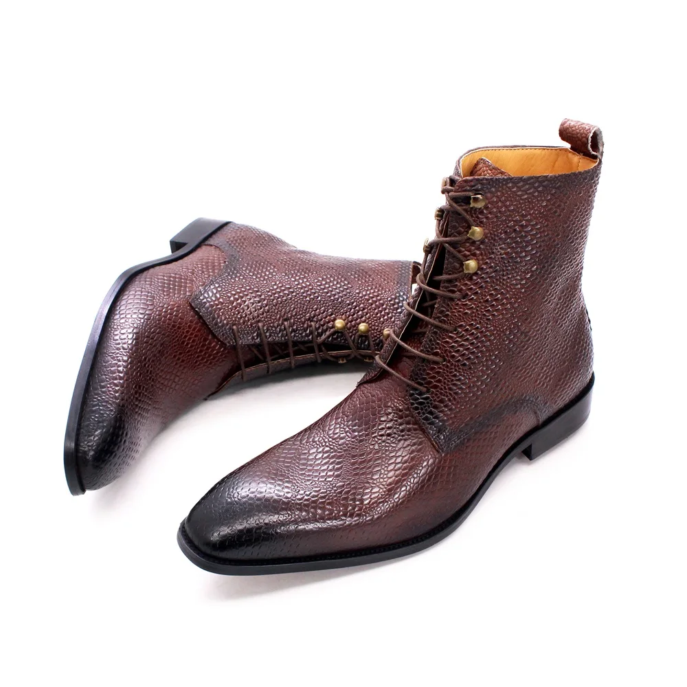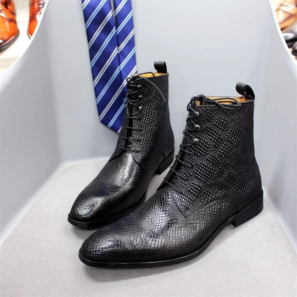 Luxury Mens Ankle Boots Real Cow Leather Snake Pattern Street Style High Top Mid-Calf Lace Up Western Winter Boots for Men