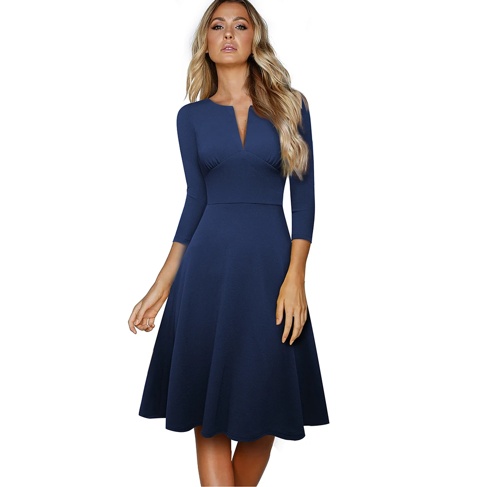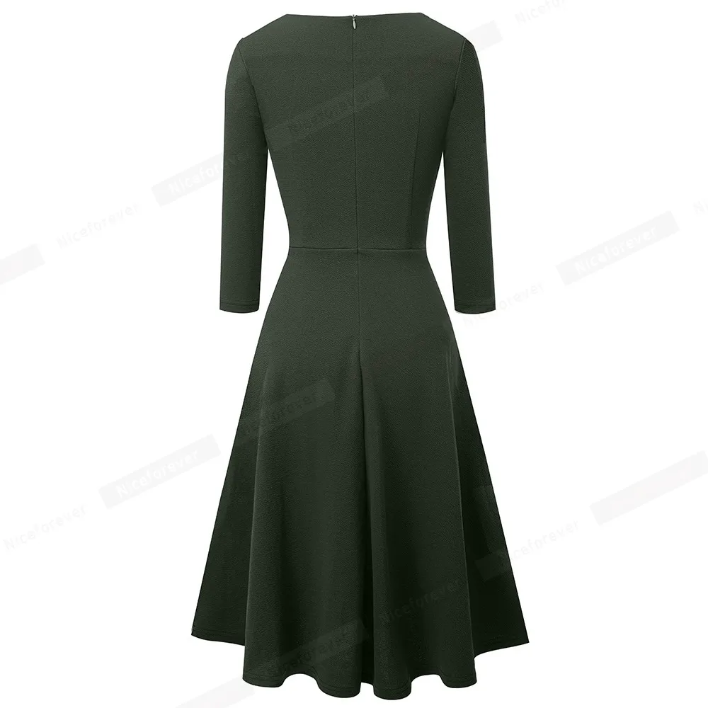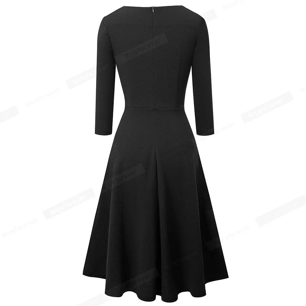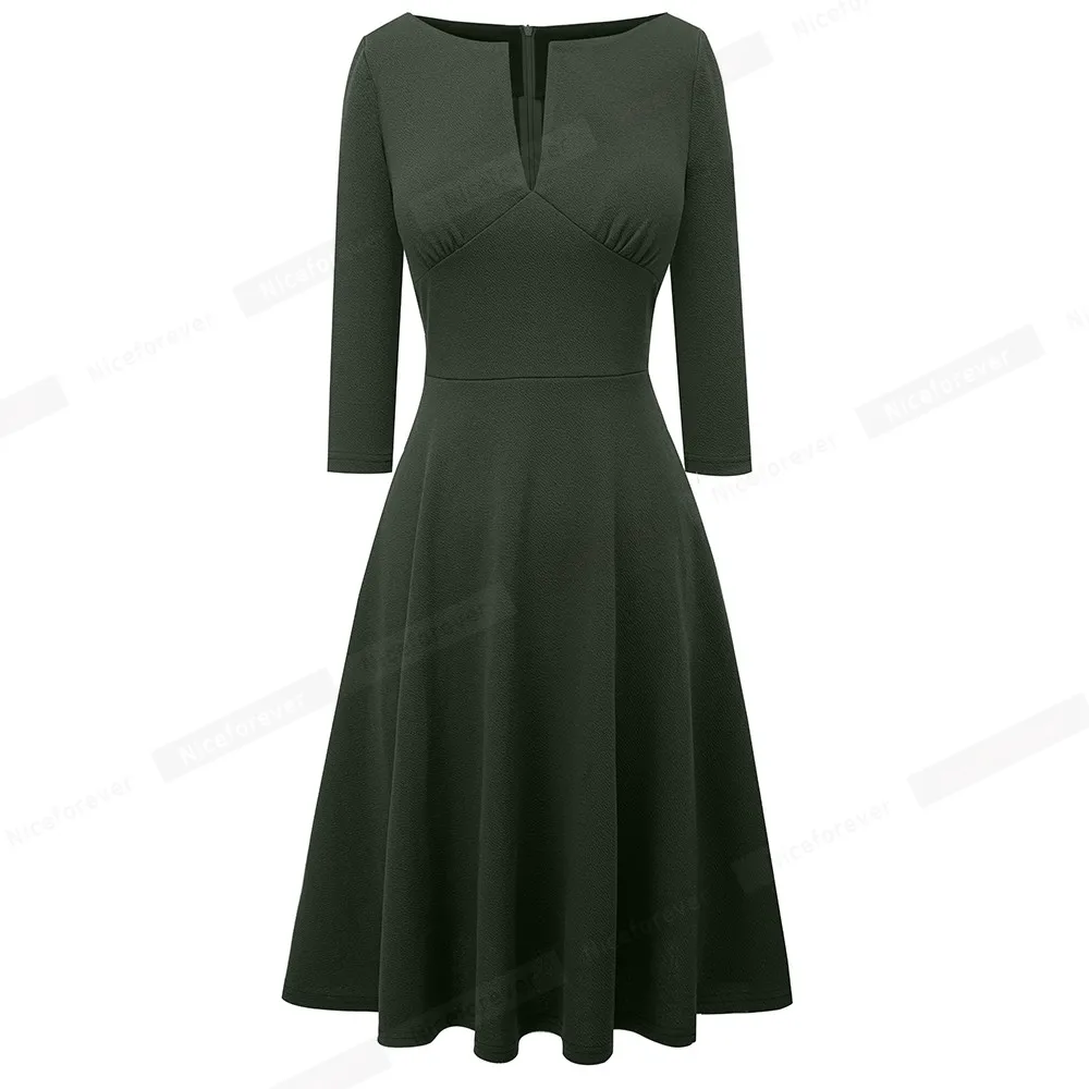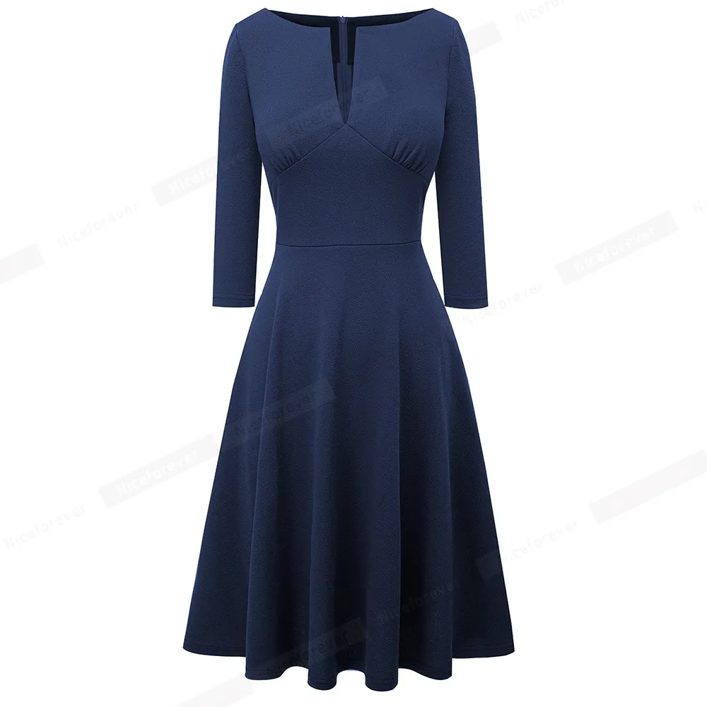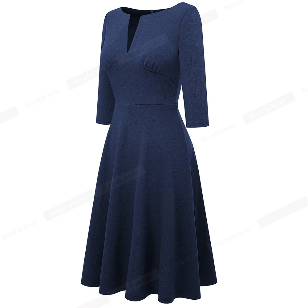 Nice-forever Spring Women Classic Solid Color Elegant Low Cut Dresses Formal Party Flare Swing Dress A289
