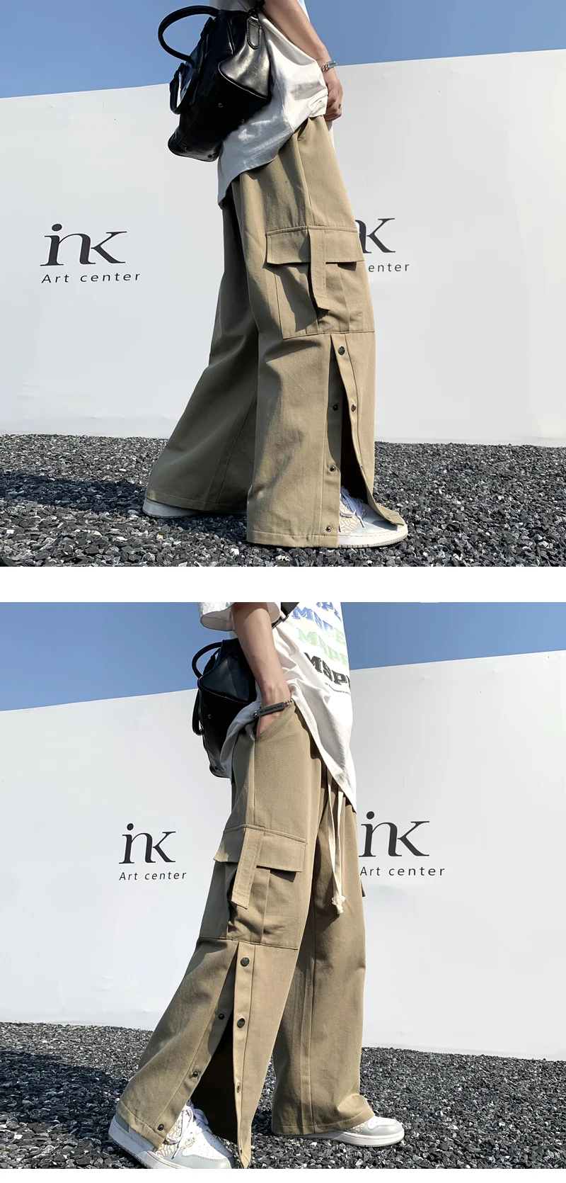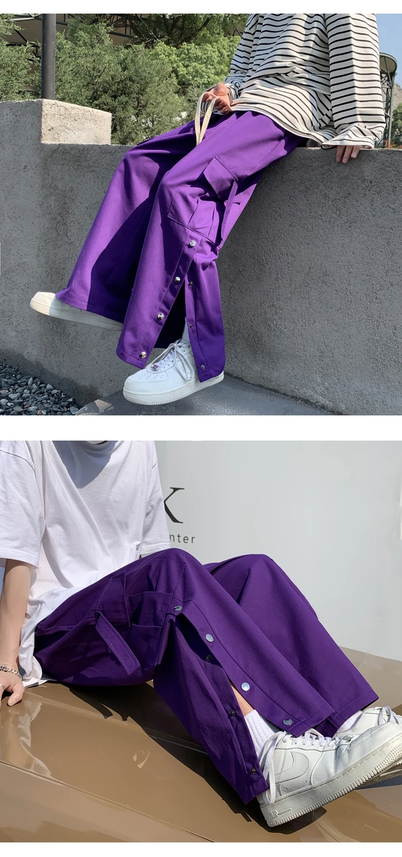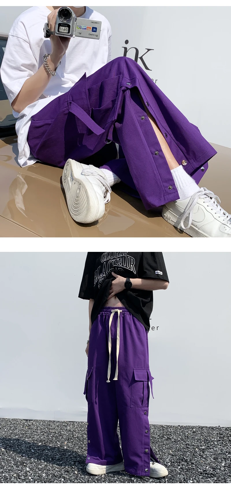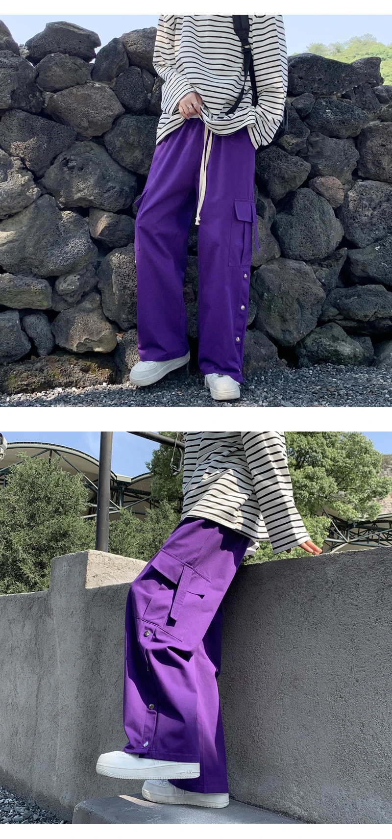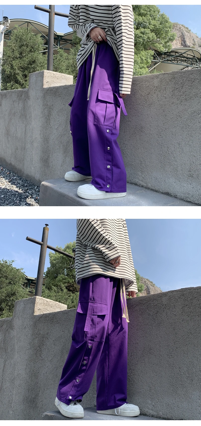 Purple Wide Leg Hip Hop Cargo Pants Button Decor Men Casual Cotton Pants Loose Baggy Trousers Streetwear Joggers Men Clothing