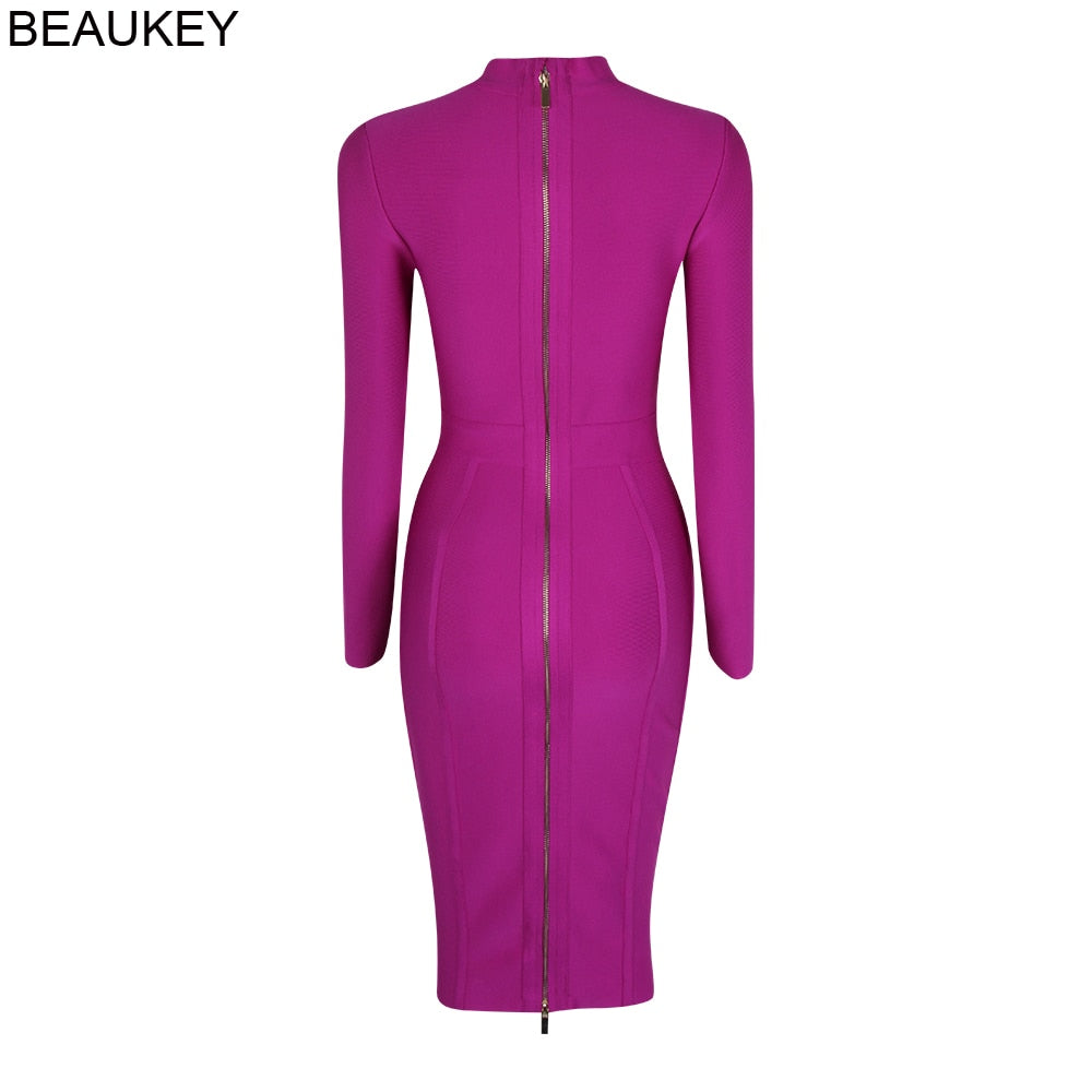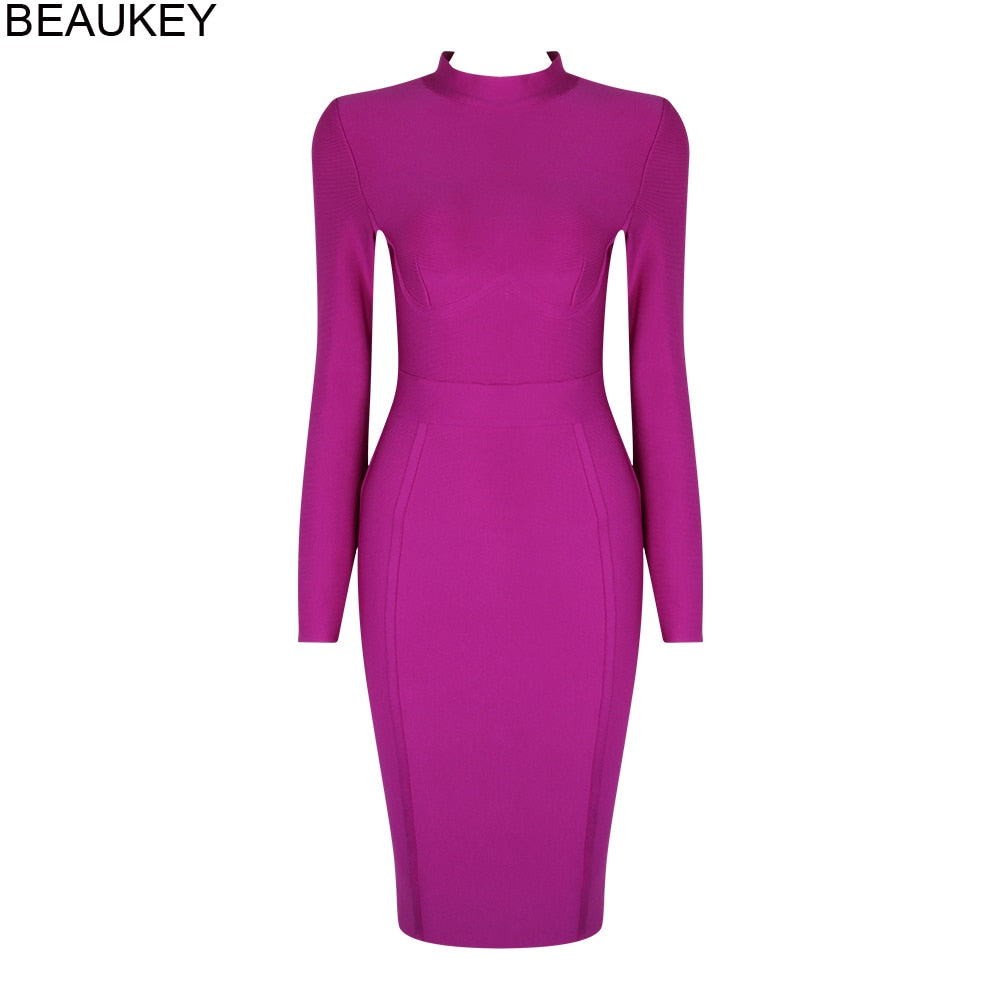 BEAUKEY Long Sleeve Knee Length Top Quality HL Bandage Dress Office Lady Bodycon Dress Color Black Wine Red Purple Plus Size XL