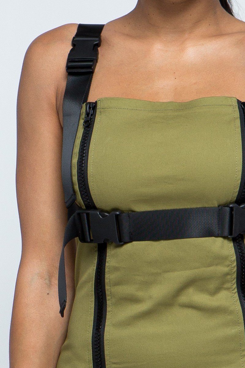 Experience the perfect blend of fashion and comfort with this dress's stretchable fabric, buckle details, and zippered accents. Ideal for those who appreciate a trendy and comfortable wardrobe.