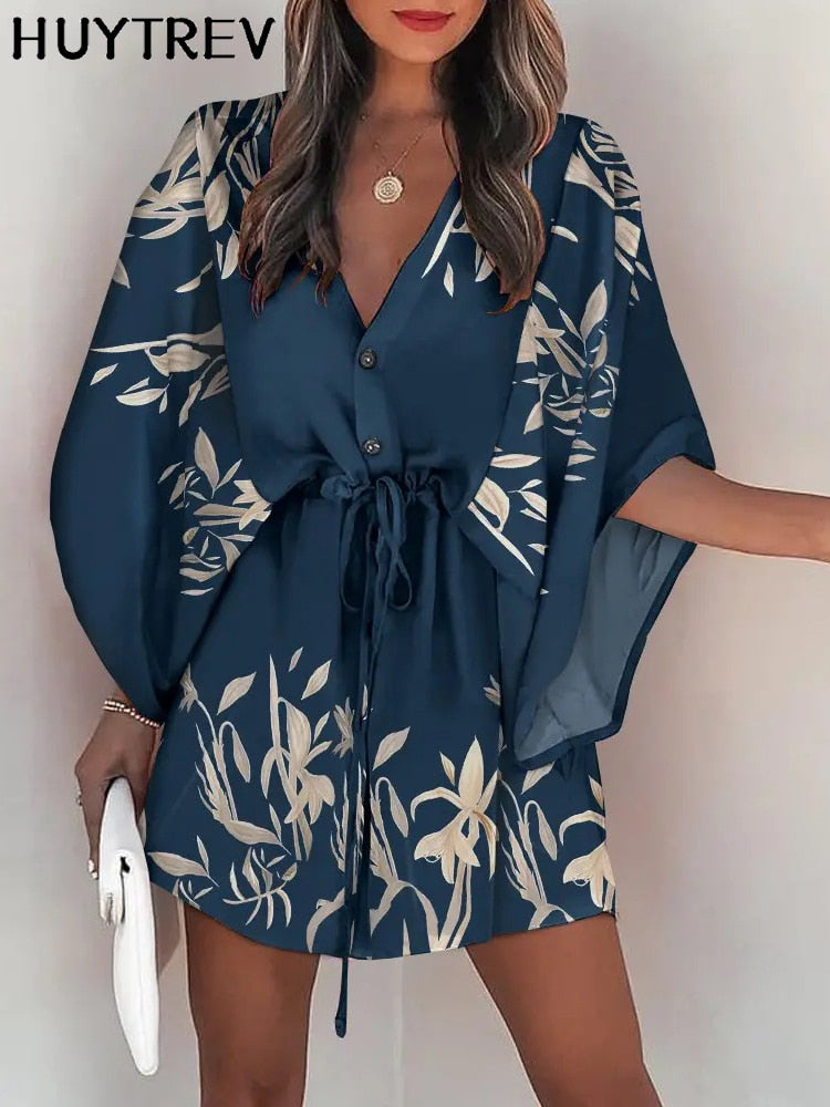 Casual Boho Beach Vacation Mini Dress Women Summer Print Lace Up Button Batwing Sleeve Dresses For Women's Loose Female Robe