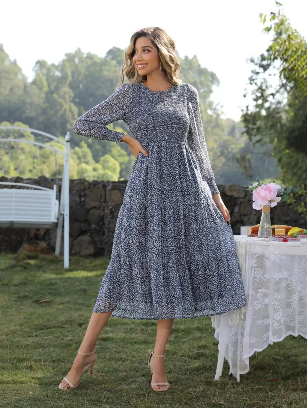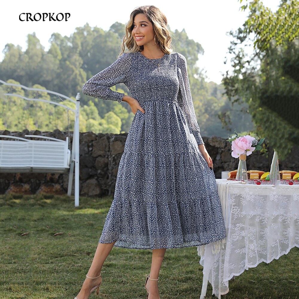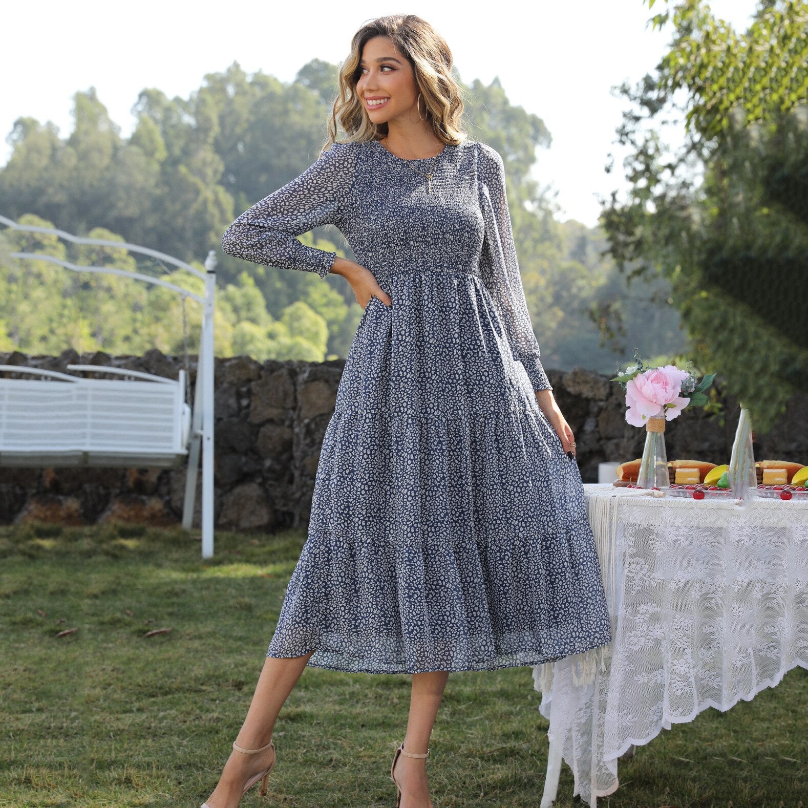 Chiffon Print Long Sleeve Dress Women Elegant Blue Ruffle Big Hem Long Party Dresses Casual Midi Holiday Dress Spring 2022 New