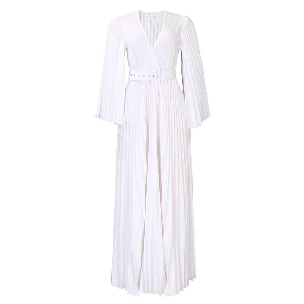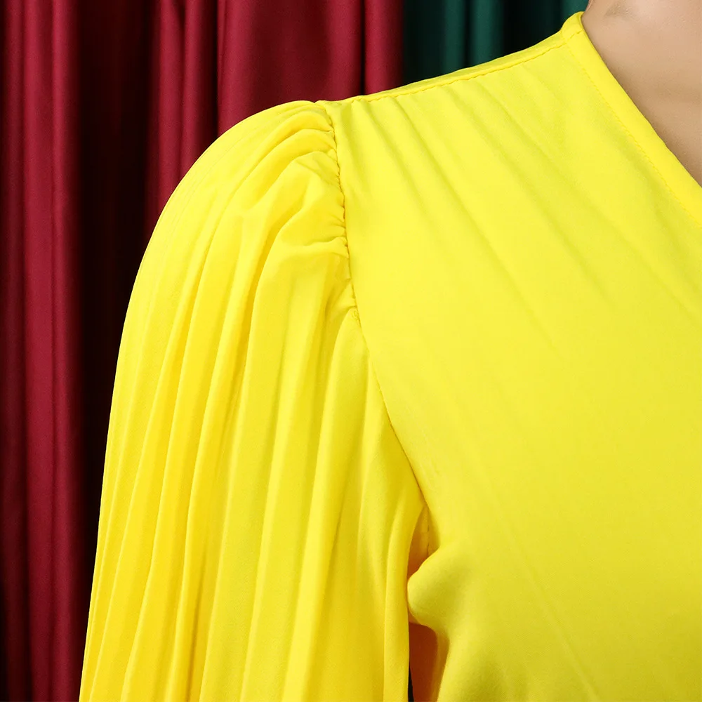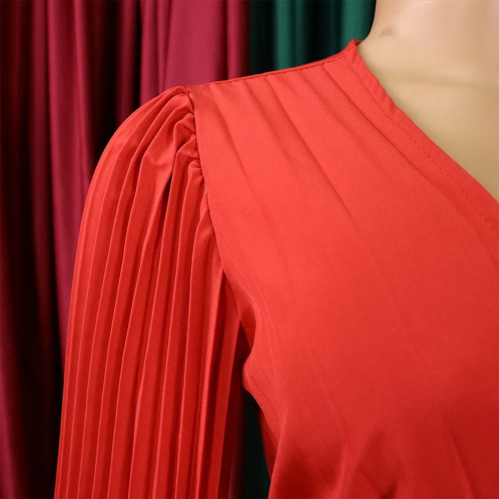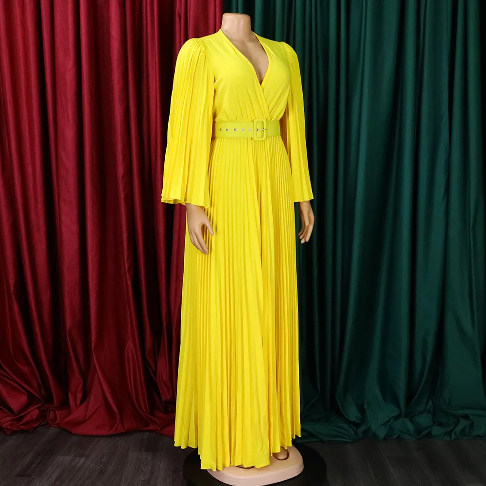 CM.YAYA Pleated Wraped V-neck Flare Sleeve Big Swing Floor Length Maxi Long Dresses for Women Autumn Winter Party Prom Dress