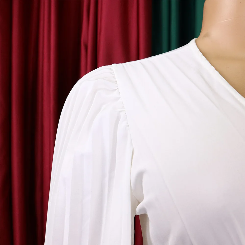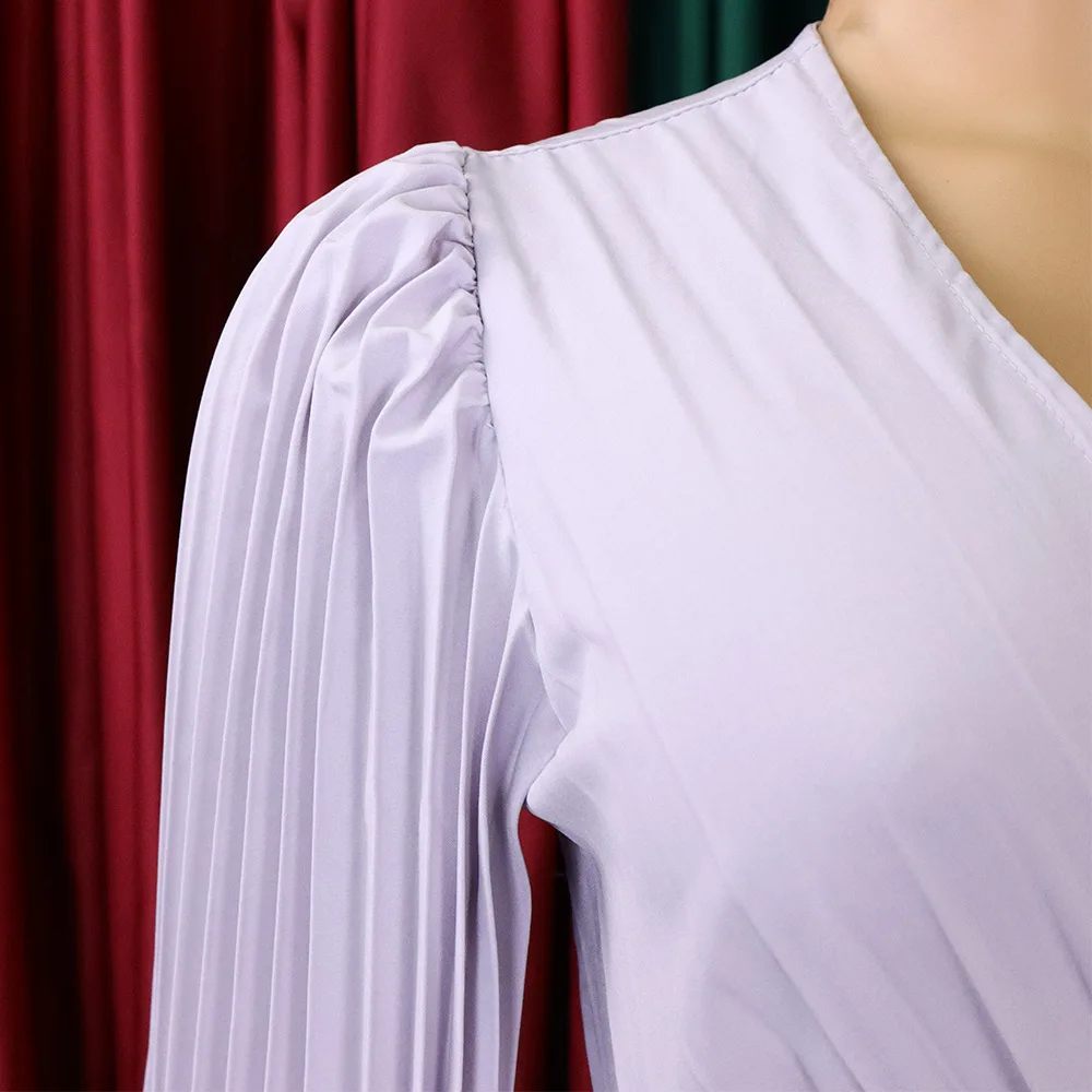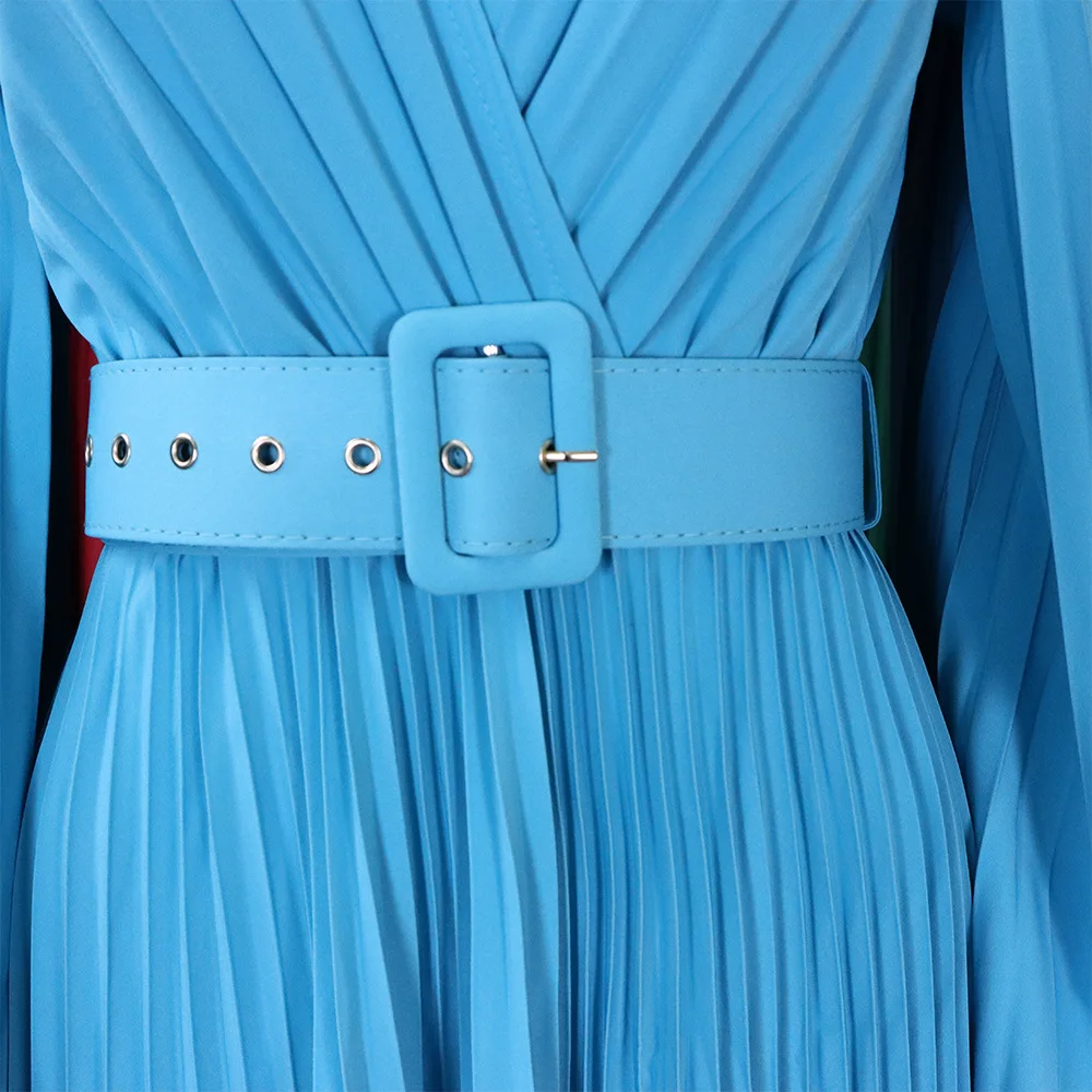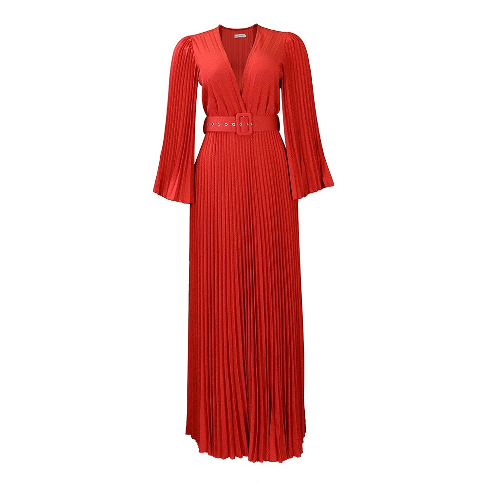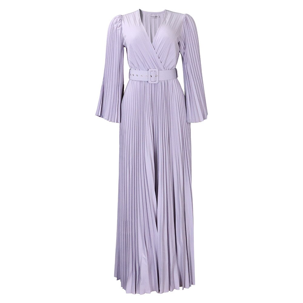 CM.YAYA Pleated Wraped V-neck Flare Sleeve Big Swing Floor Length Maxi Long Dresses for Women Autumn Winter Party Prom Dress