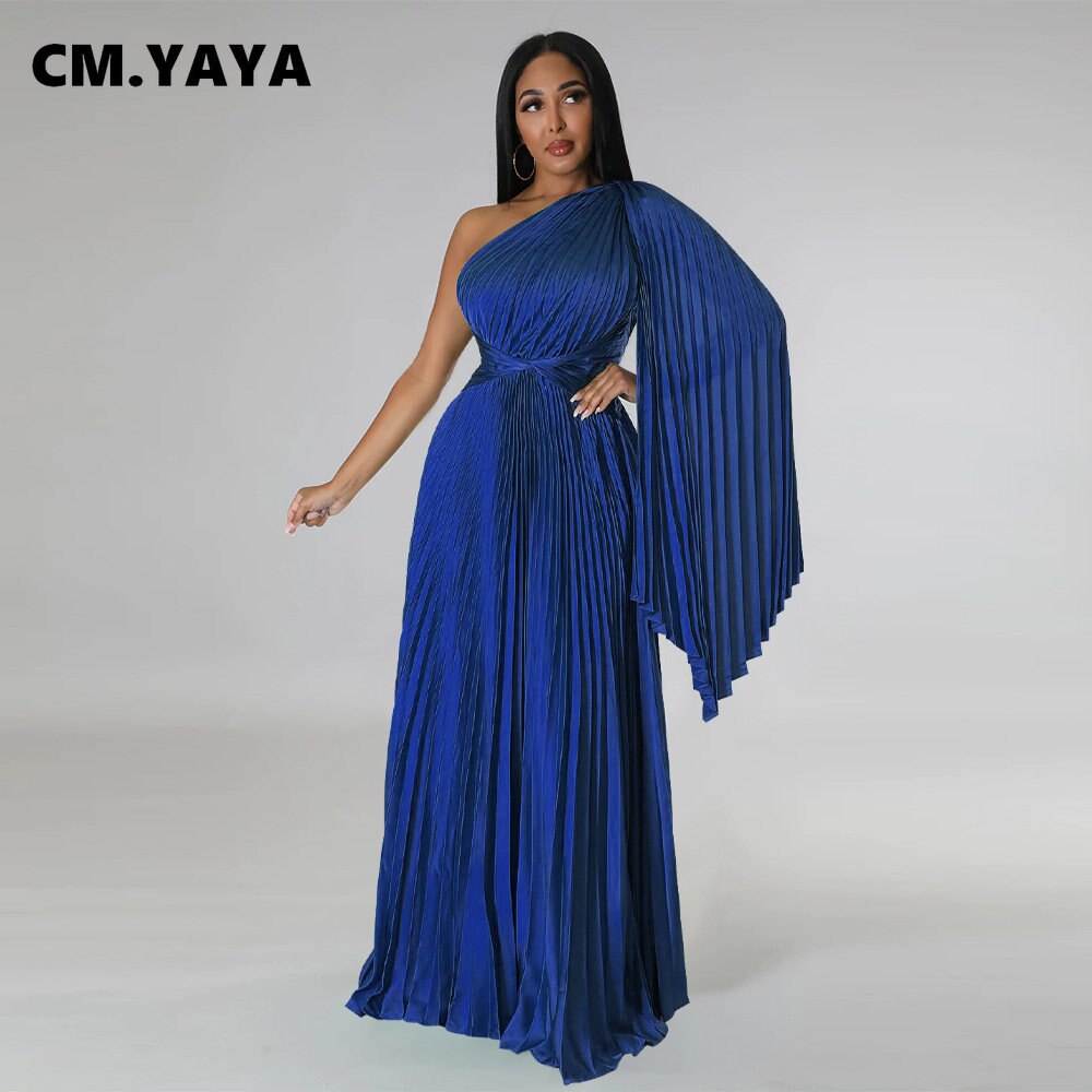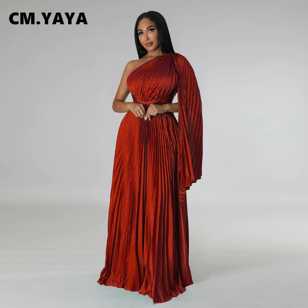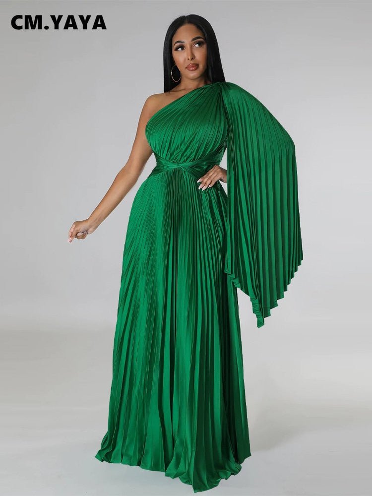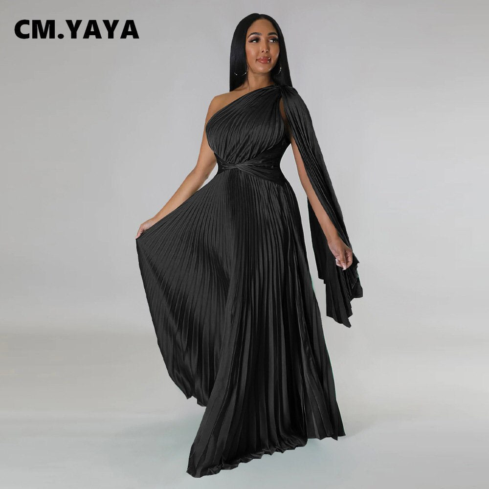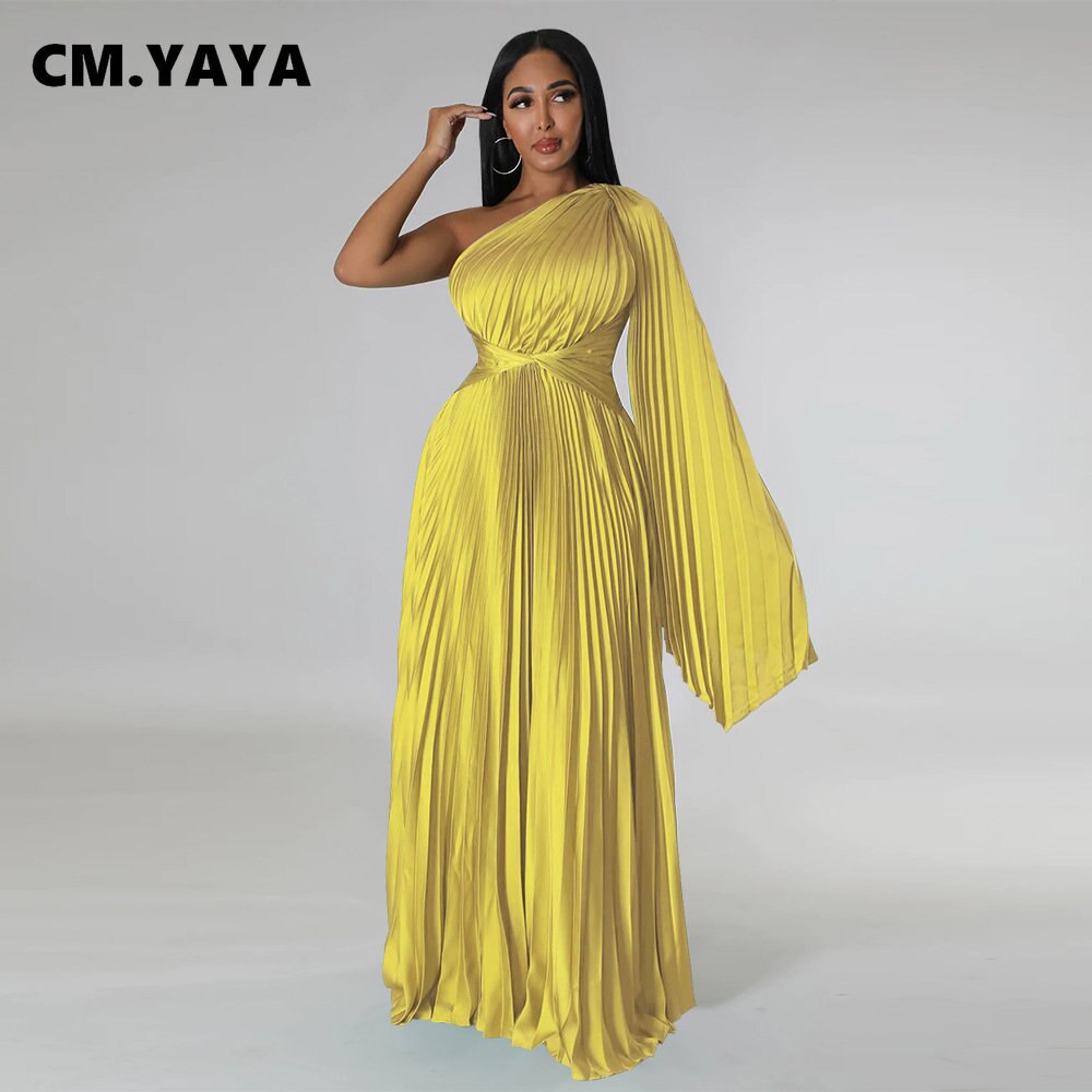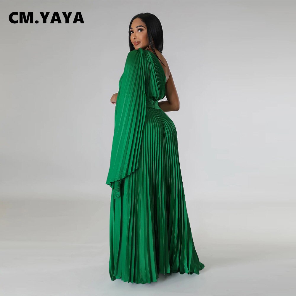CM.YAYA Vintage Women One Shoulder Clock Sleeve Sashes High Waist Big Swing Pleated Maxi Long Sexy Party Evening Silk Dress 2023