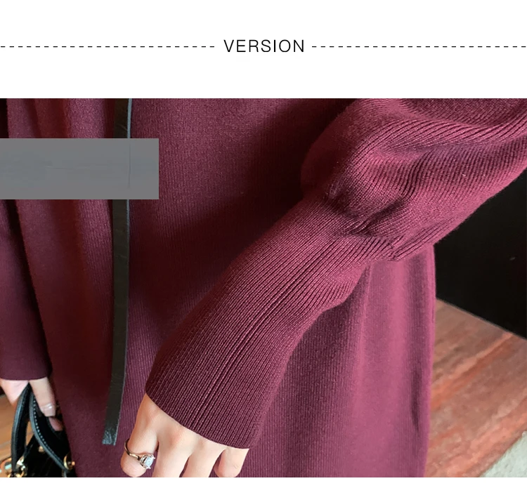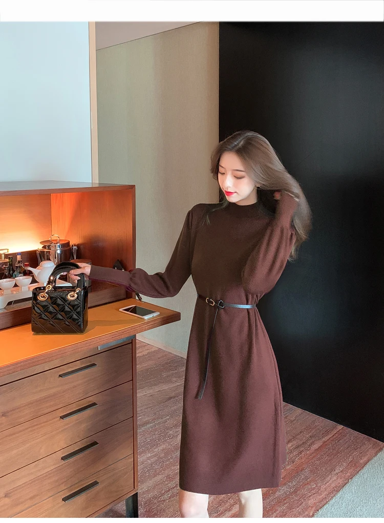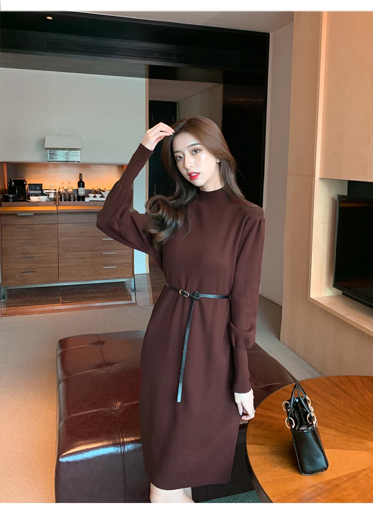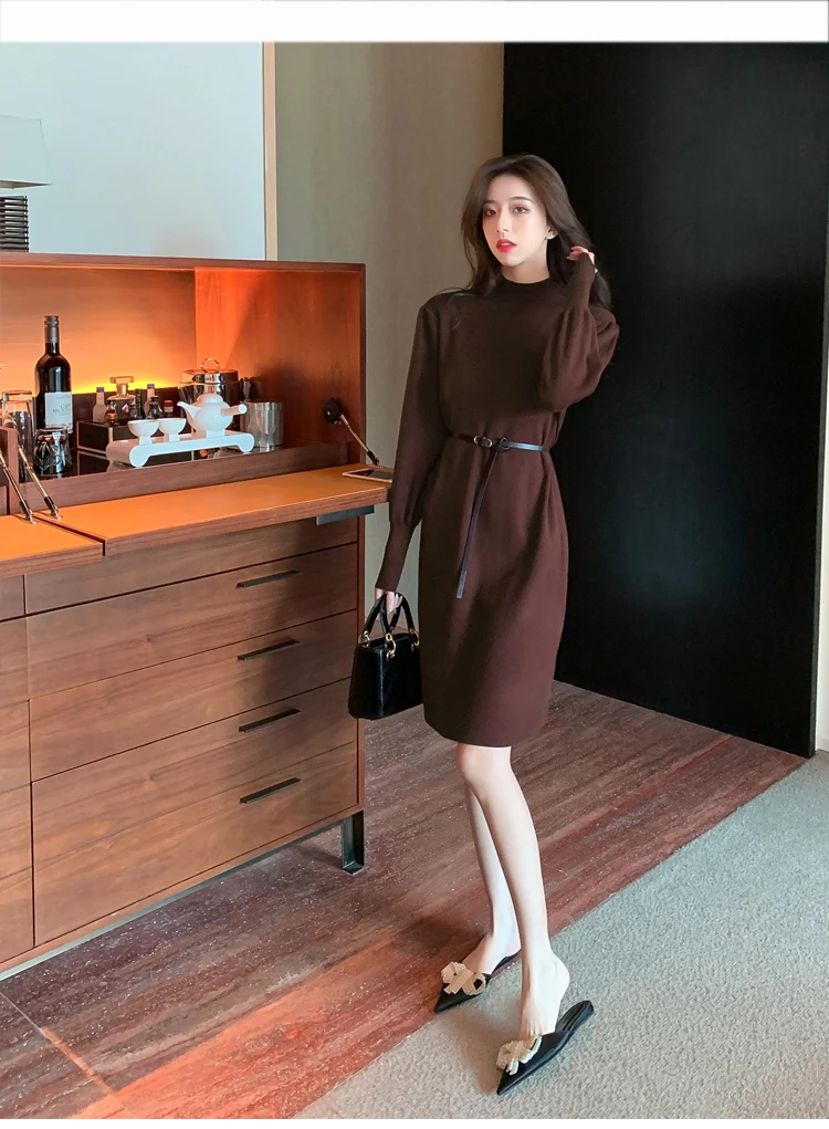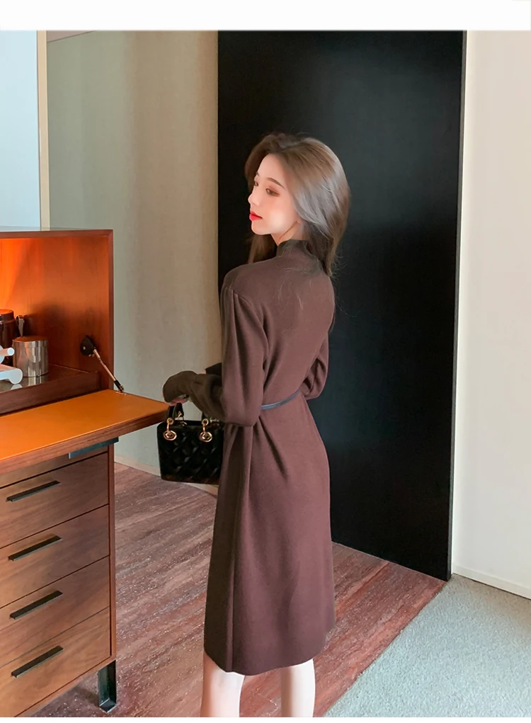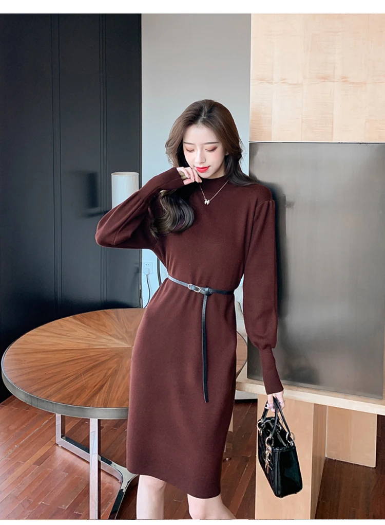 Elegant Women's Dresses for Party 2022 Autumn Winter Female Clothing Solid Dresses Woman with Belt OL Lantern Sleeve Knit Dress