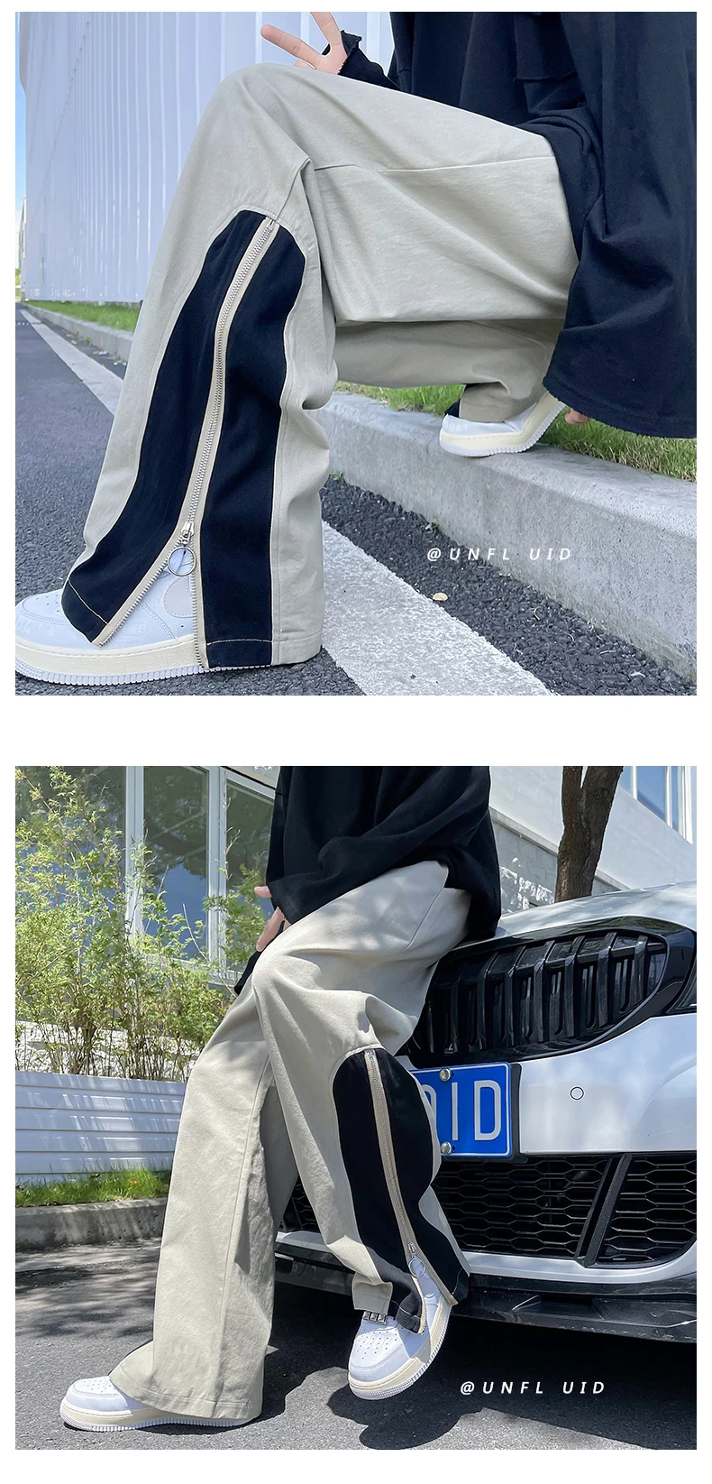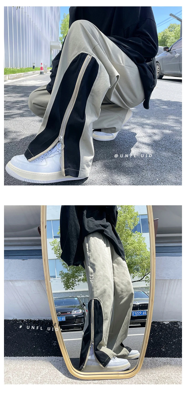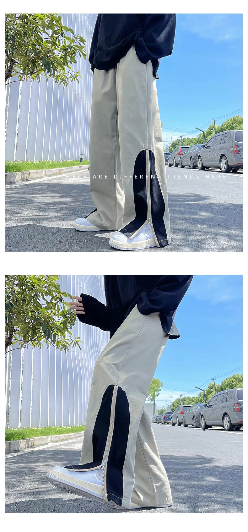 Fashion Side Zipper Casual Wide Leg Pants Khaki/Black Men 2022 Spring Streetwear Loose Straight Pant Mens Patchwork Trousers