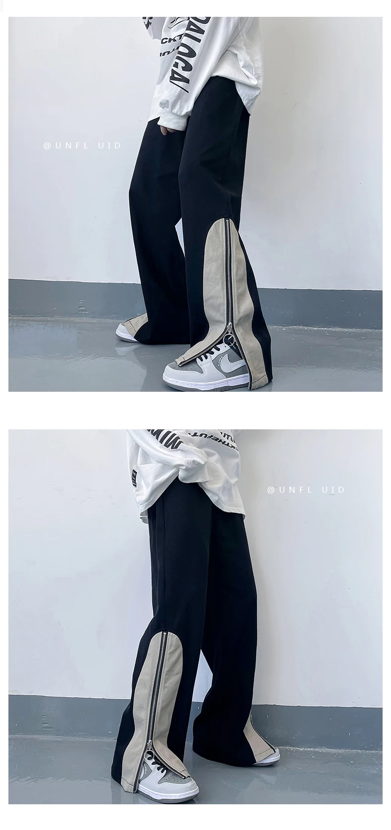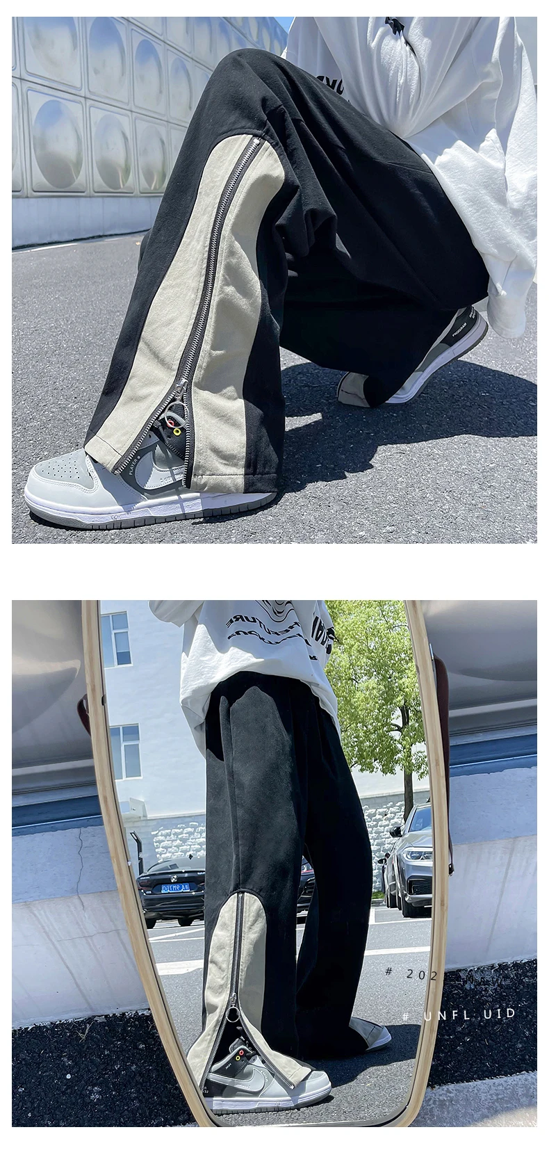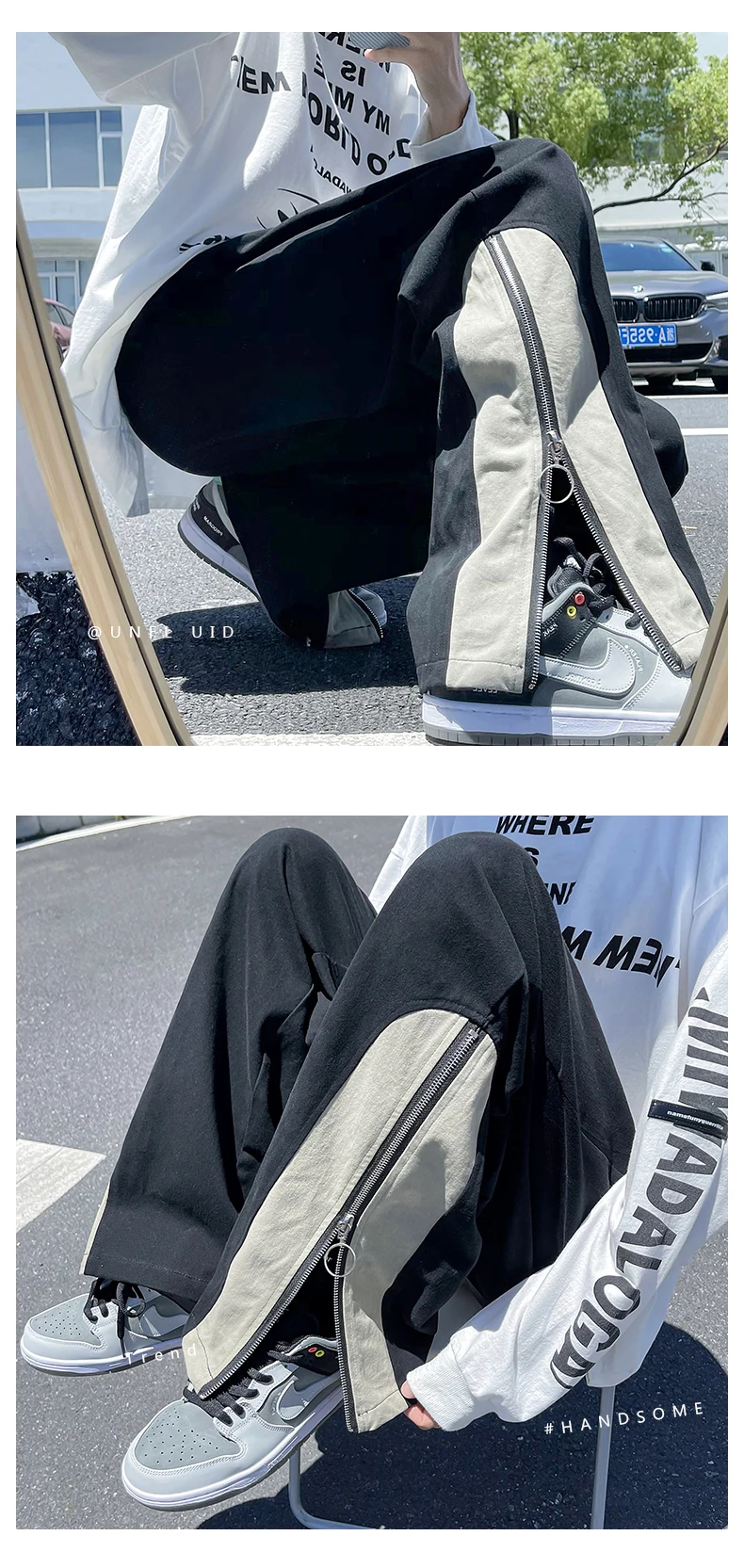Fashion Side Zipper Casual Wide Leg Pants Khaki/Black Men 2022 Spring Streetwear Loose Straight Pant Mens Patchwork Trousers