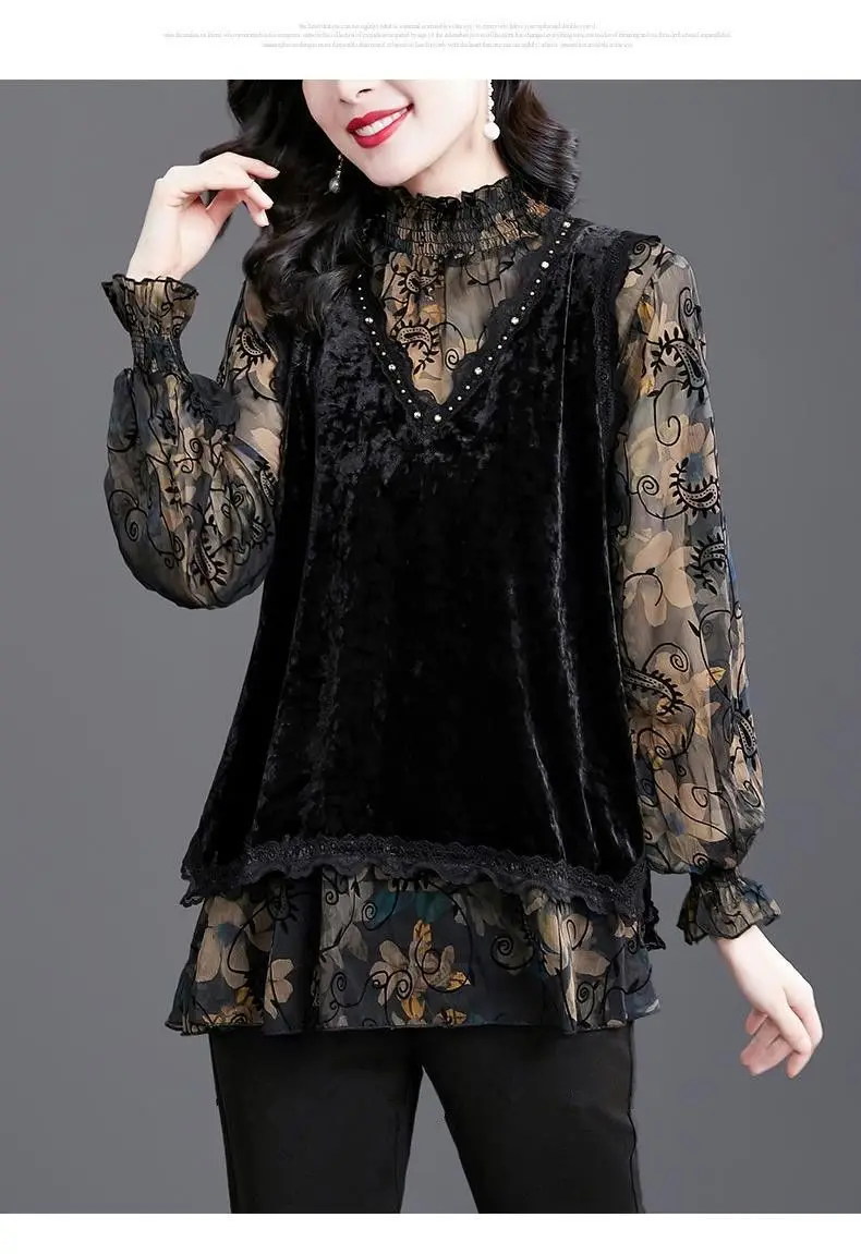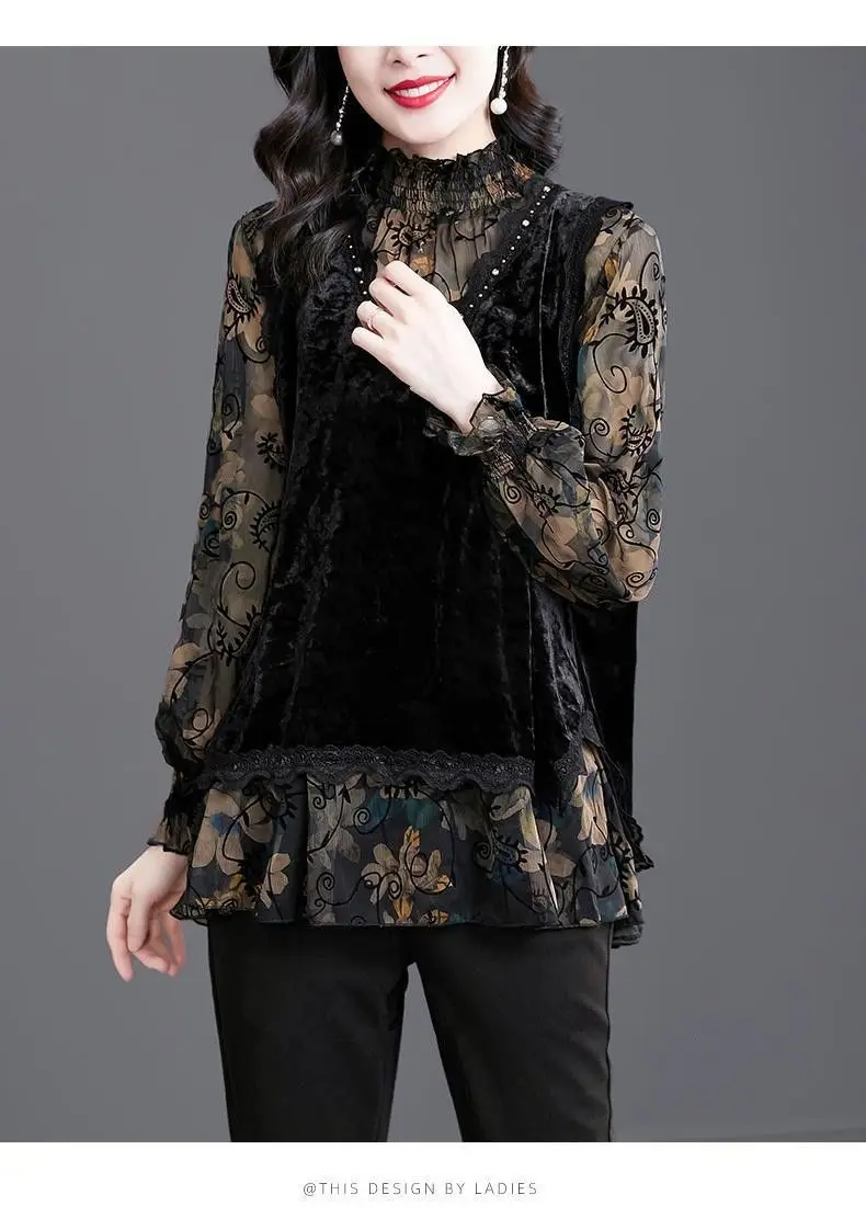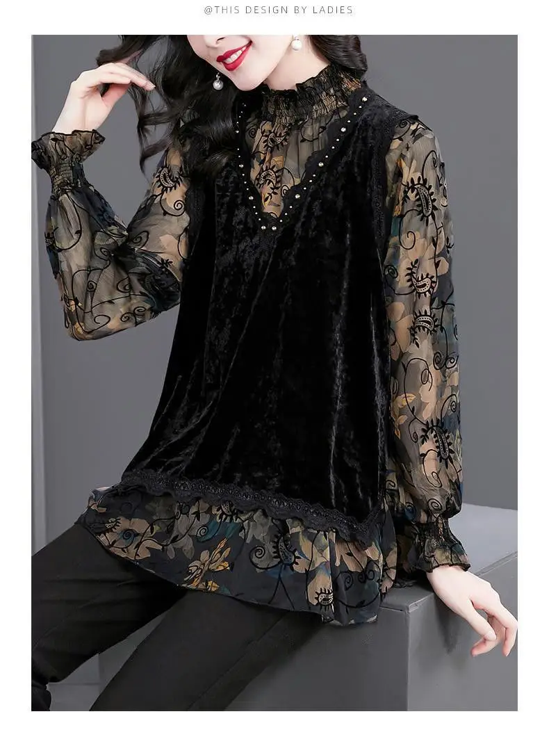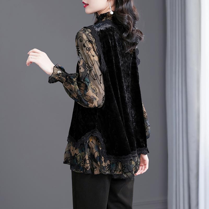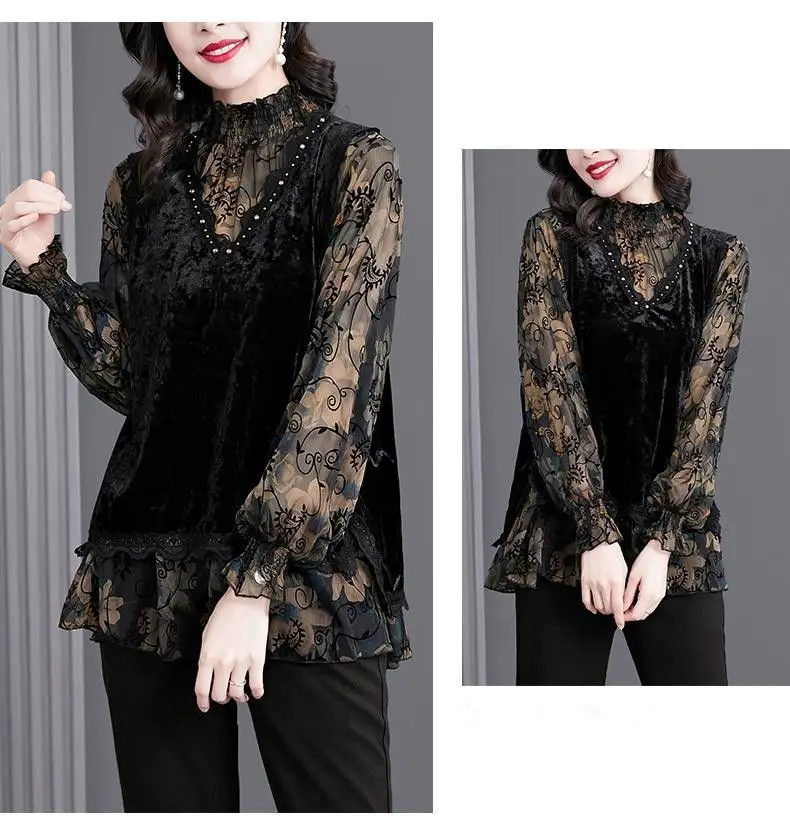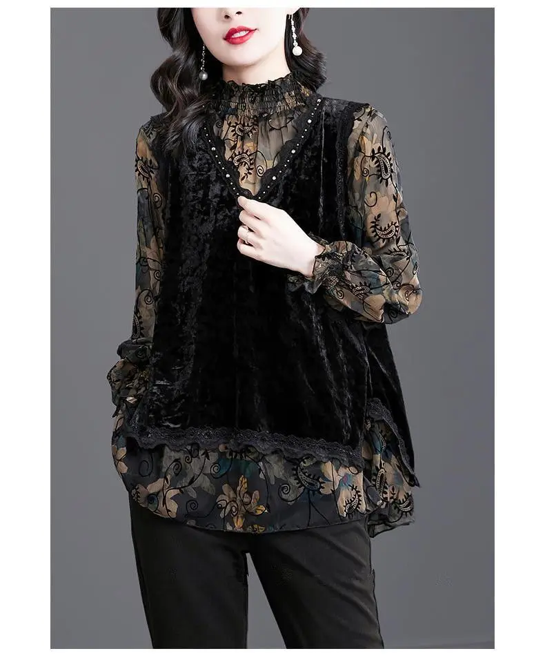 Fold Edible Fungus Lace Vintage Women Blouse Half High Neck Velvet Chiffon Spliced Floral Flare Sleeve Fake Two Pieces Straight