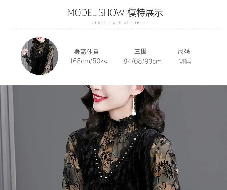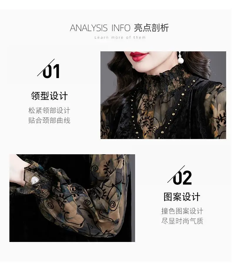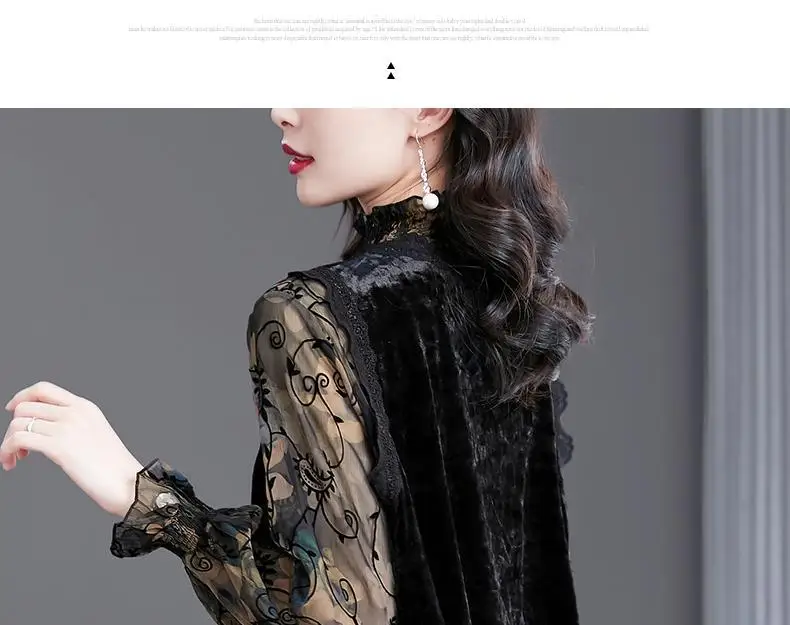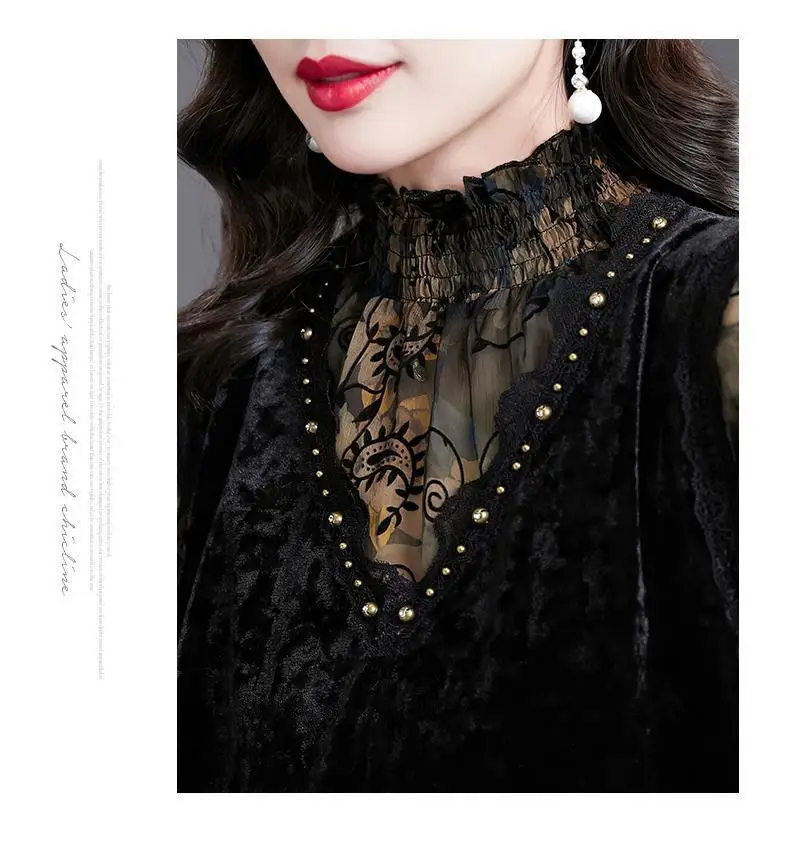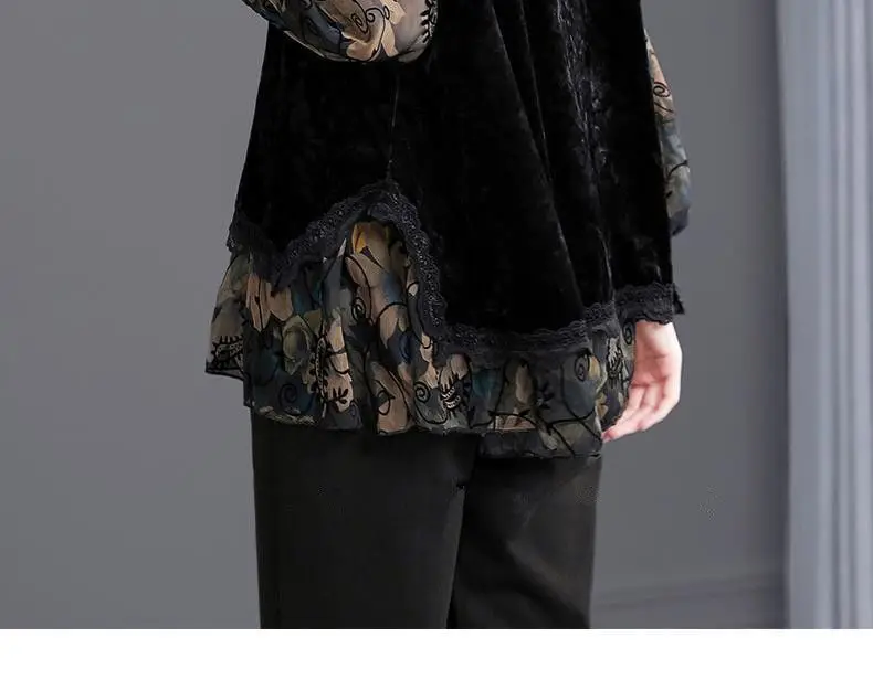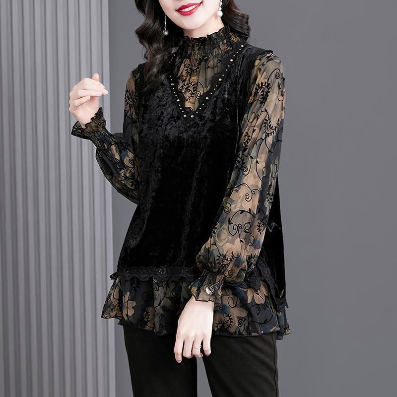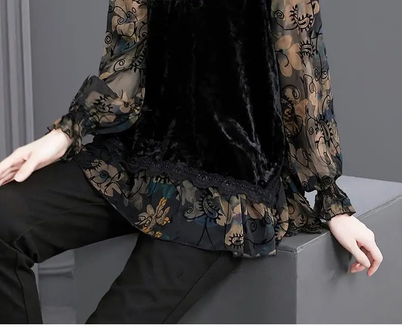 Fold Edible Fungus Lace Vintage Women Blouse Half High Neck Velvet Chiffon Spliced Floral Flare Sleeve Fake Two Pieces Straight