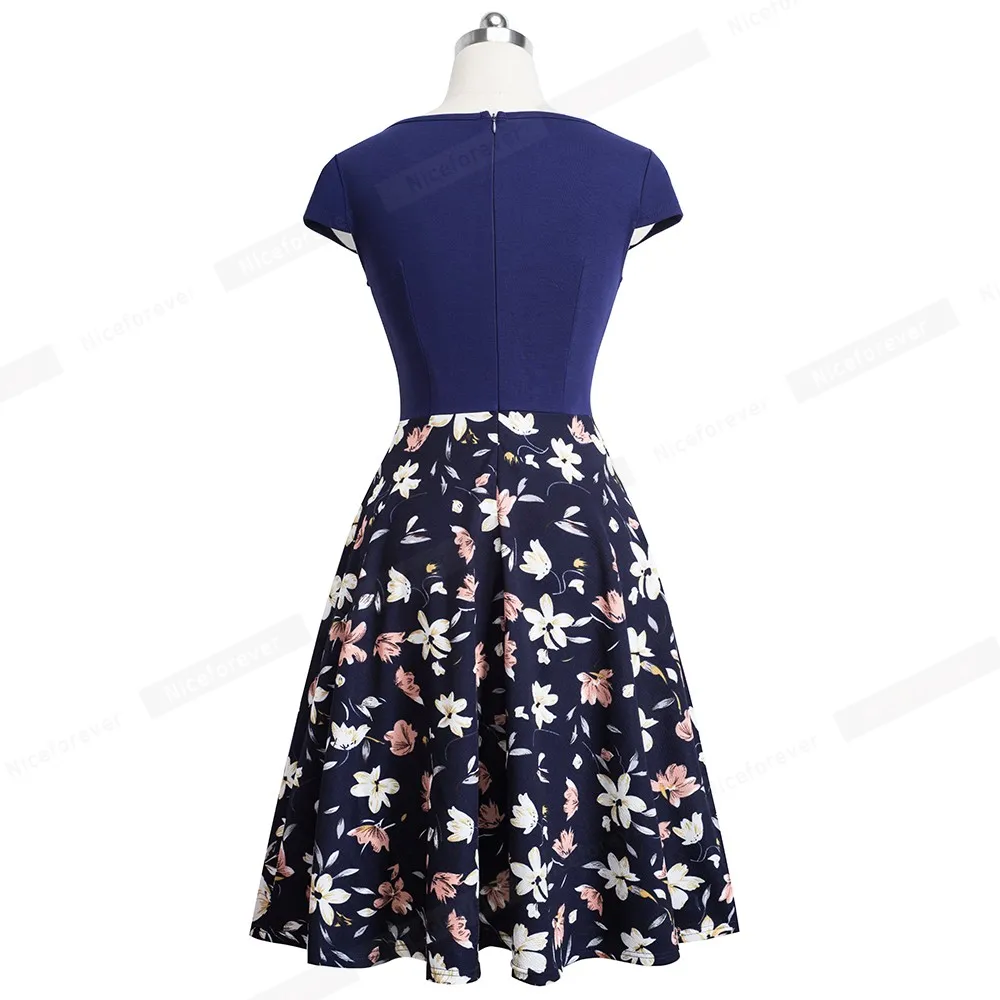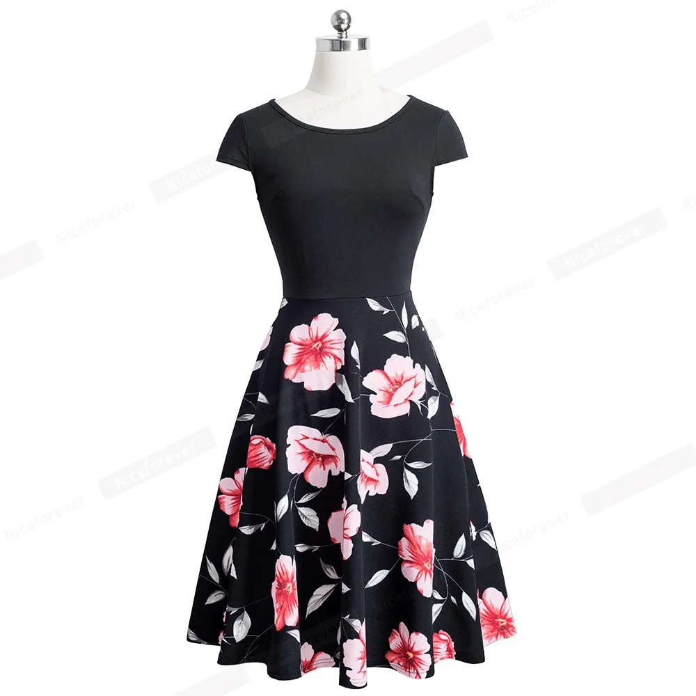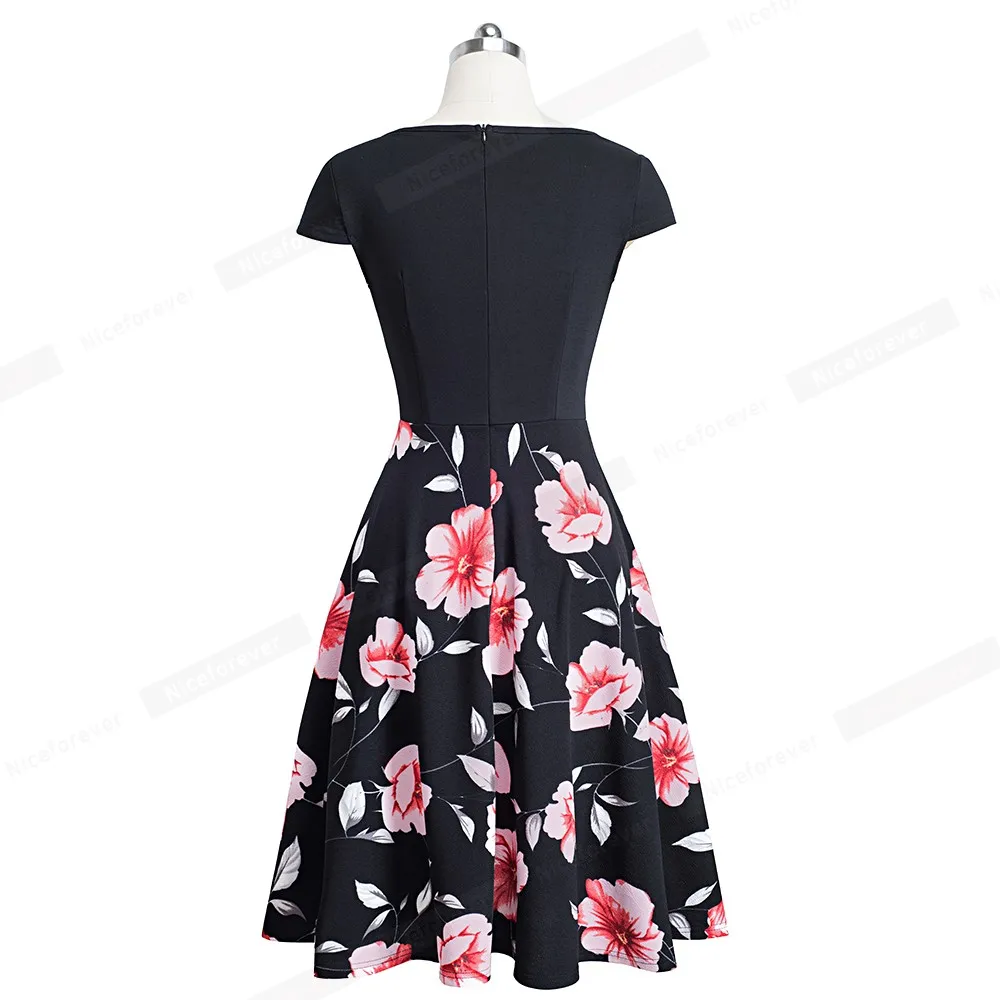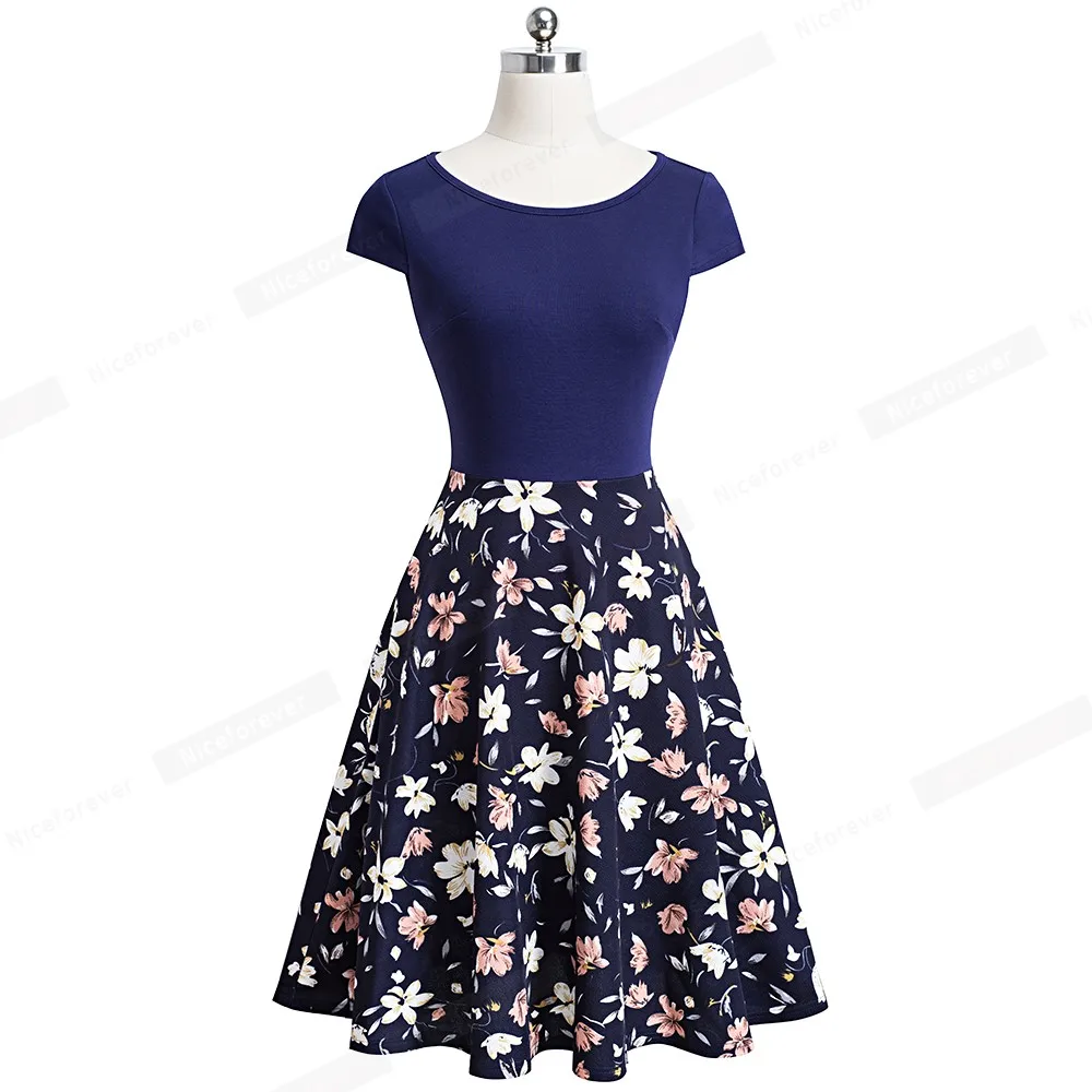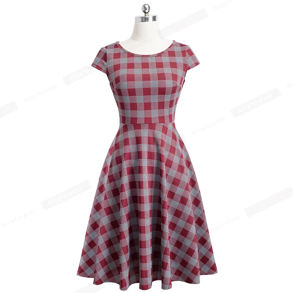 Nice-forever Retro 1950's Floral and Gird Printed O Neck vestidos A-Line Female Flare Party Women Summer Dress btyA009