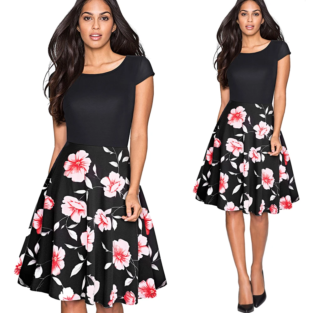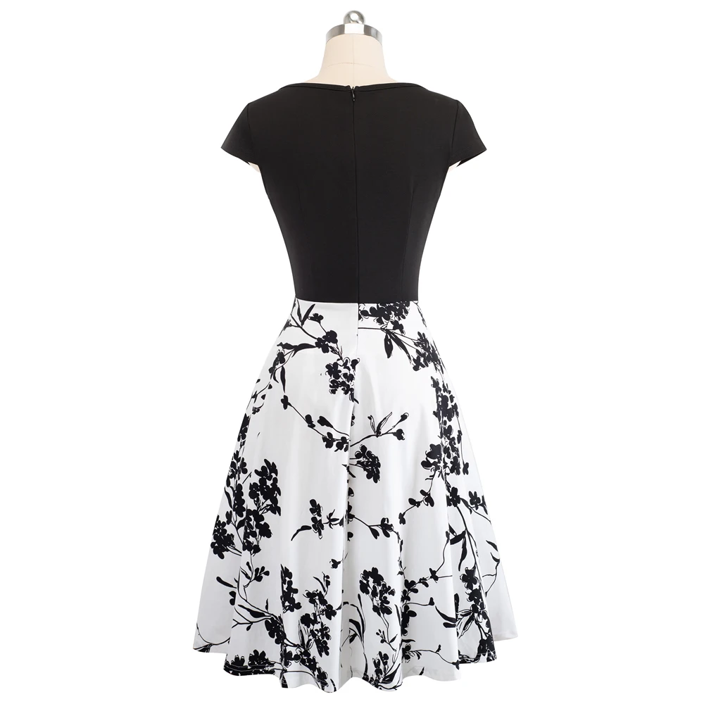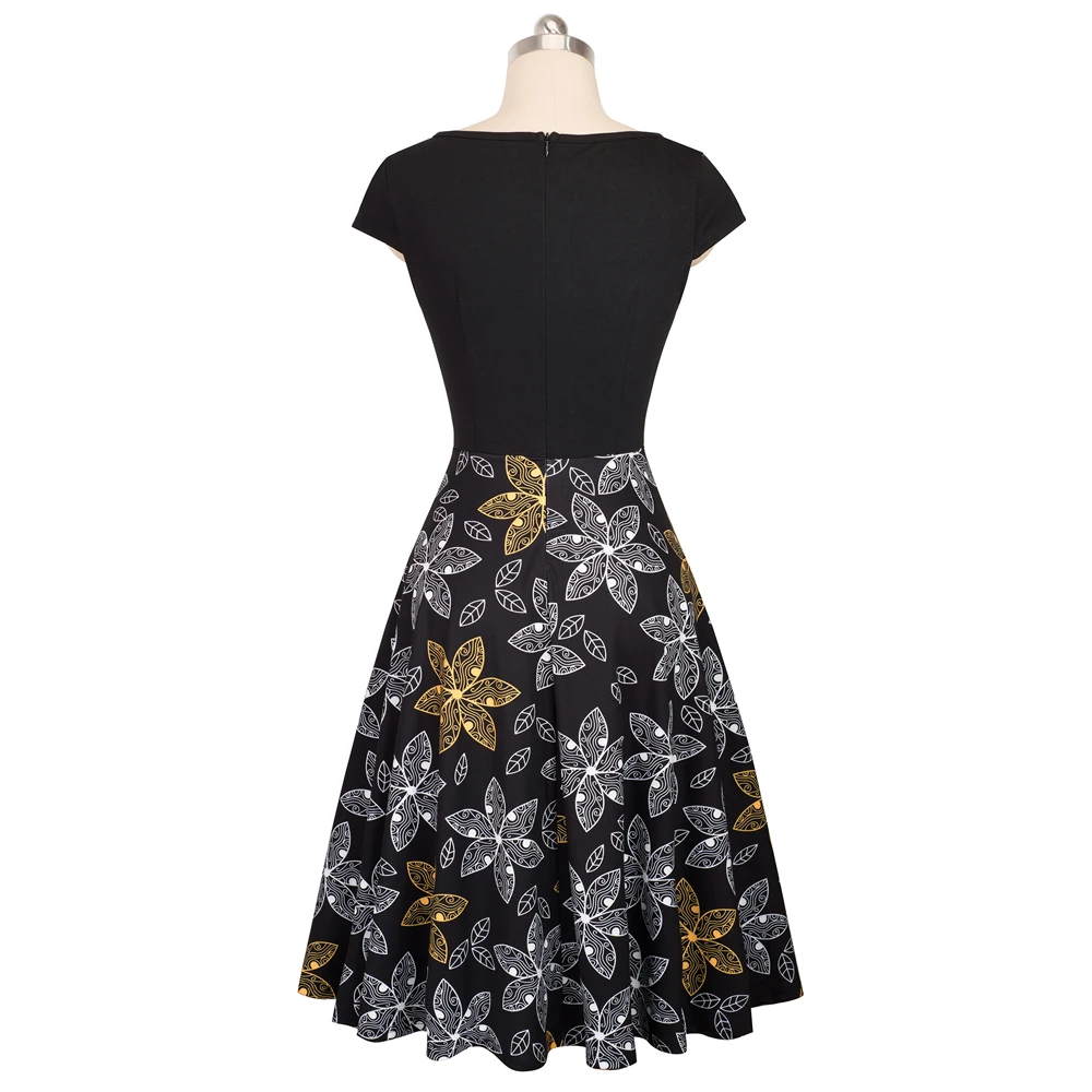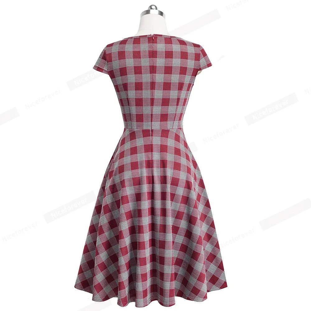 Nice-forever Retro 1950's Floral and Gird Printed O Neck vestidos A-Line Female Flare Party Women Summer Dress btyA009