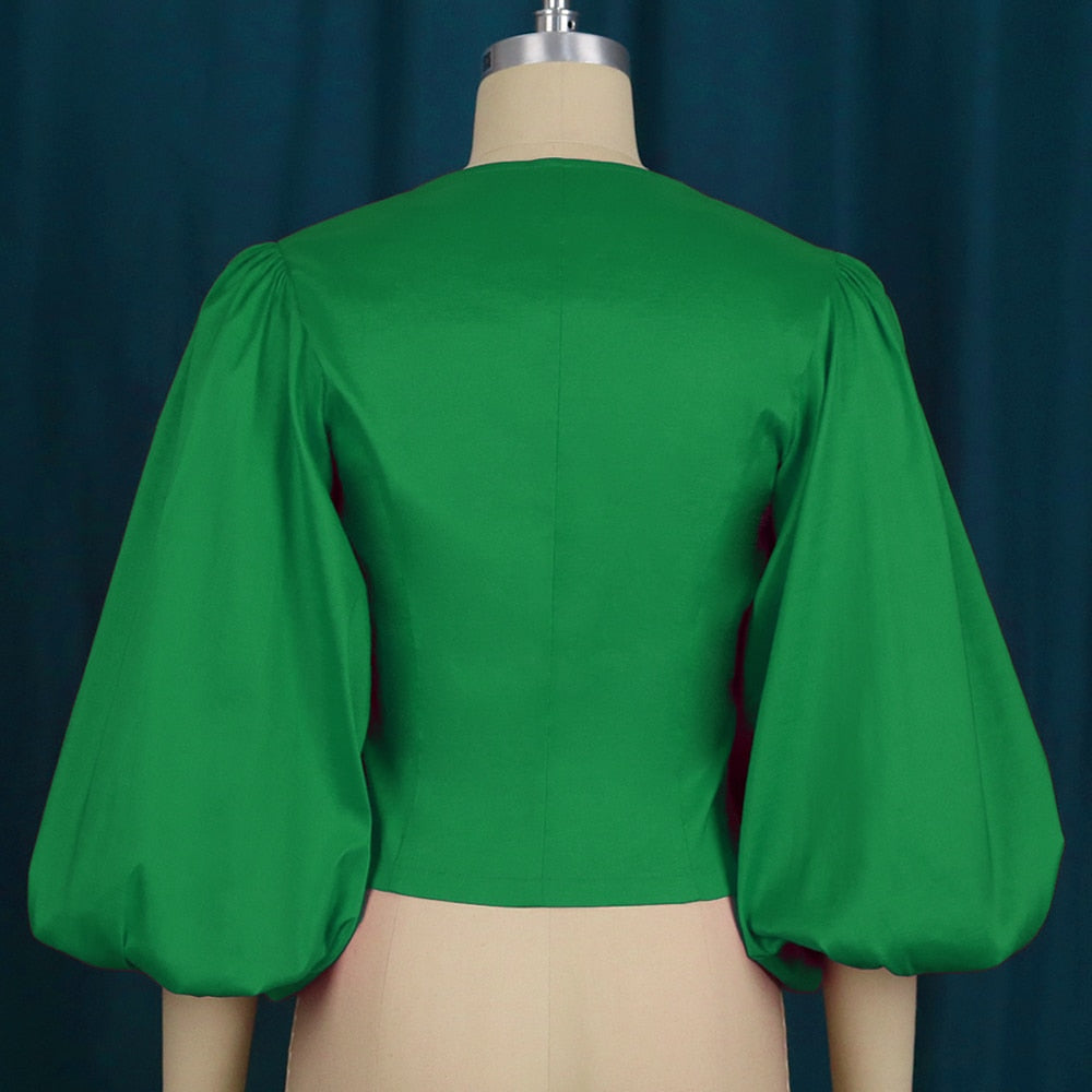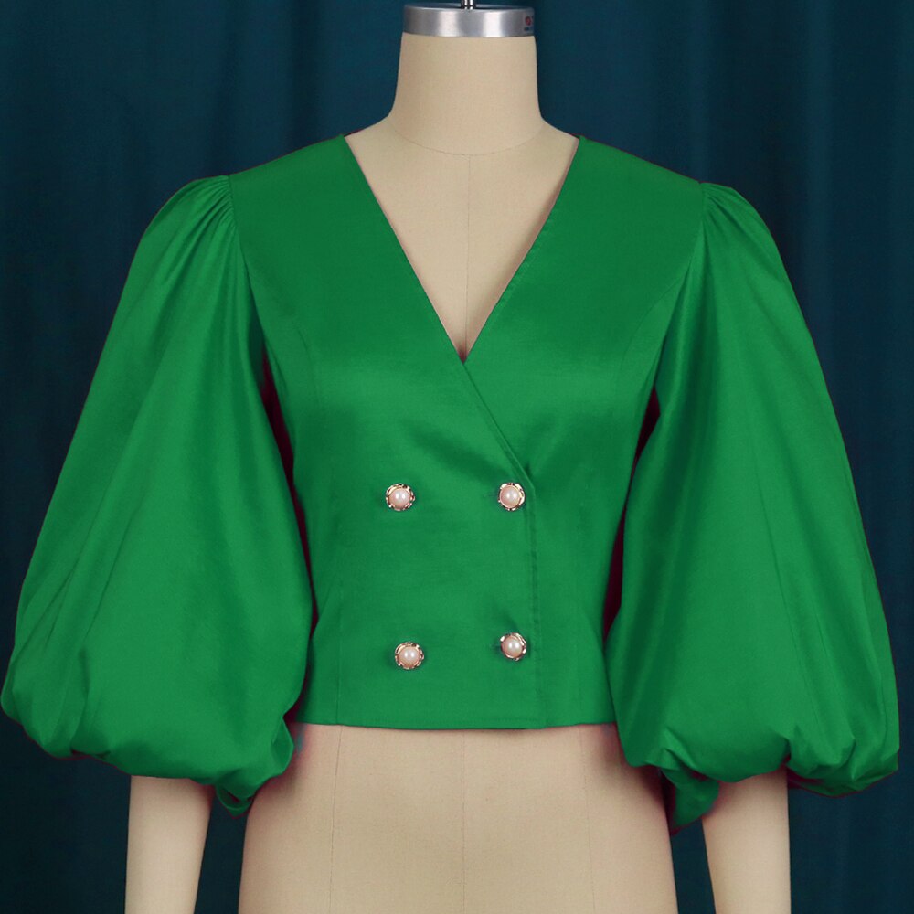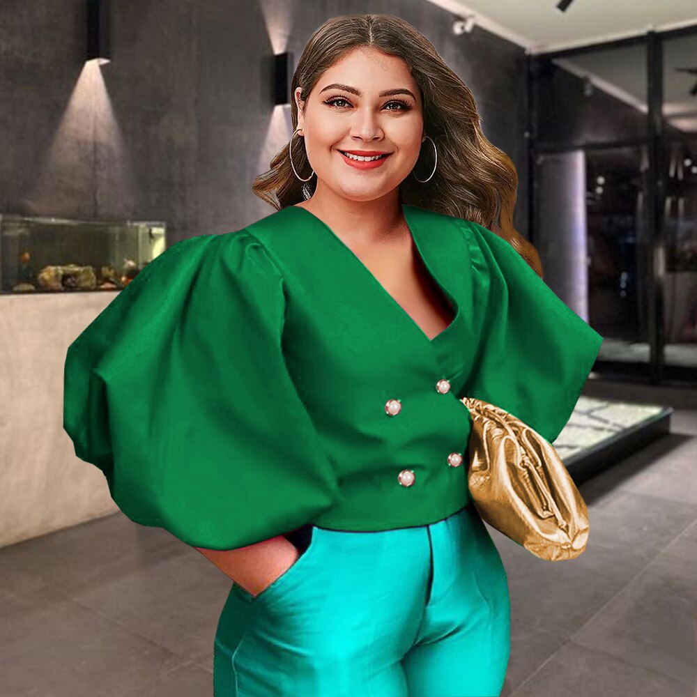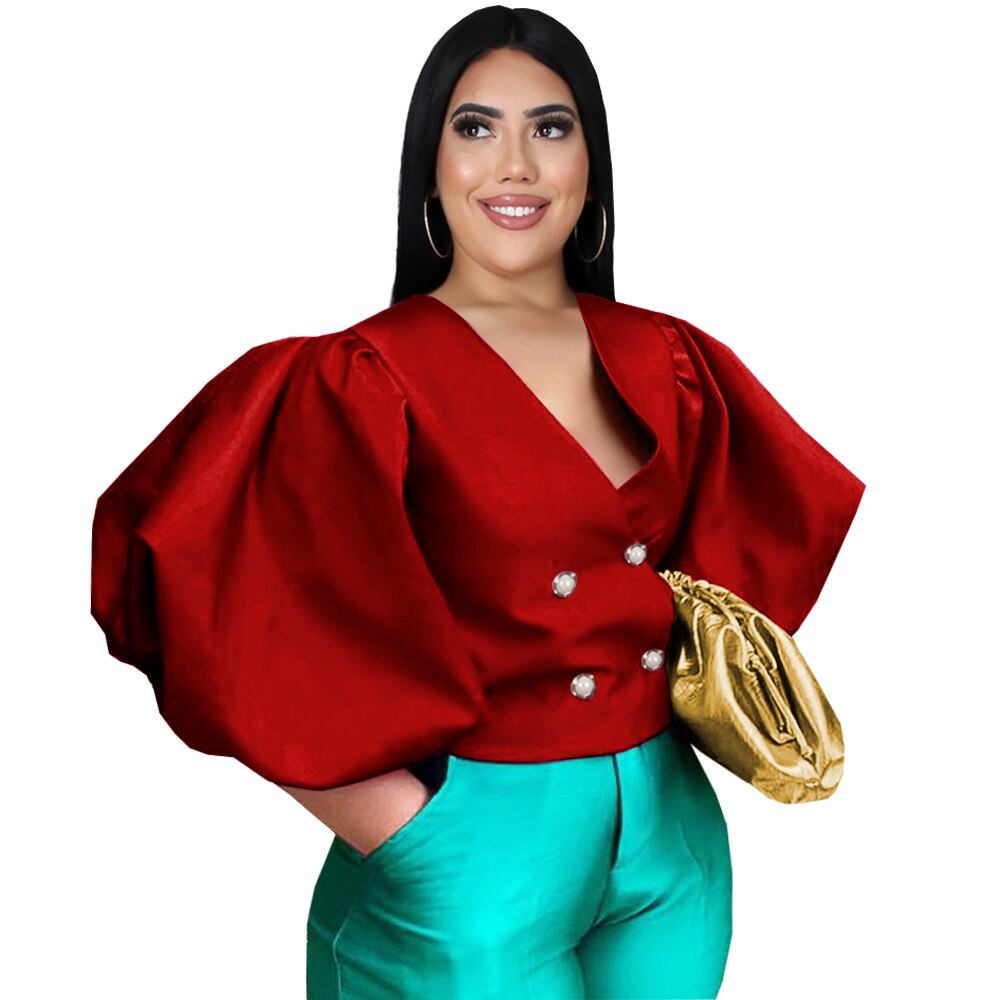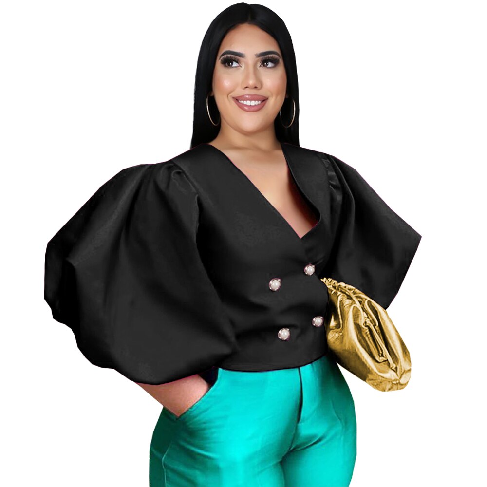 Plus Size Sexy V Neck Women Tops Blouse Long Lantern Sleeves Double ButtonsShiny Glitter Party Classy Shirts for Ladies 2022