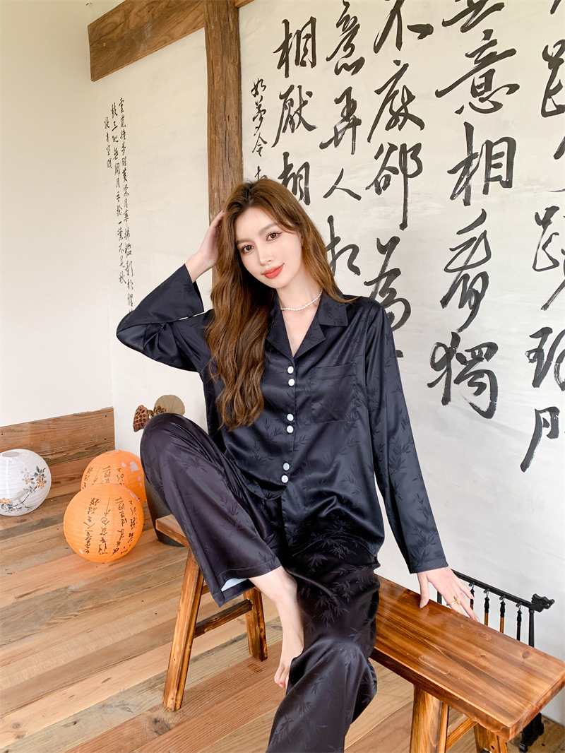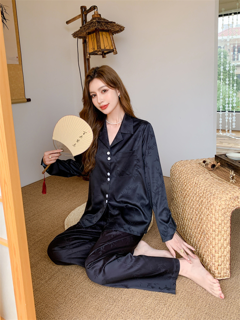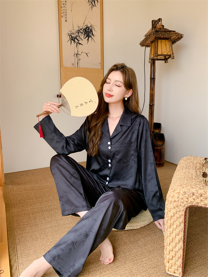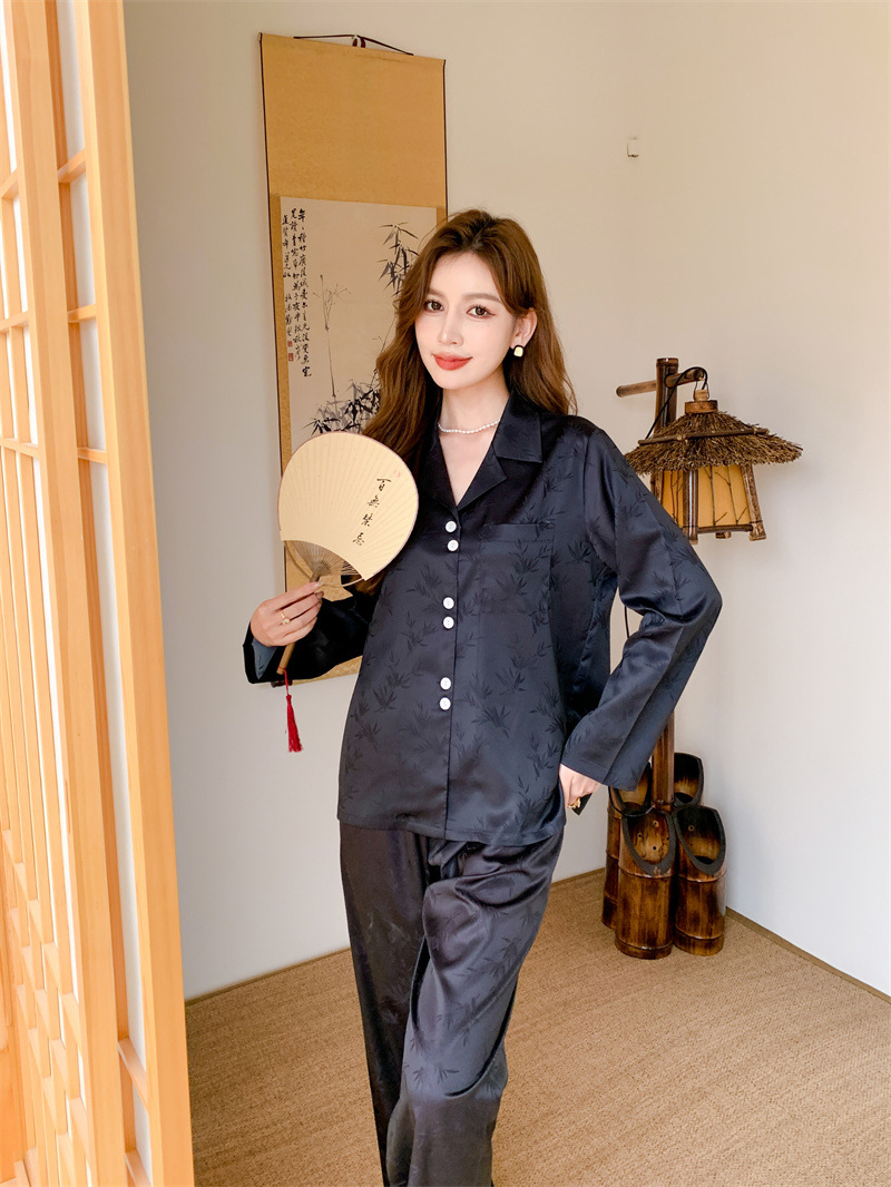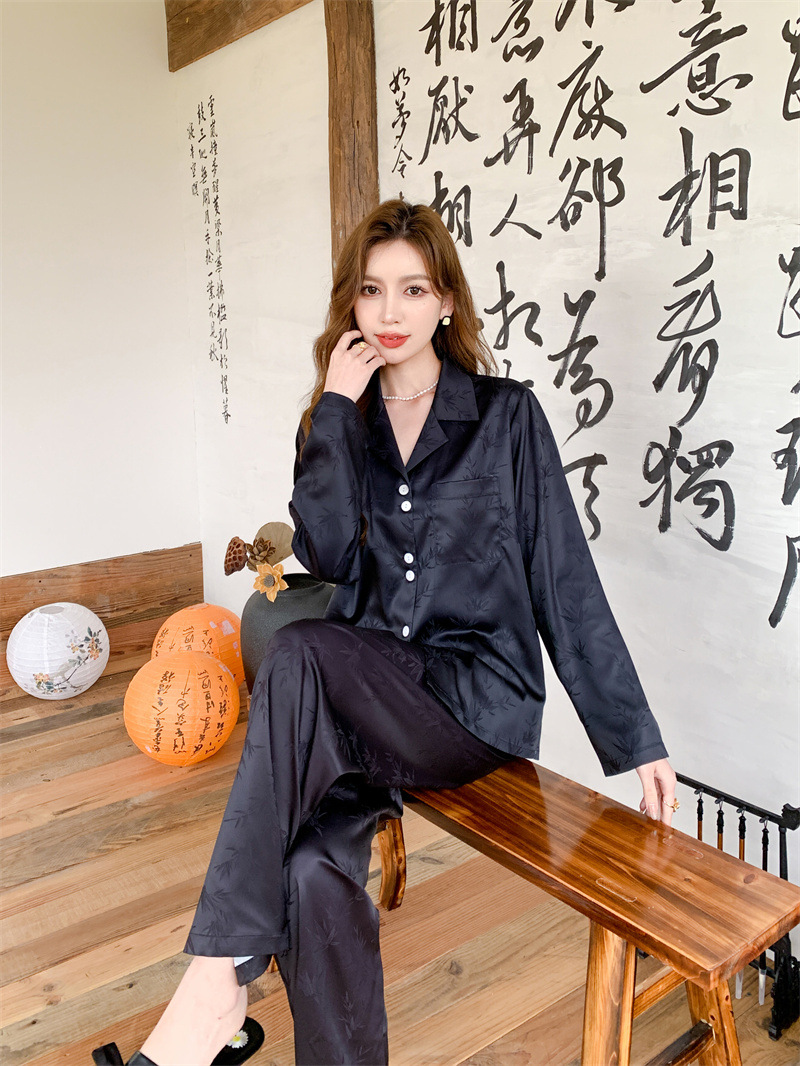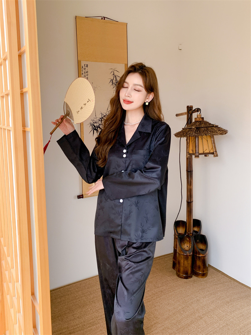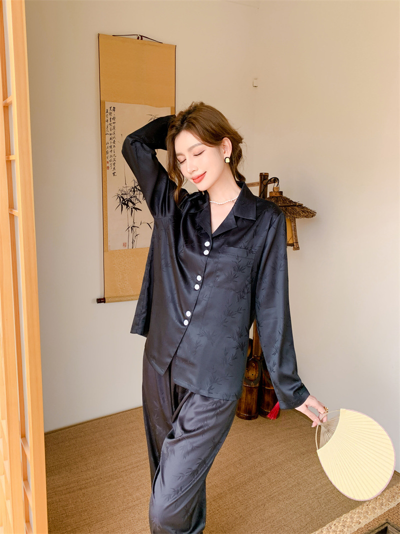 QSROCIO Women's Pajamas Spring Summer Imitation Silk Bamboo Leaf Jacquard Long-sleeved Trousers Cardigan Suit Home Clothes