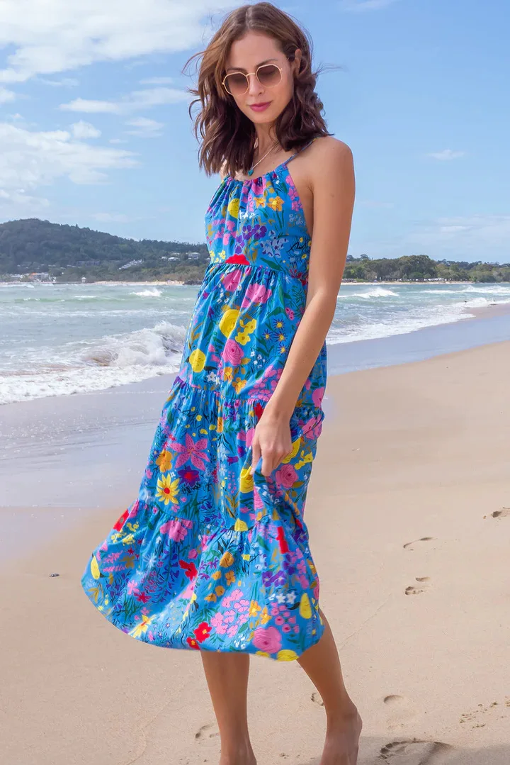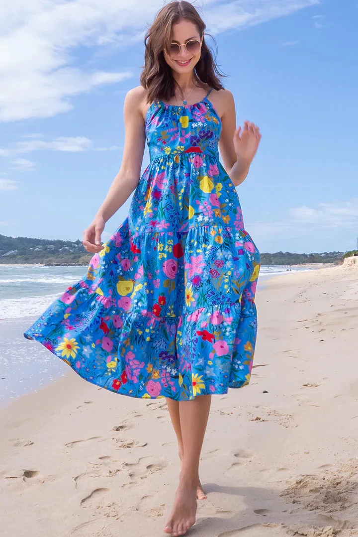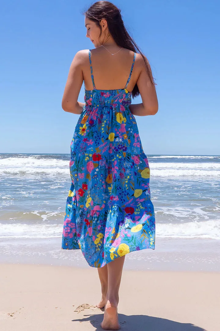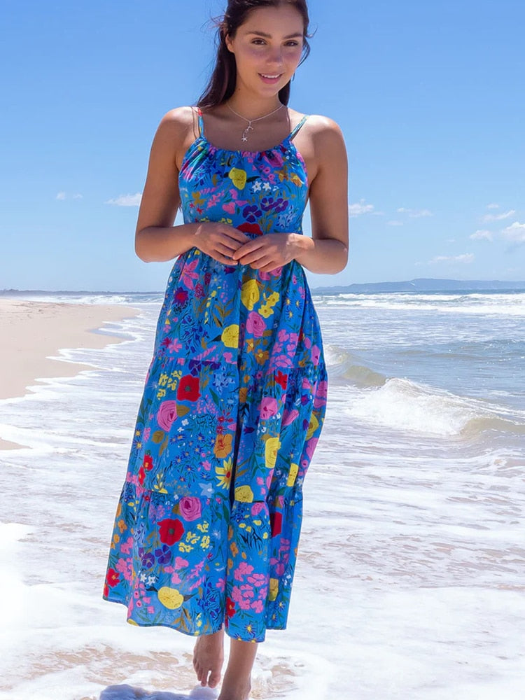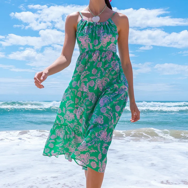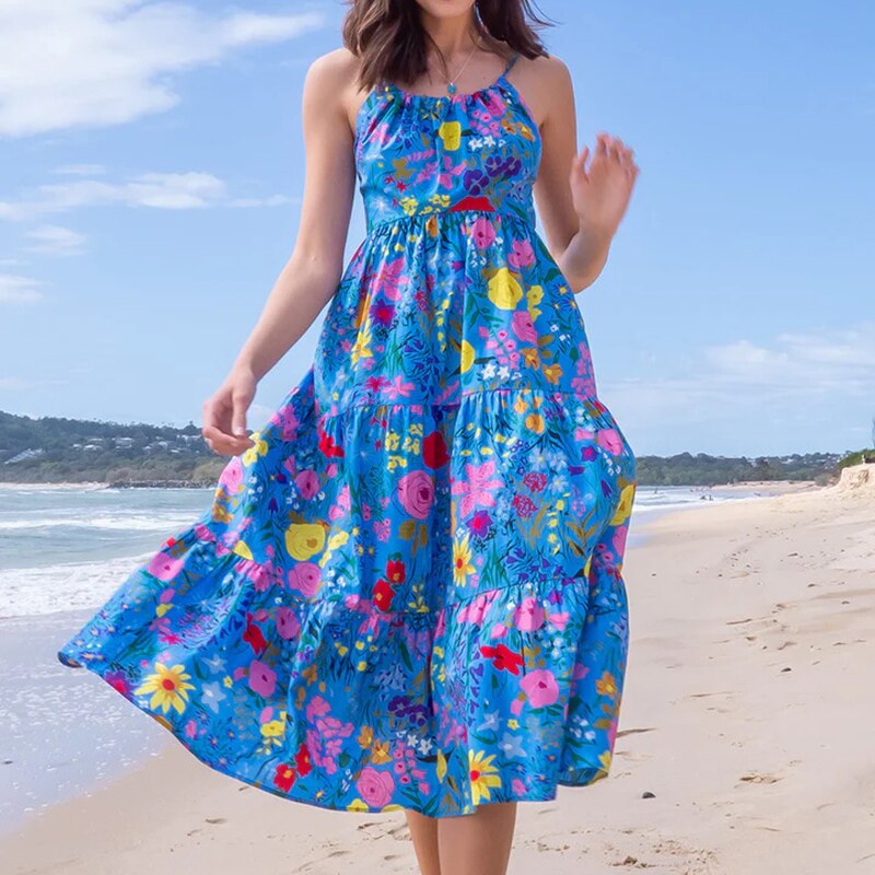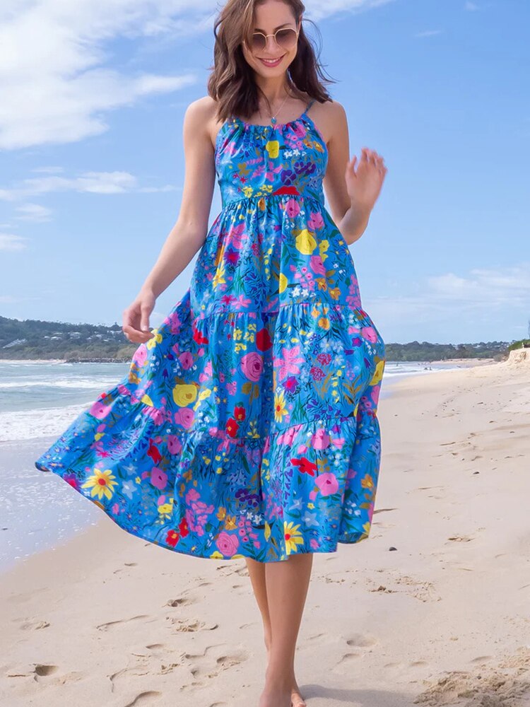 Sexy Floral Midi Dress Women Summer Casual Blue Backless Ruffle Big Hem Beach Dress Fashion A-line Slip New In Dresses 2023