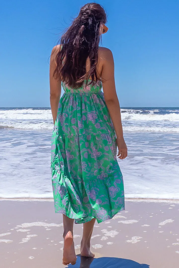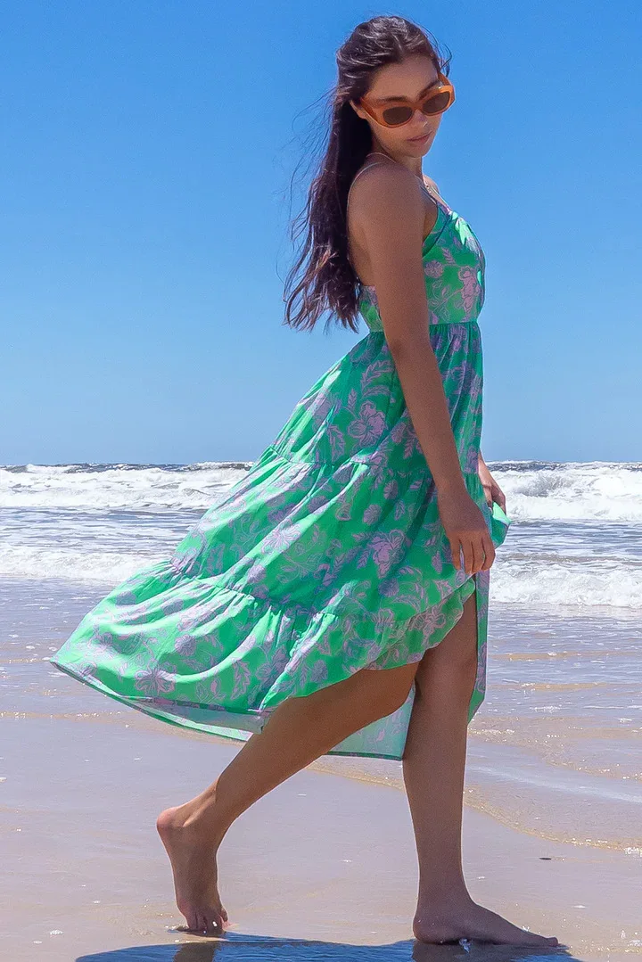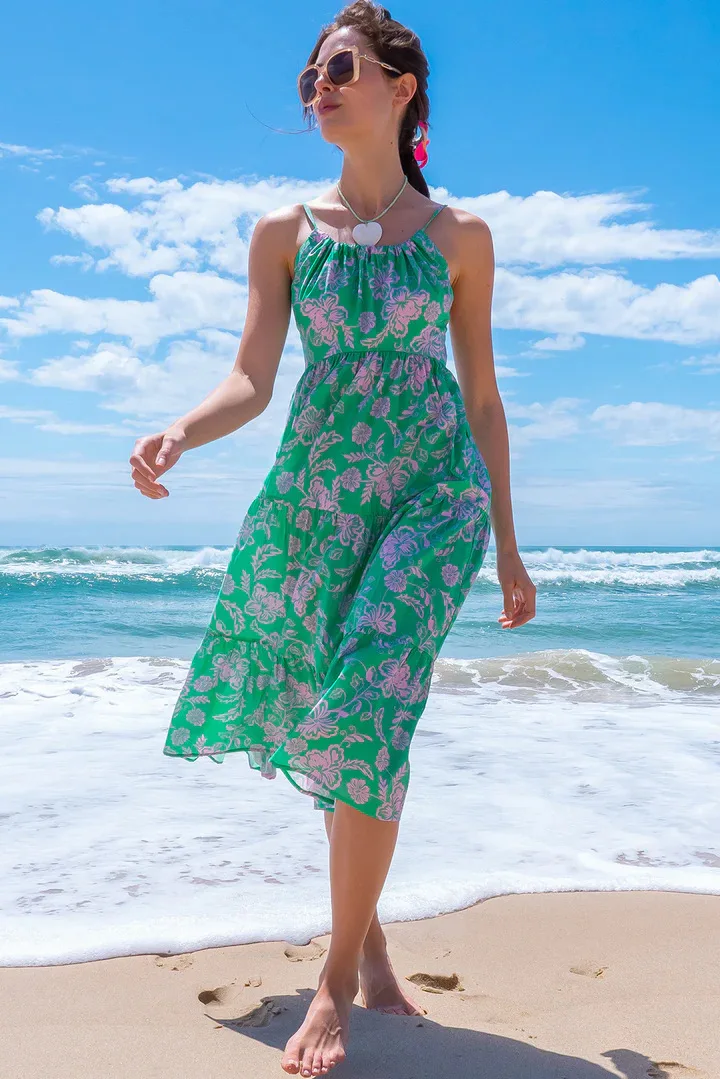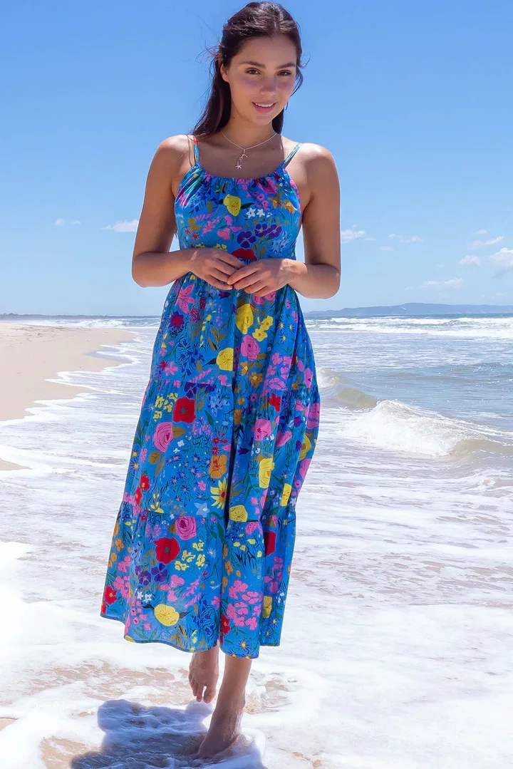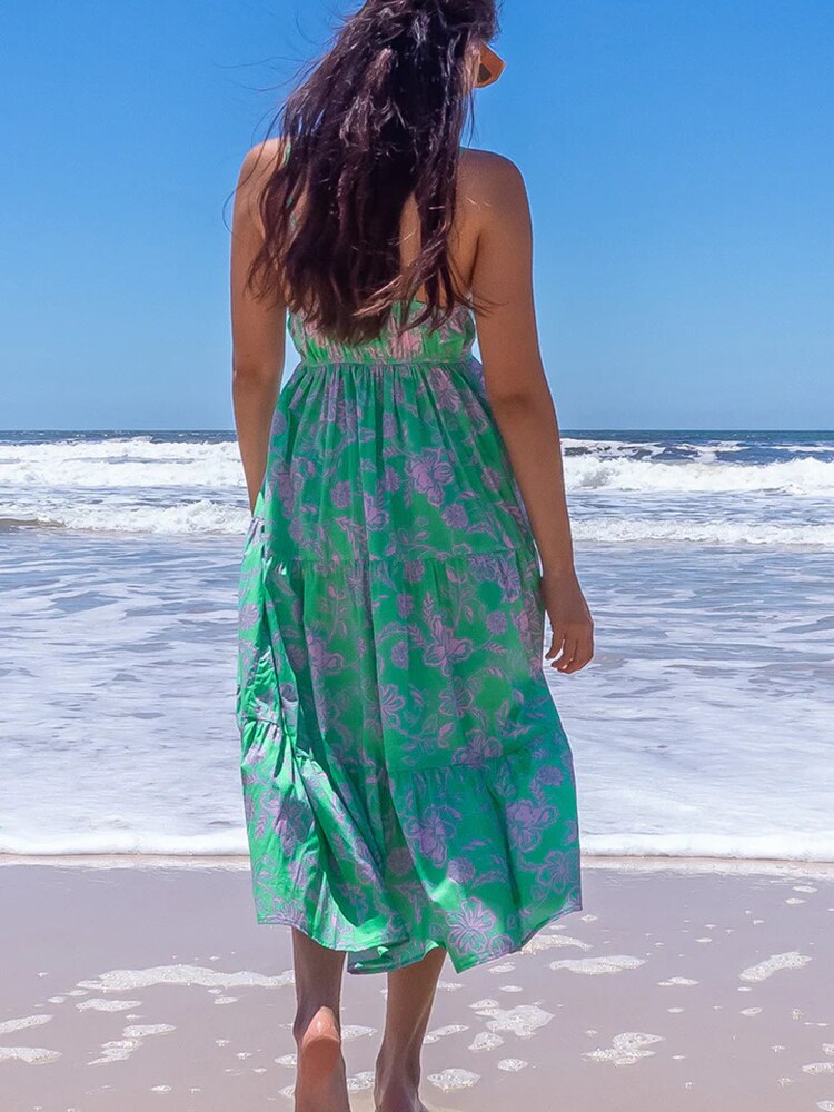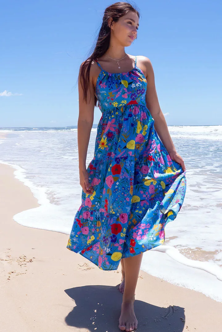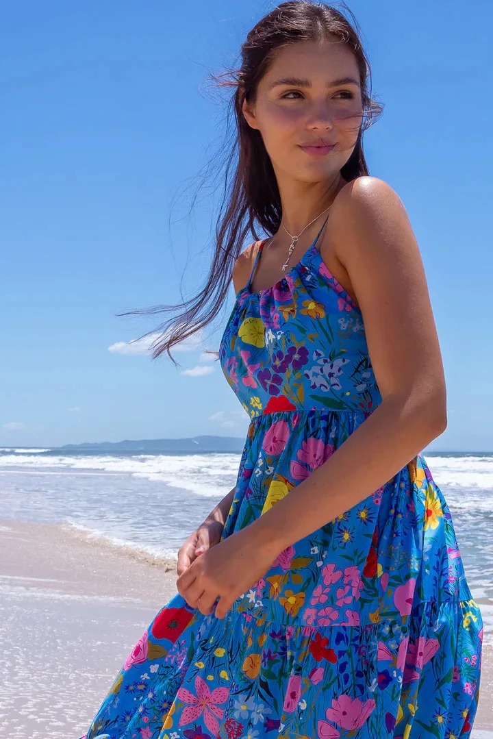Sexy Floral Midi Dress Women Summer Casual Blue Backless Ruffle Big Hem Beach Dress Fashion A-line Slip New In Dresses 2023