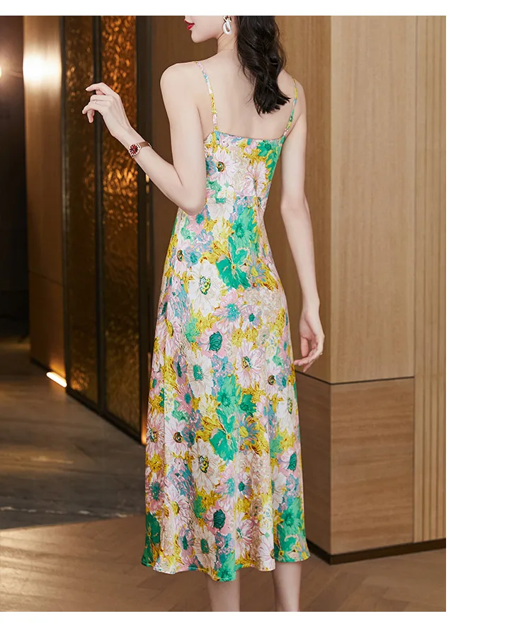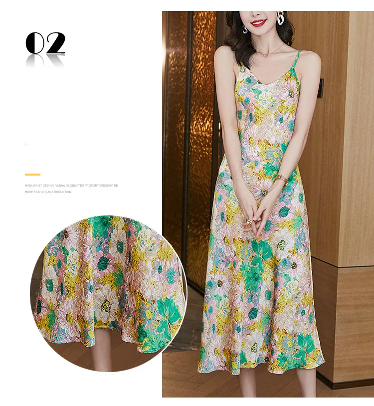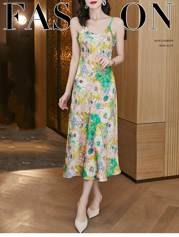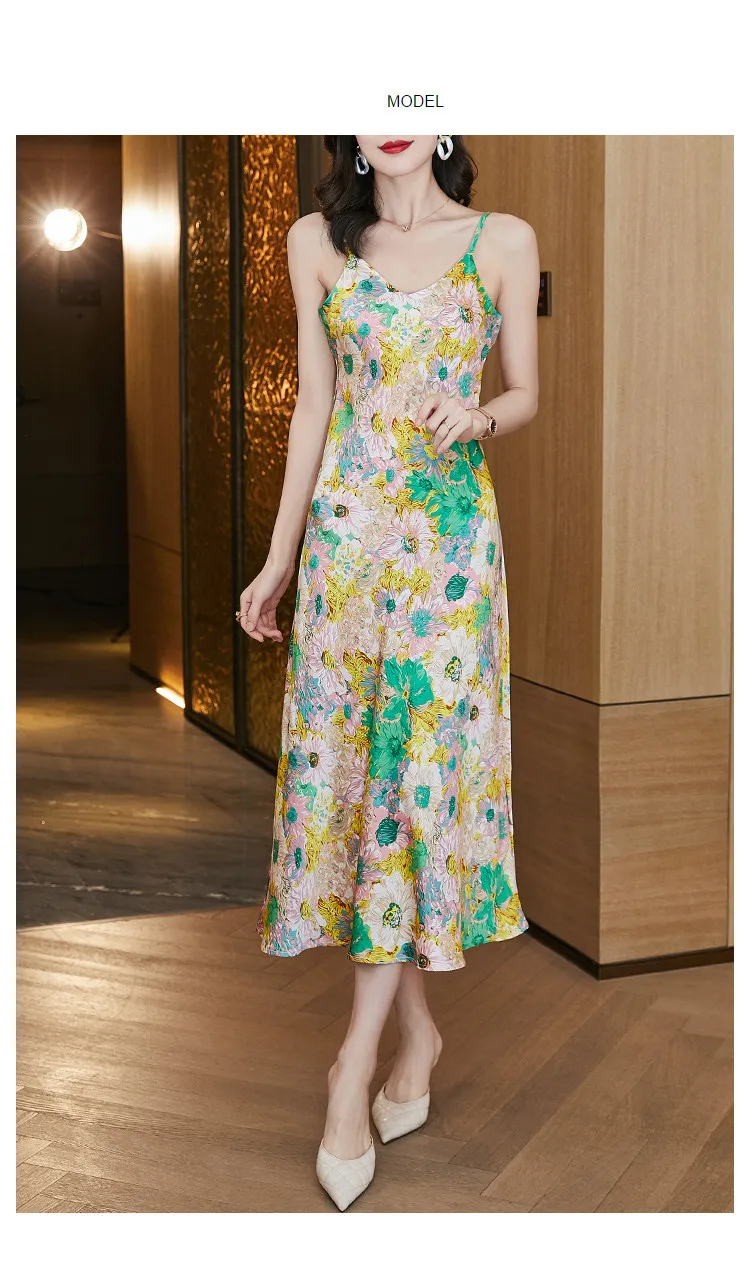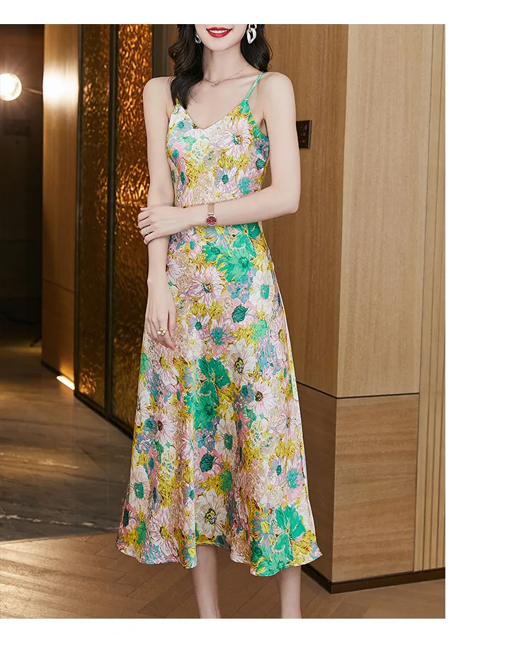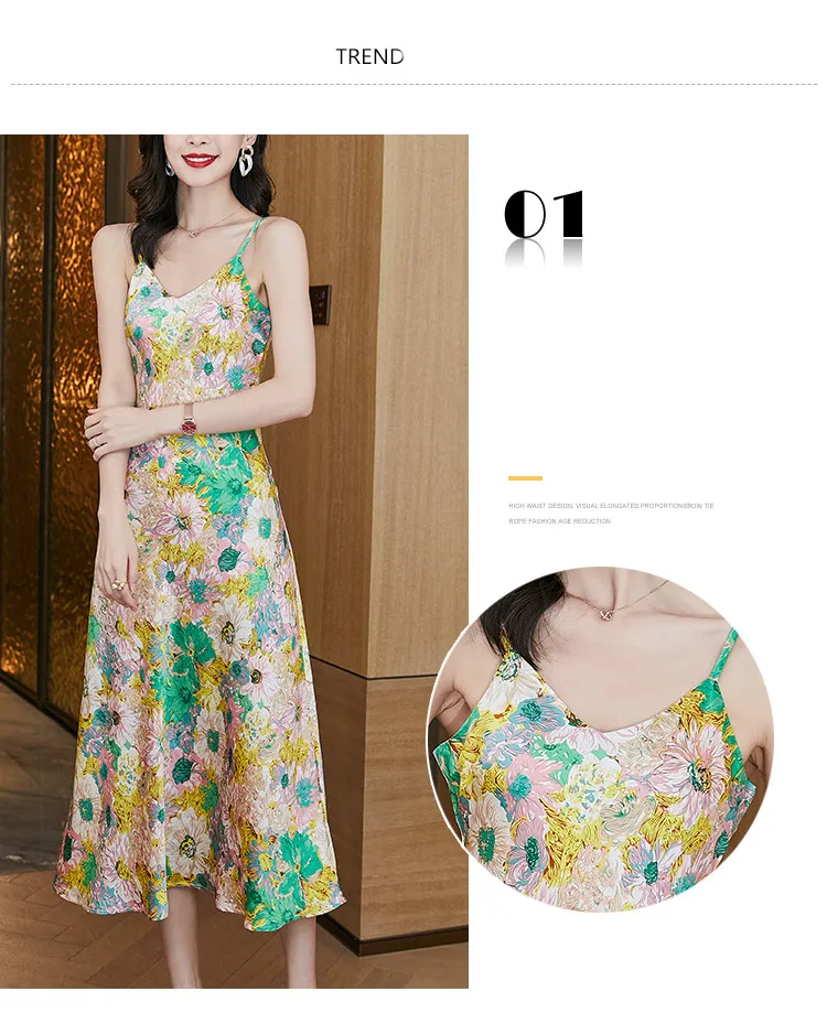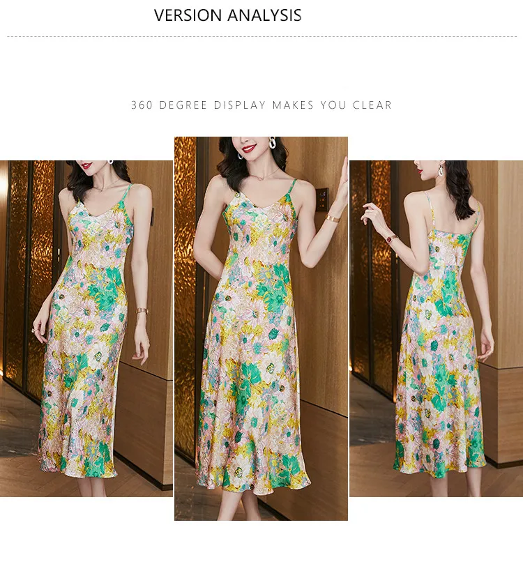 Silk Women's Summer Dress V-Neck Satin Fashion Party Dresses for Women 2022 Print A-line Backless Casual Elegant Female Clothing