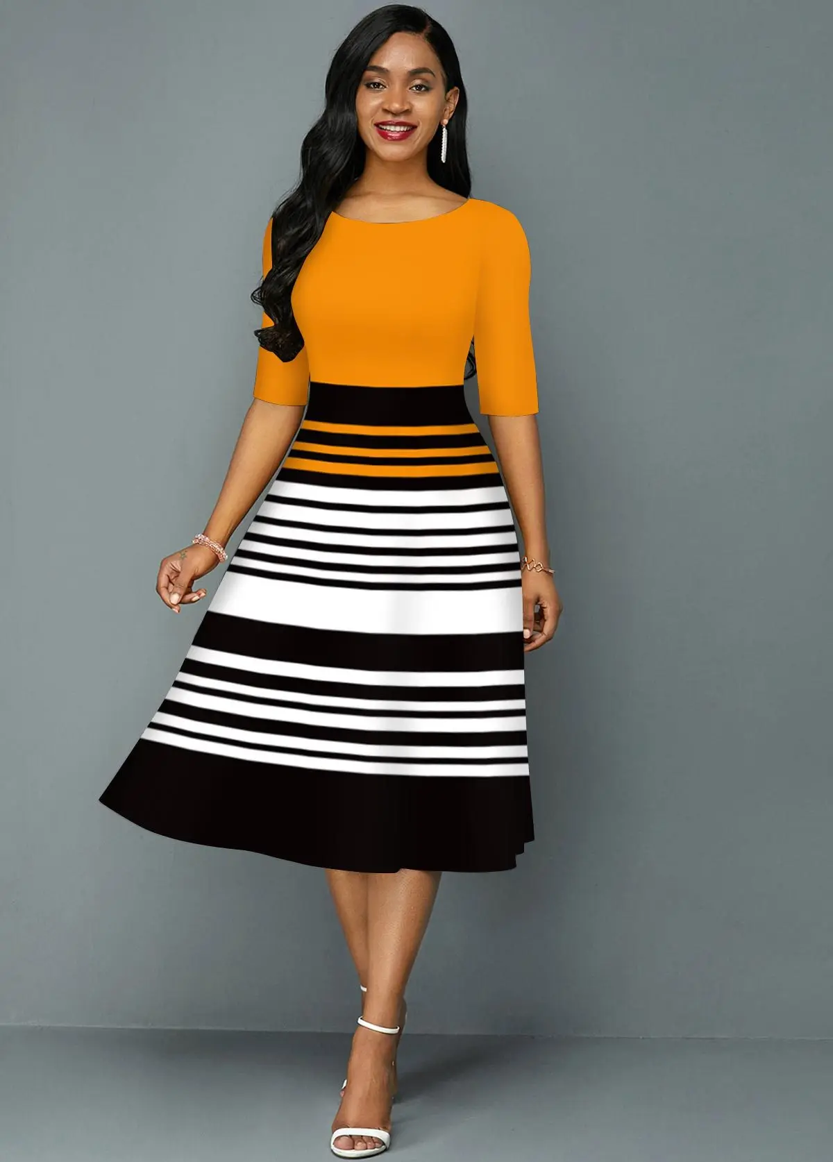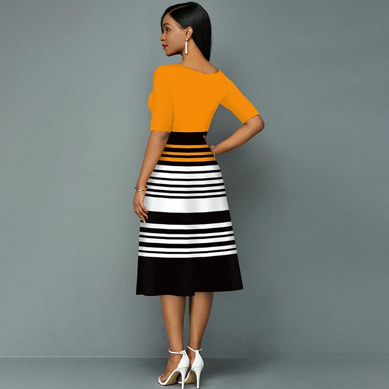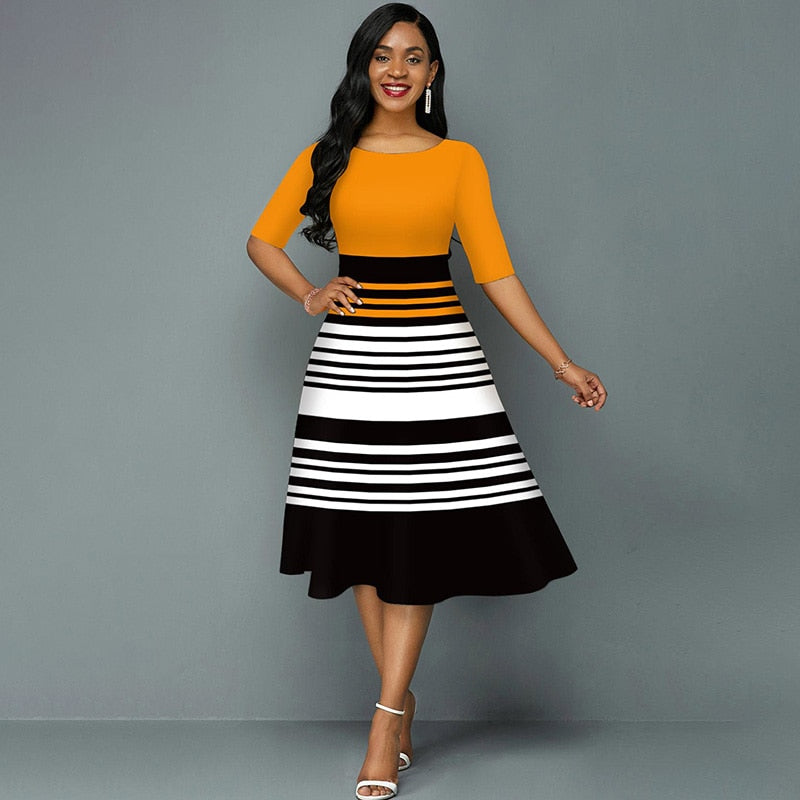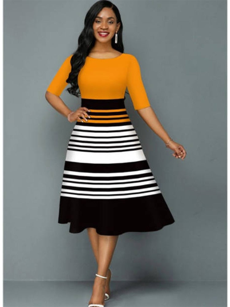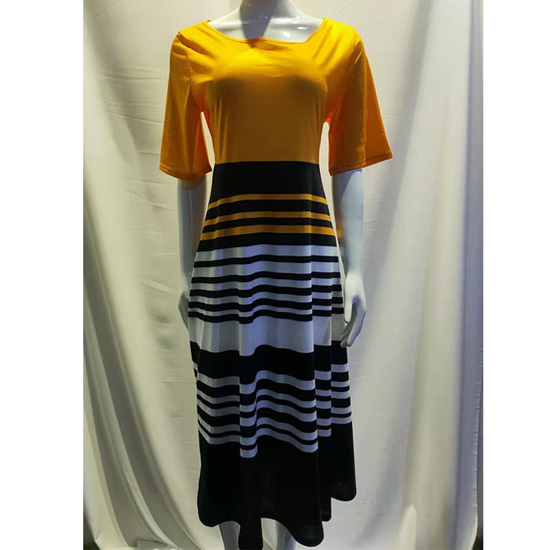 Slim Patchwork Striped Printing High Waist Half Sleeve Summer Dresses Woman 2022 Large Swing Beach Vintage Casual Midi Dress 5XL