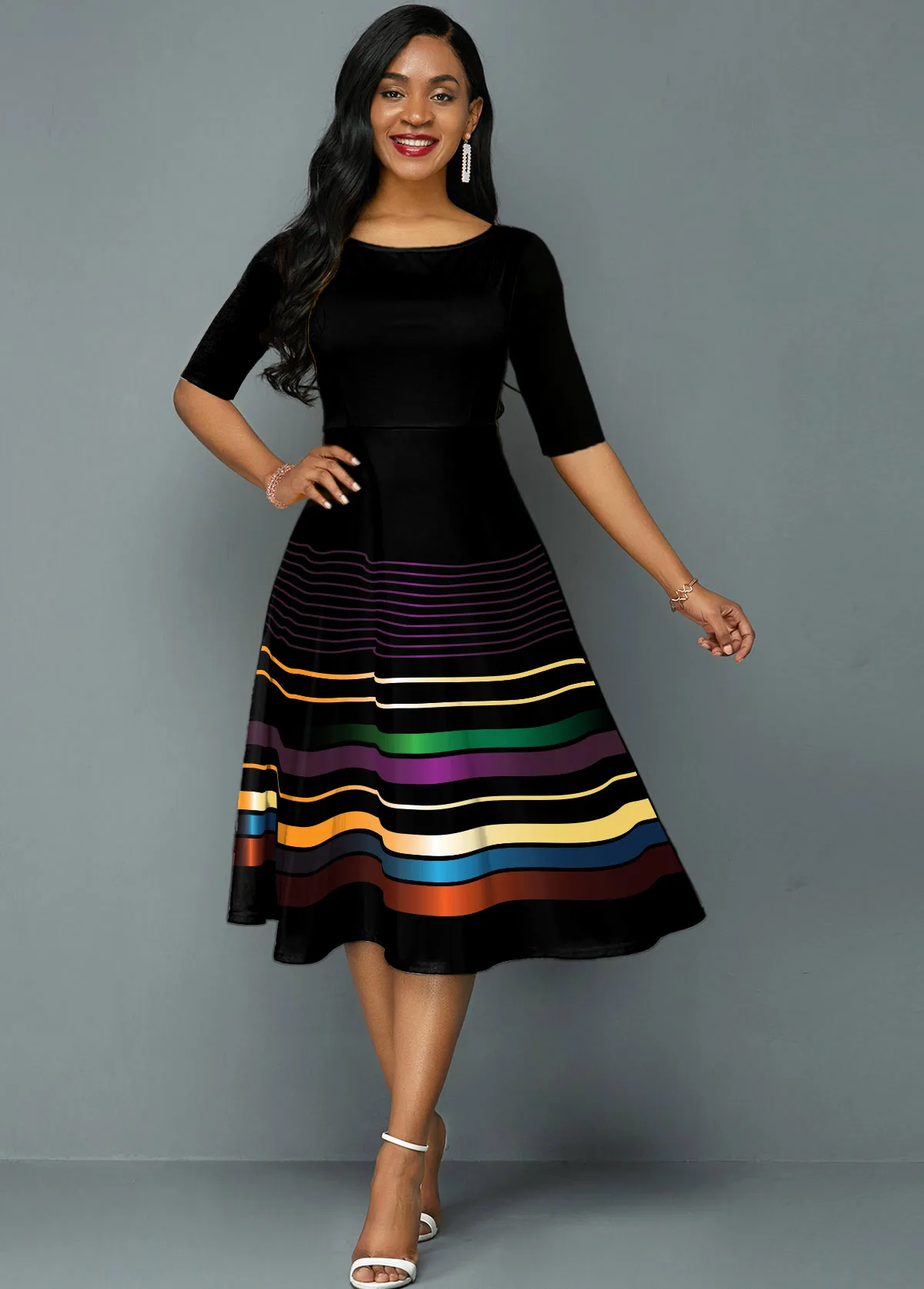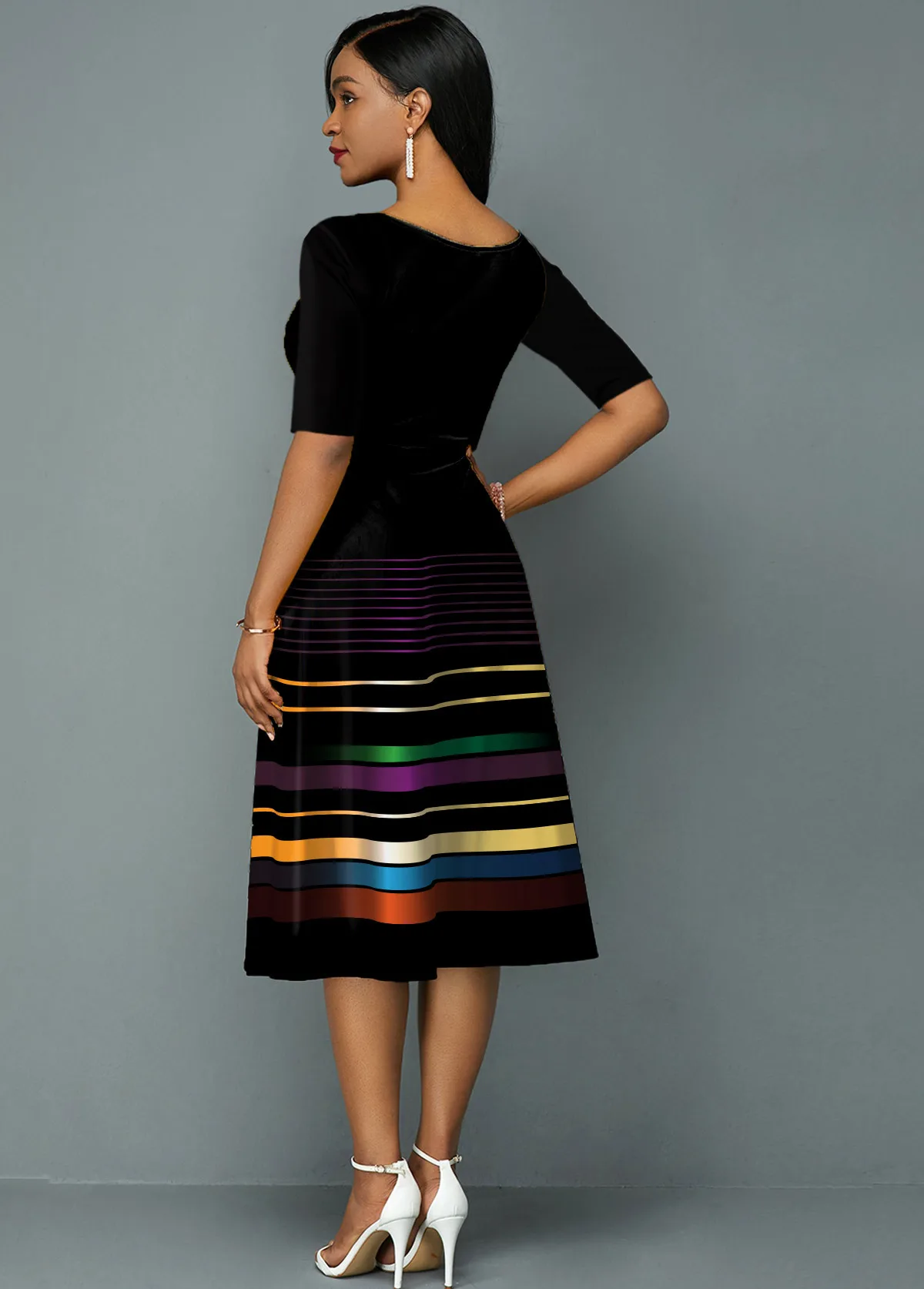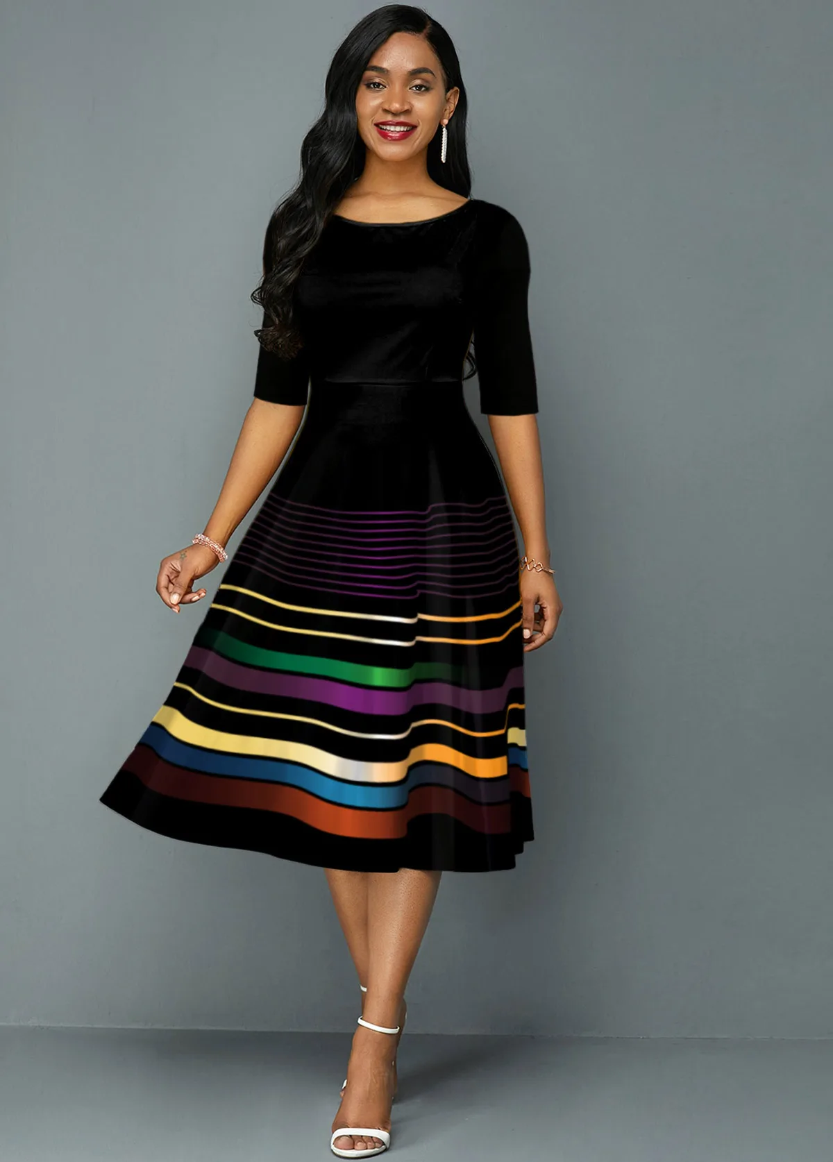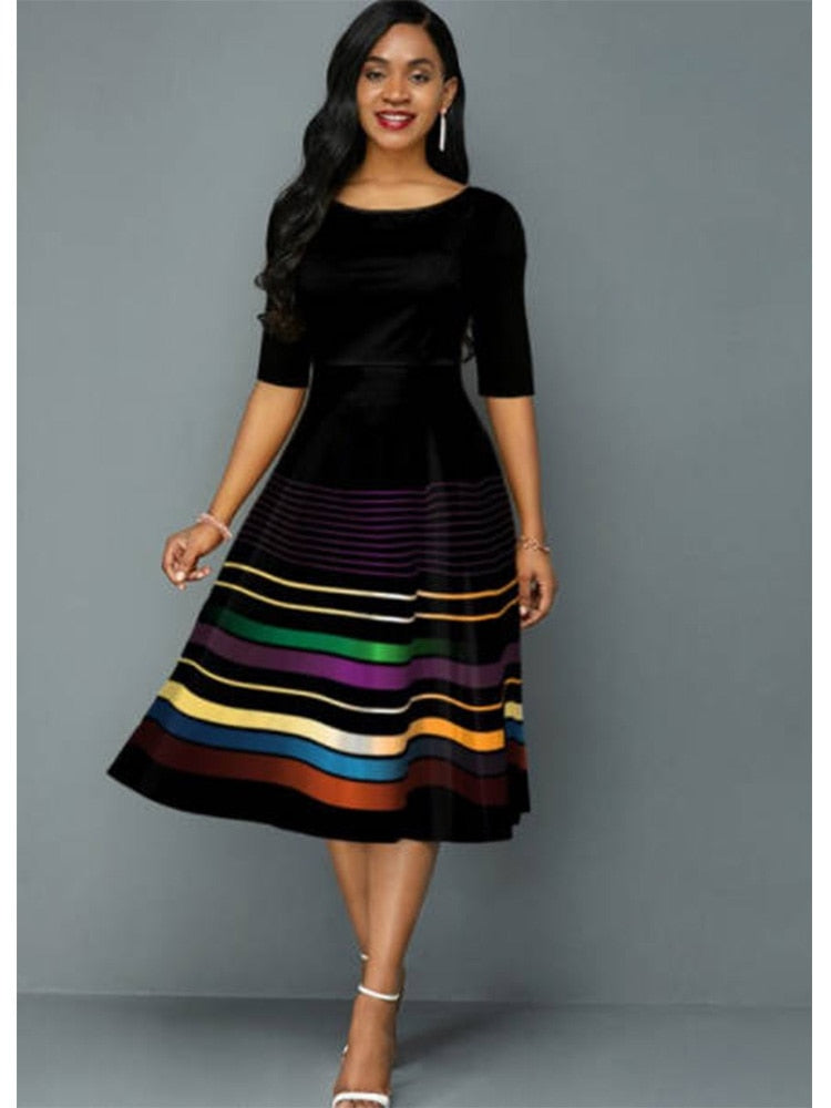 Slim Patchwork Striped Printing High Waist Half Sleeve Summer Dresses Woman 2022 Large Swing Beach Vintage Casual Midi Dress 5XL