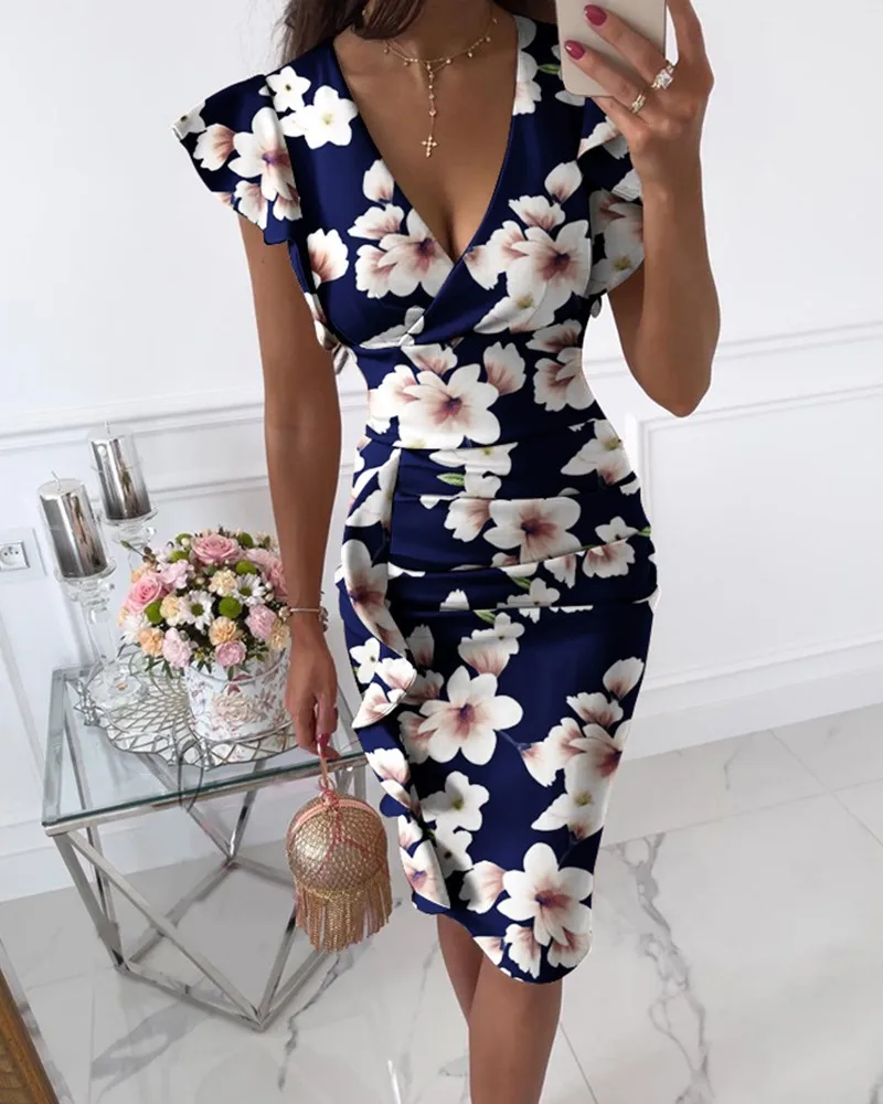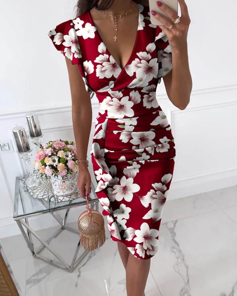 Summer Bodycon High Waist Retro Fashion Party Dresses for Women 2022 Patchwork Printing V-Neck Elegant Short Sleeve Midi Dress