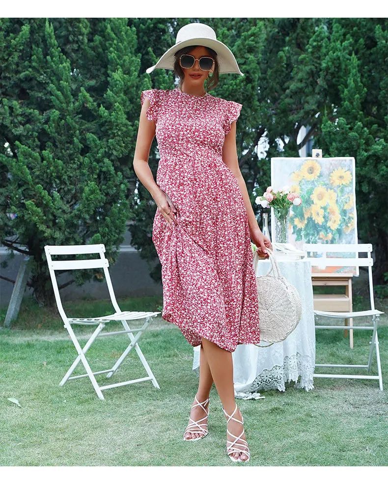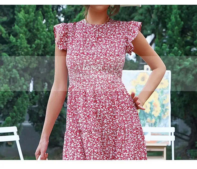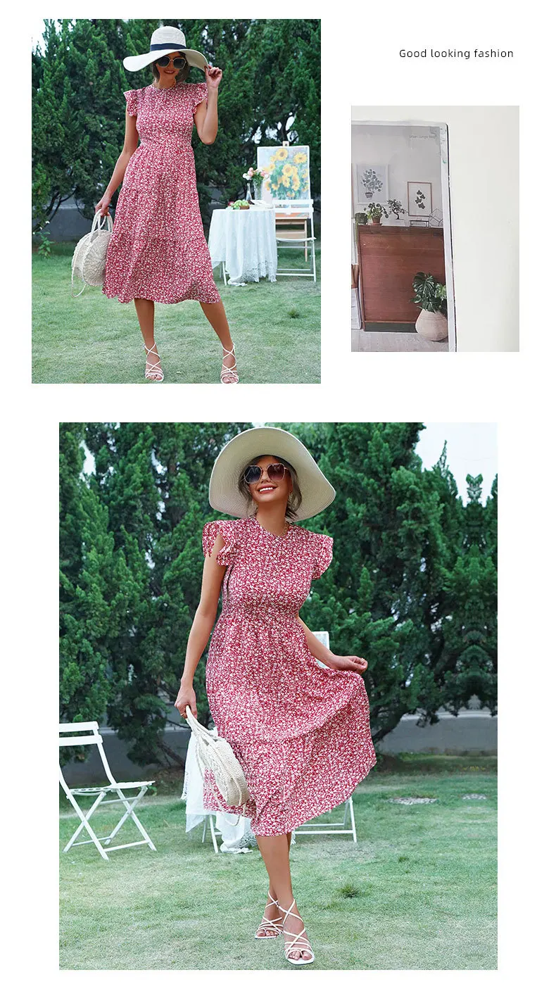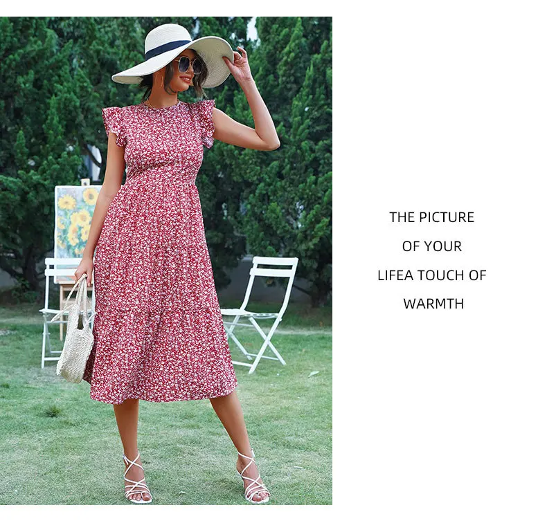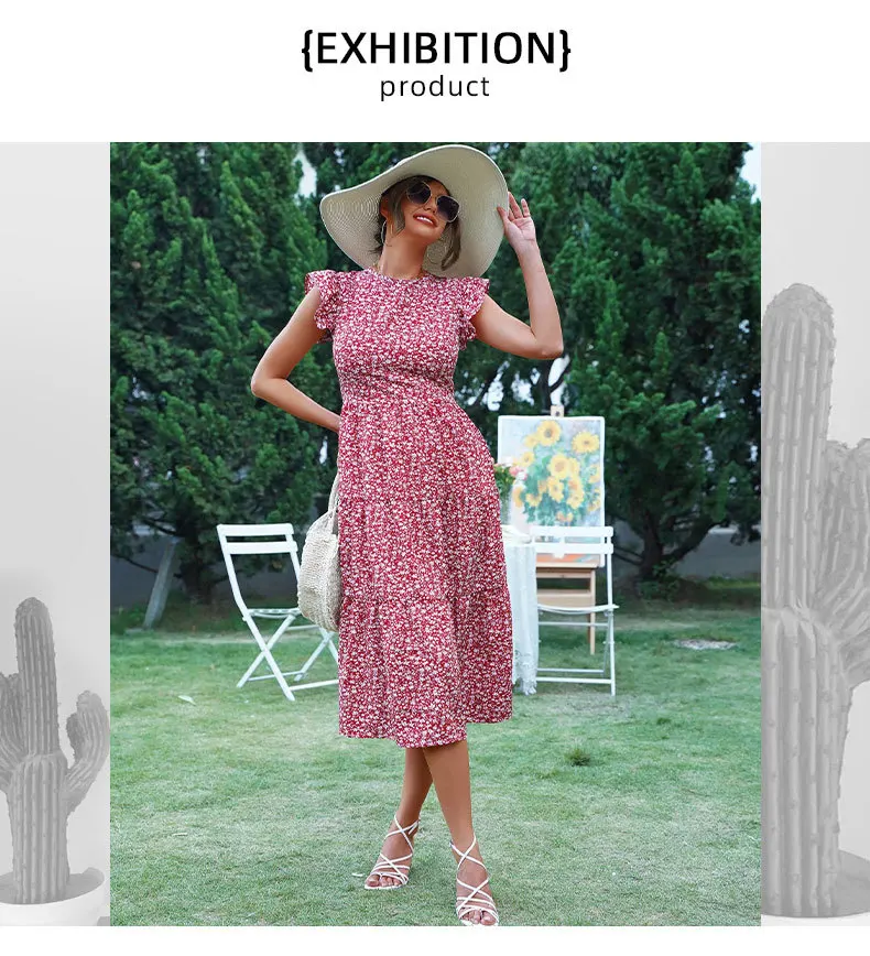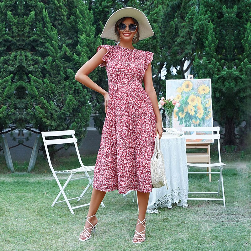 Summer Floral Midi Dress Women Sexy Ruffle Big Hem Short Sleeve Holiday Beach Dress Casual Elegant Red Long Party Dresses 2022