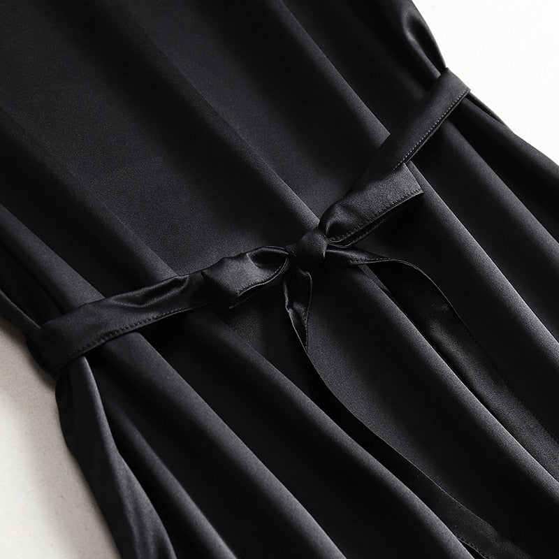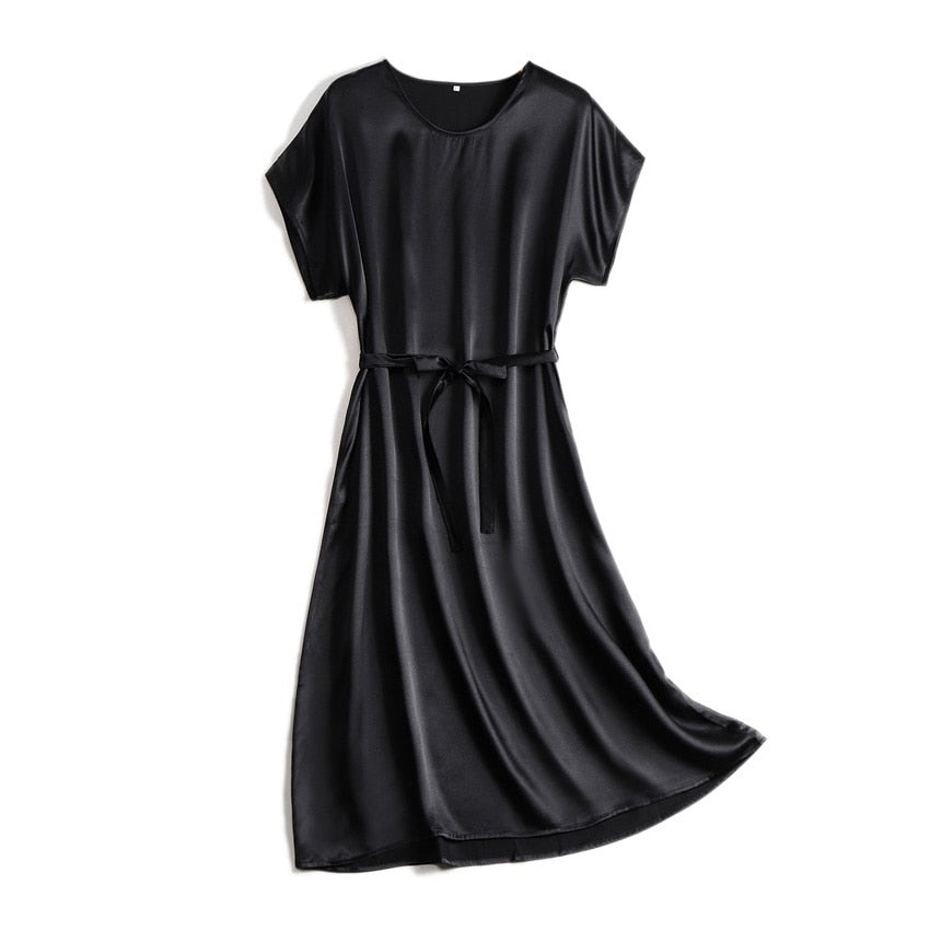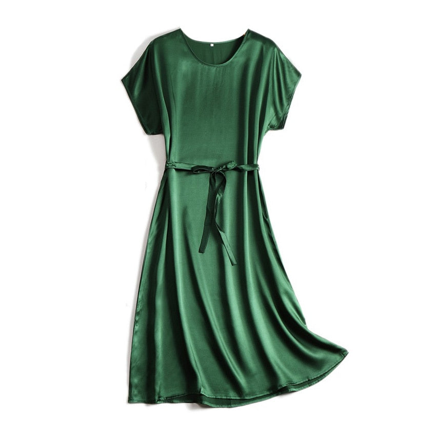SuyaDream Woman Midi Dress 100%Silk Satin Solid Bat Sleeves Sashes Dresses 2022 Spring Summer Green Black Chic Dresses