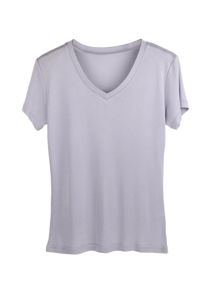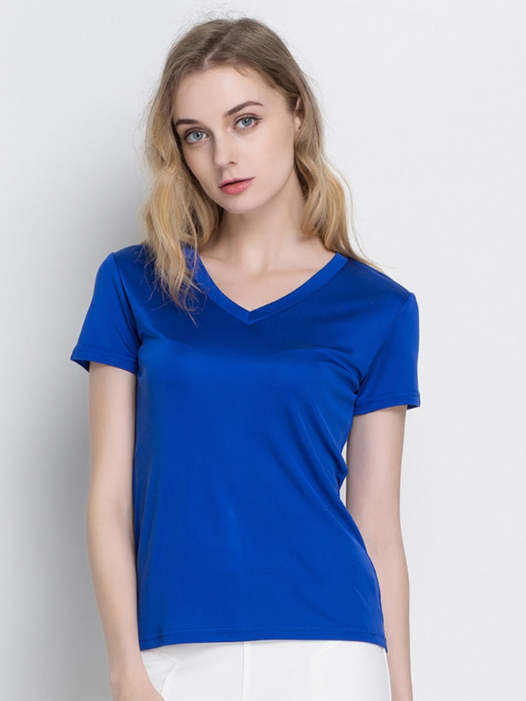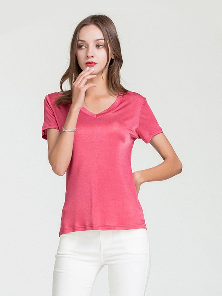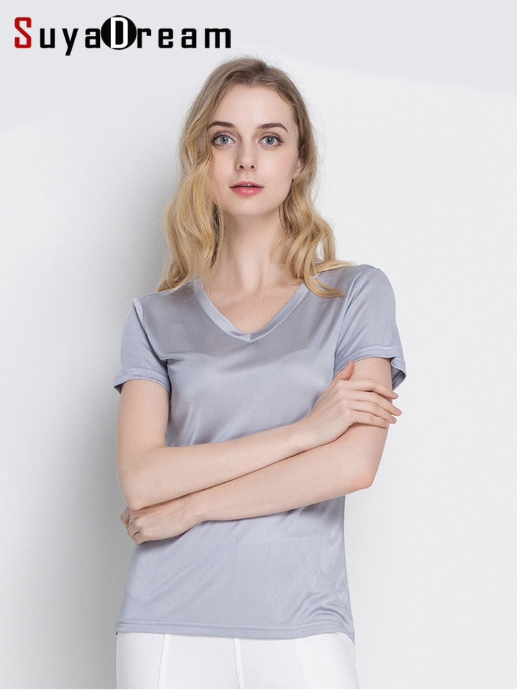 SuyaDream Women Silk T shirt Knitted Natural Silk Short Sleeve Solid V neck Basic Tee 2022 Summer Top