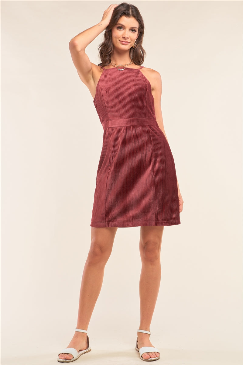 Cranberry red, solid, corduroy, sleeveless, square neckline, adjustable shoulder straps, detachable snap button closure belt detail, back zipper closure, mini length, lined, semi-stretch, tight fitting, glossy finish, casual, cute, stylish, new fall/winter collection
