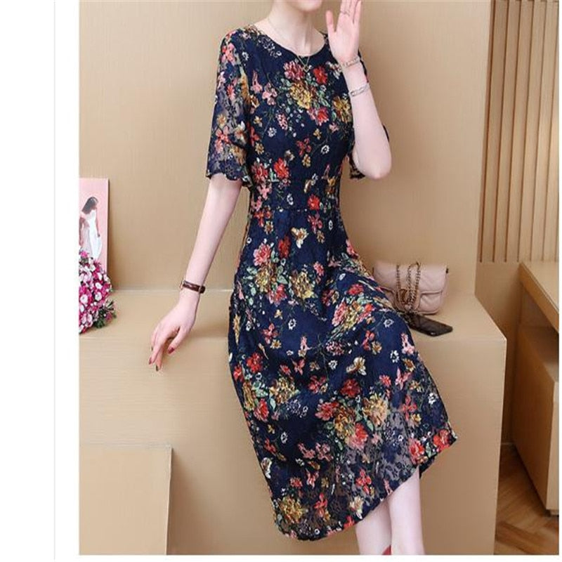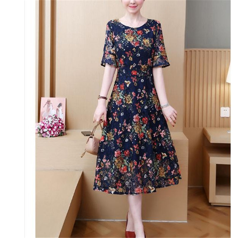 Vintage Lace O Neck Print Summer Dress Women 2020 Detail A Line Dresses Ladies High Waist Short Sleeve Loose Dress
