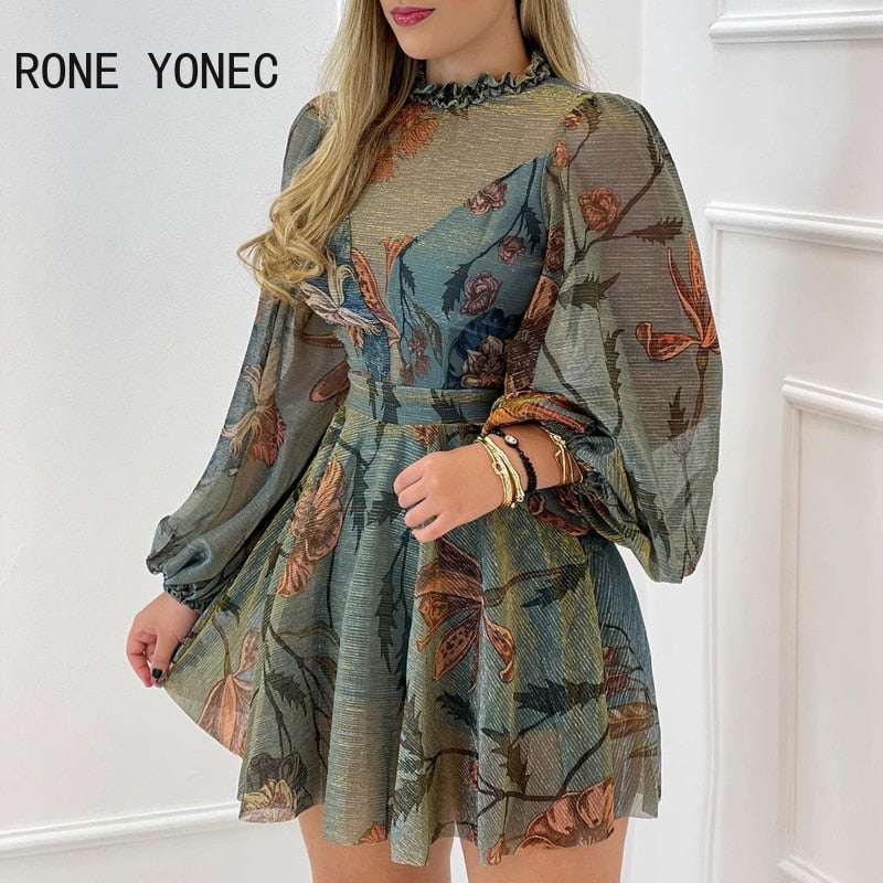 Women Chic Round Frill HemNeck Mesh Puff Sleeve Mini Party Dress