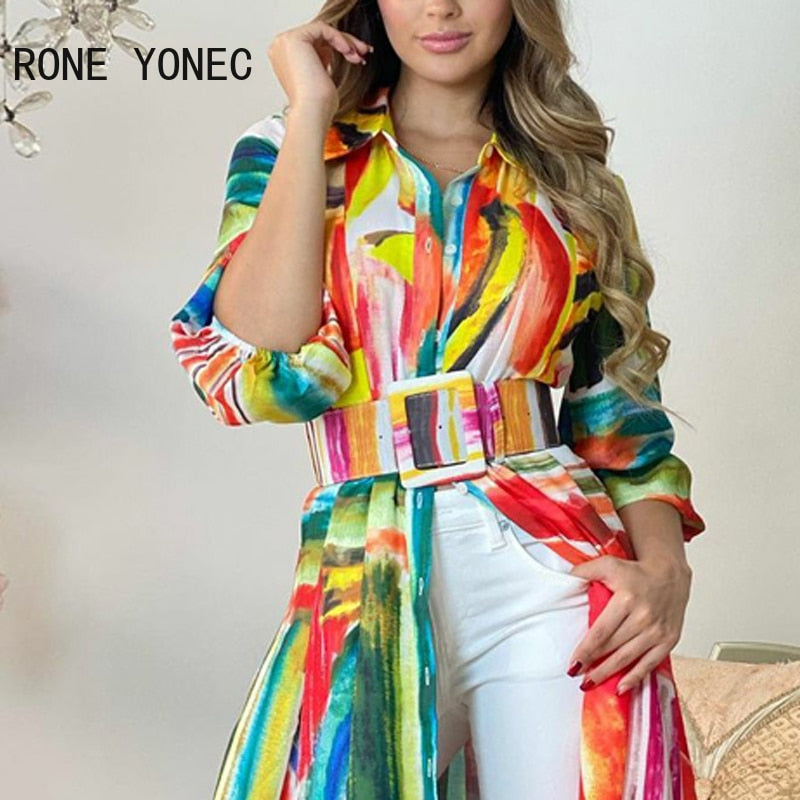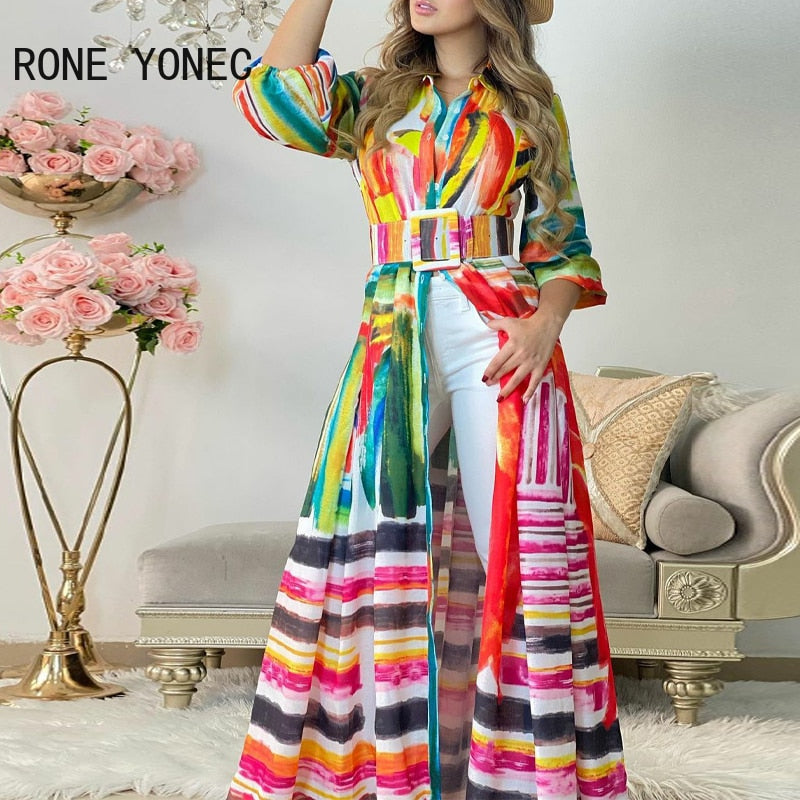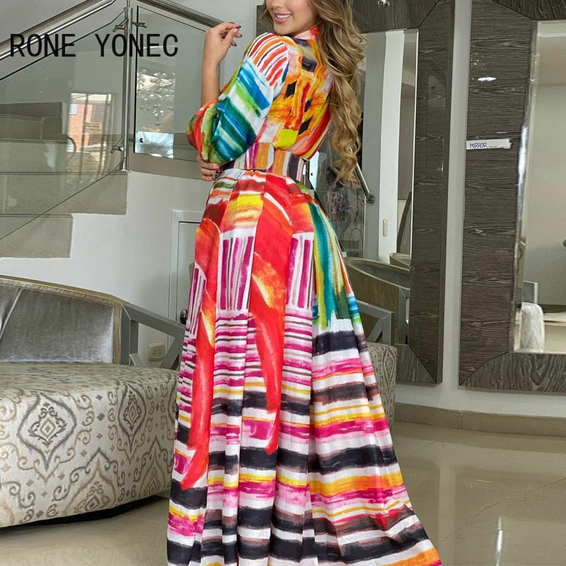 Women Elegant Tie dye Lantern Sleeves Sashes Maxi Colorful Dresses Tops
