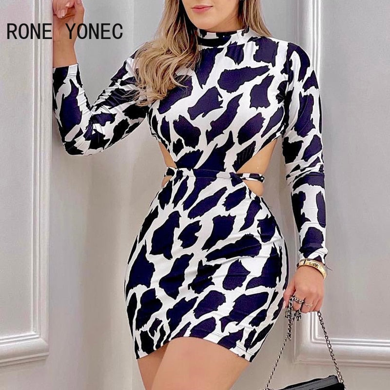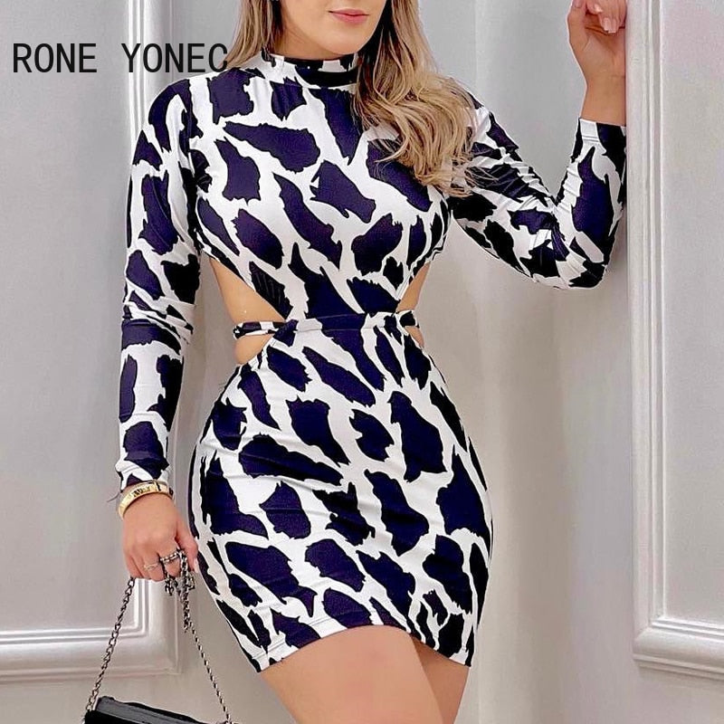 Women Sexy Elegant Turtleneck Long Sleeves Leopard Pattern Midriff Bodycon Mini Sexy Party Dresses