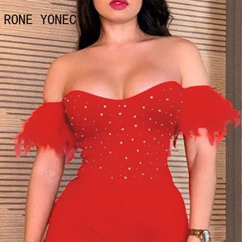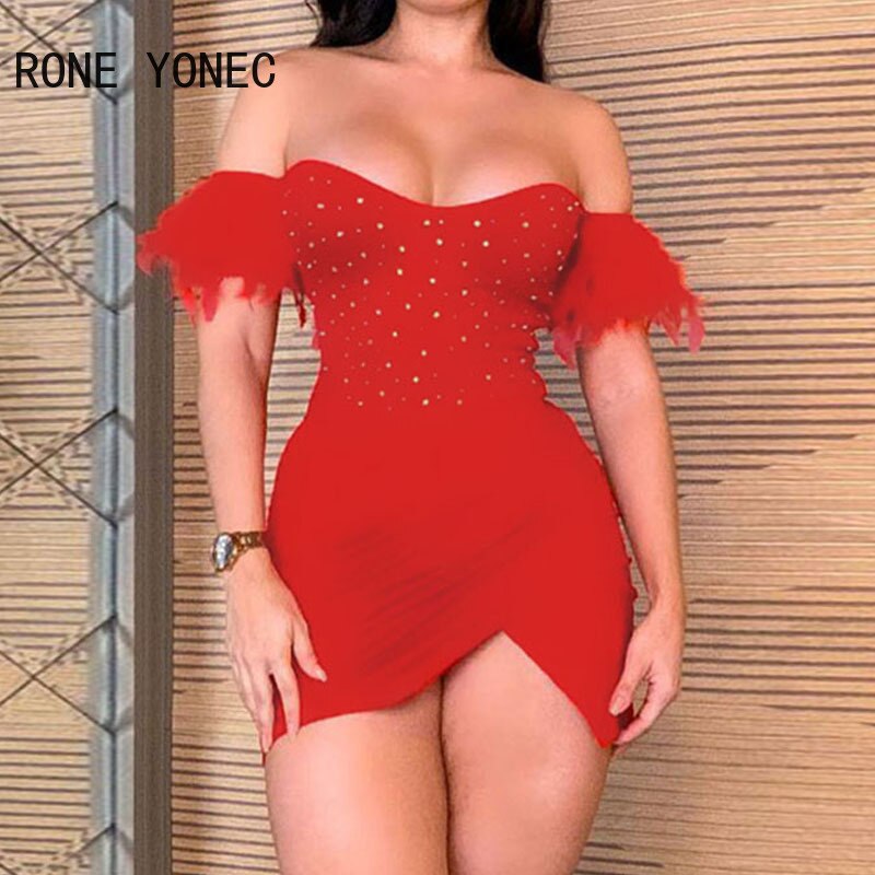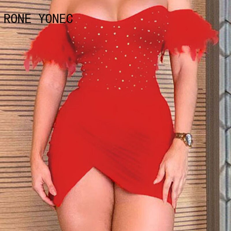 Women Sexy Off Shoulder Short Feather Sleeves Rhinestone Mini Bodycon Wrap Party Red Dresses