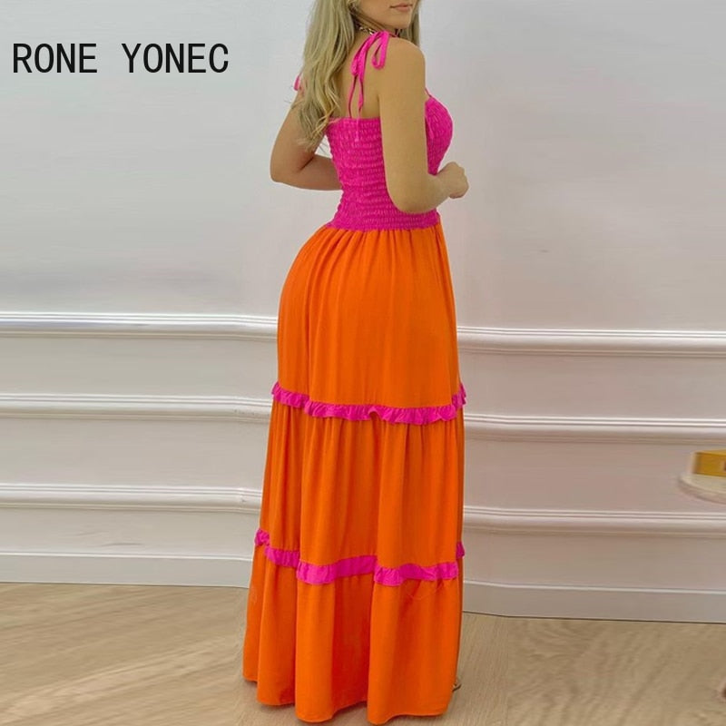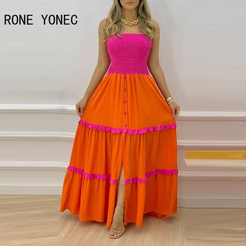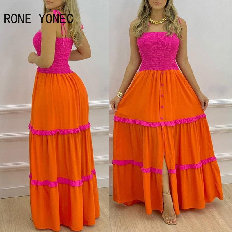 Women Shirred Frill Hem Buttoned Slit Colorblock Maxi Dress Vacation Dress 2021