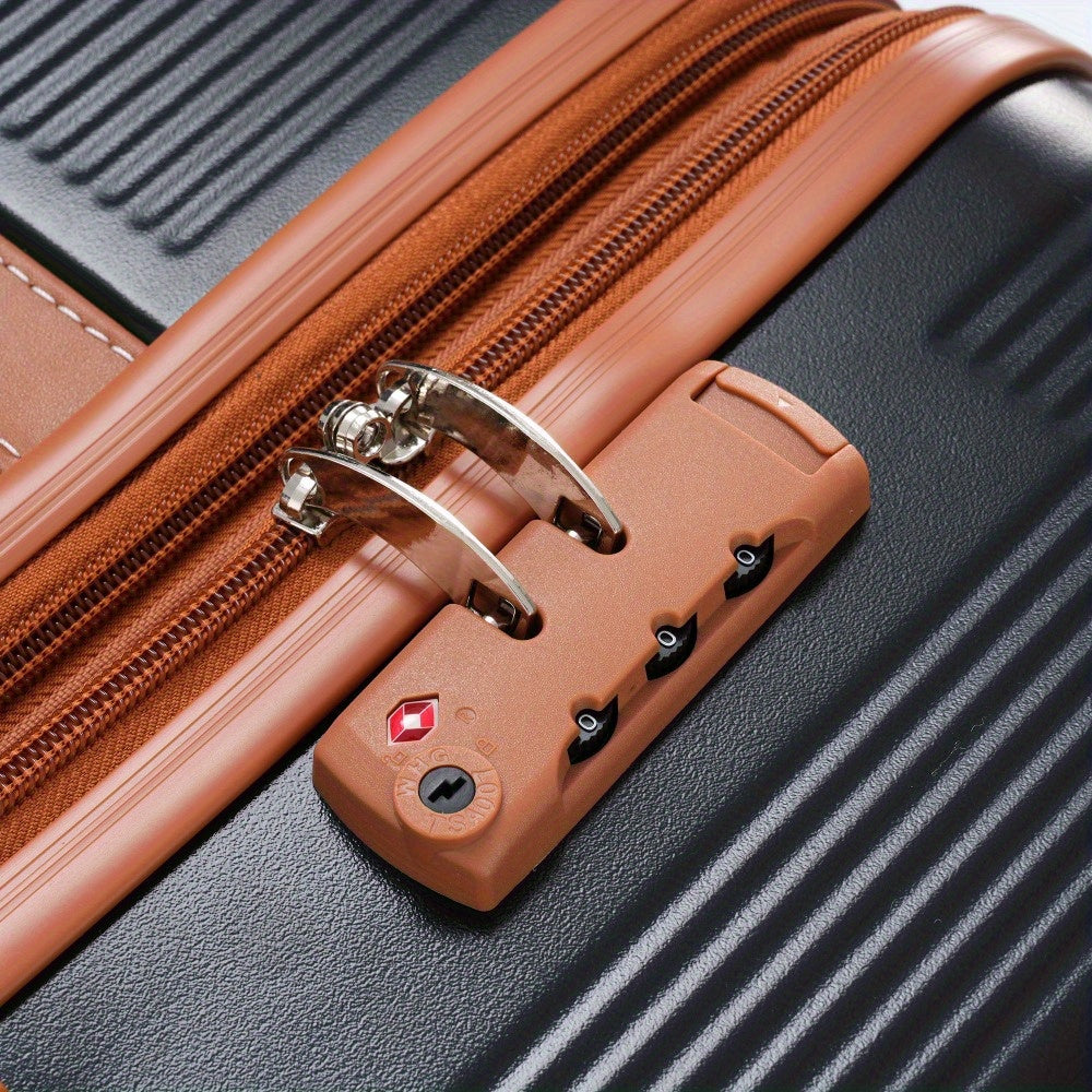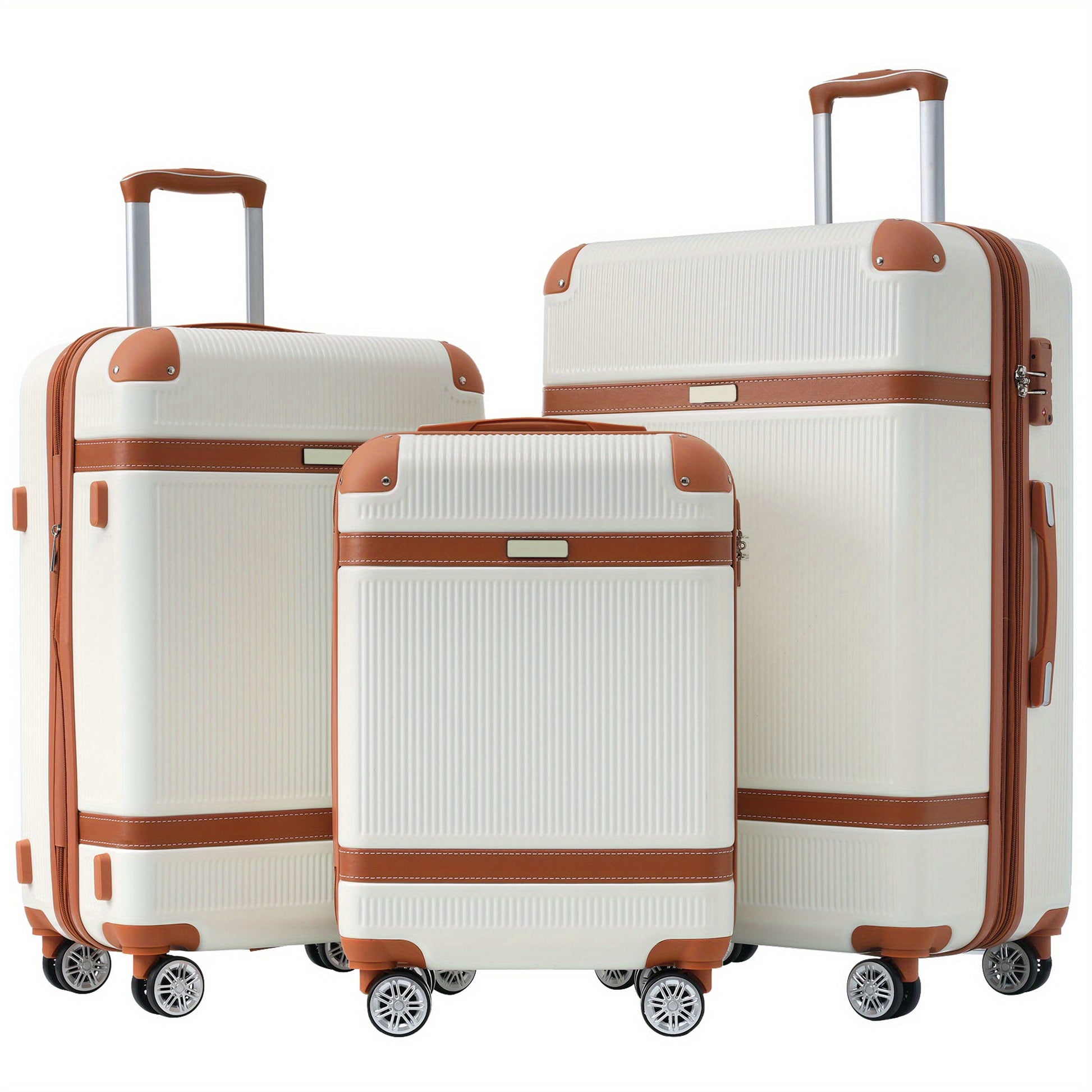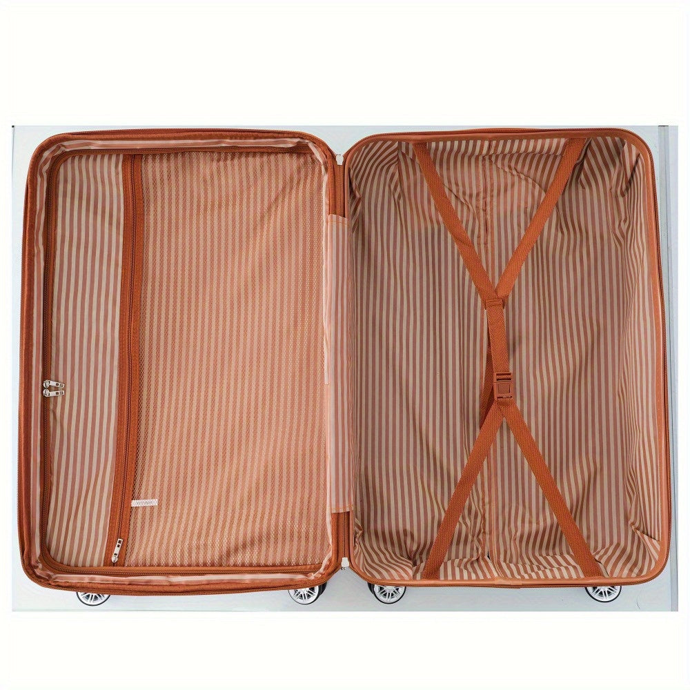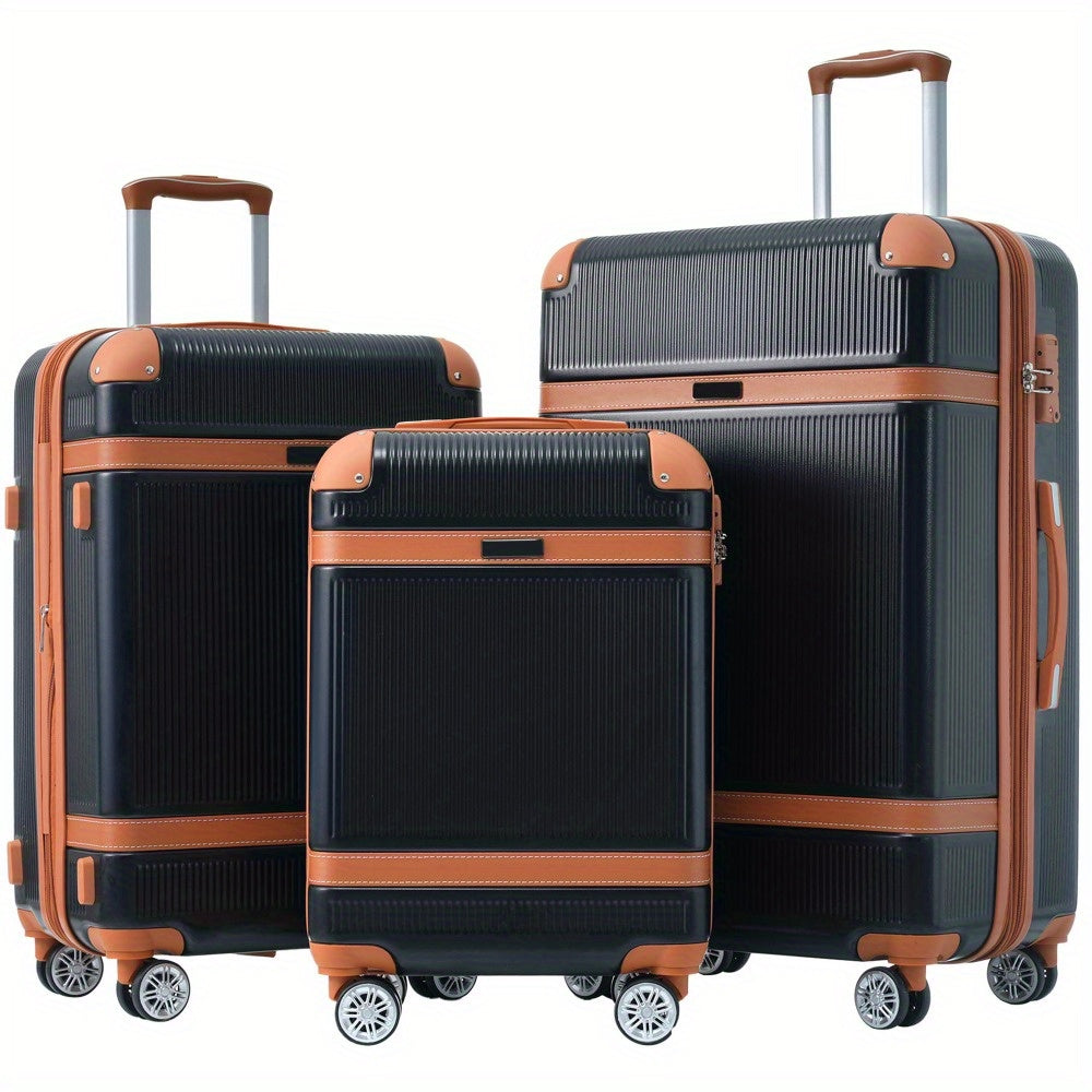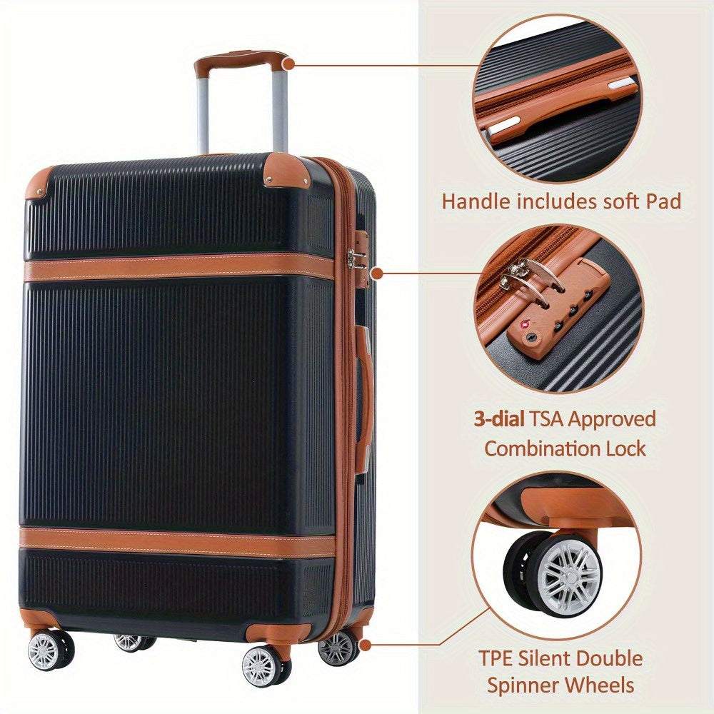 Set of three lightweight and durable ABS suitcases featuring spinner wheels and TSA locks, including sizes 20 inches, 24 inches, and 28 inches. The 20-inch carry-on measures 13.8" x 8.7" x 22", the 24-inch checked luggage measures 17.7" x 11" x 26.4", and the 28-inch checked luggage measures 19.7" x 12.2" x 30.7".