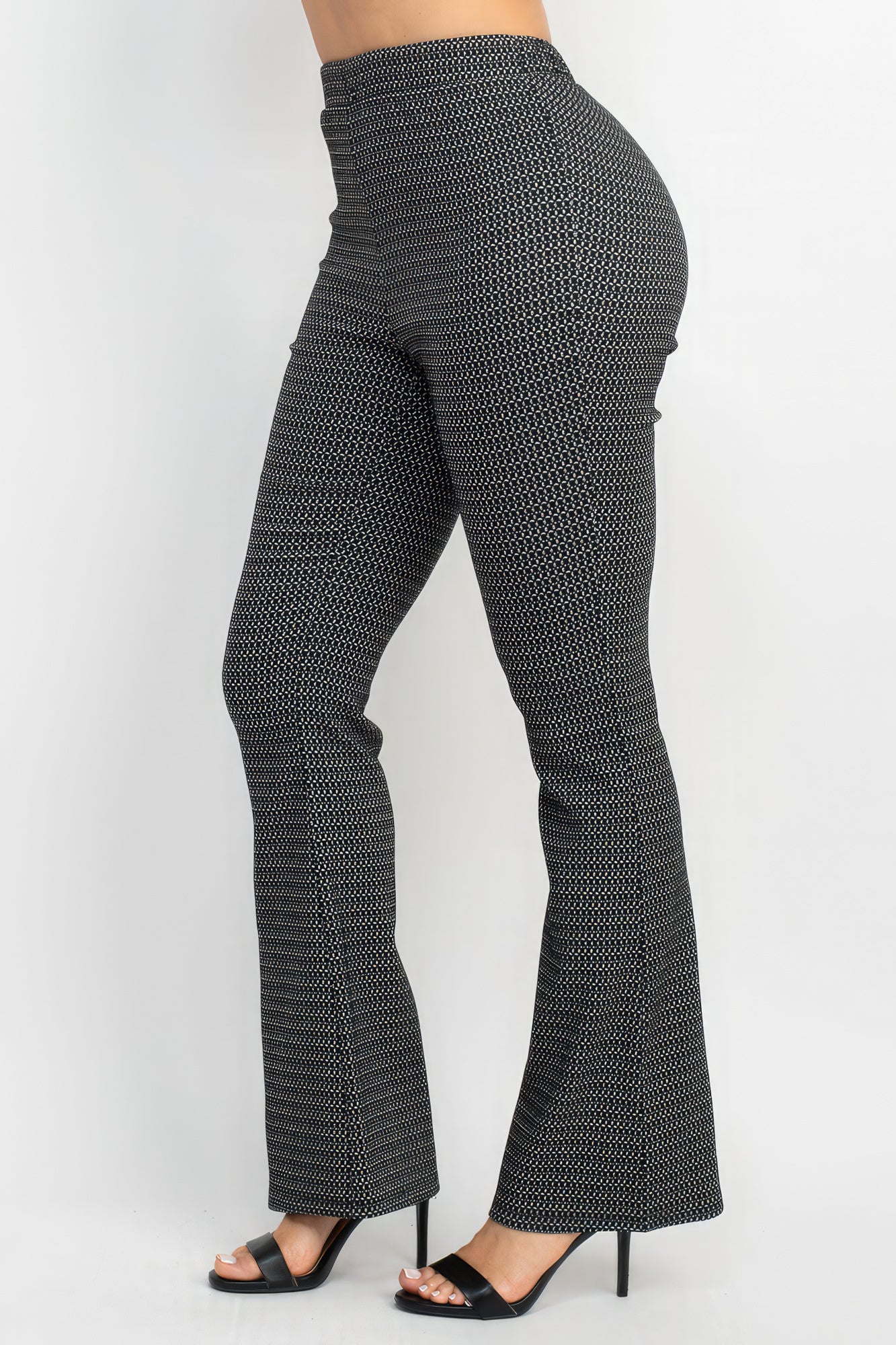 Introducing our Fitted Flare Leg Plaid Pants in Black/White, a sophisticated and stylish addition to your formal wardrobe. These knit pants feature a flattering high-rise waist, an elasticized waistband for comfort, a flare leg silhouette, and a full length for an elegant look.
