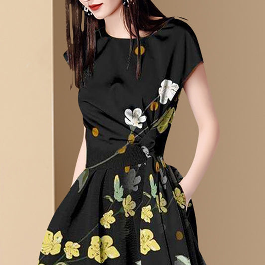 2021 Summer Runway French Short Sleeve Women's O Neck Slim Multicolor Floral Print Vintage Elegant Knee Lenght Casual Dresses