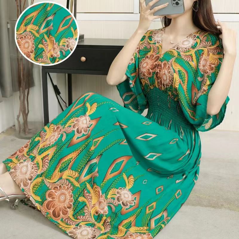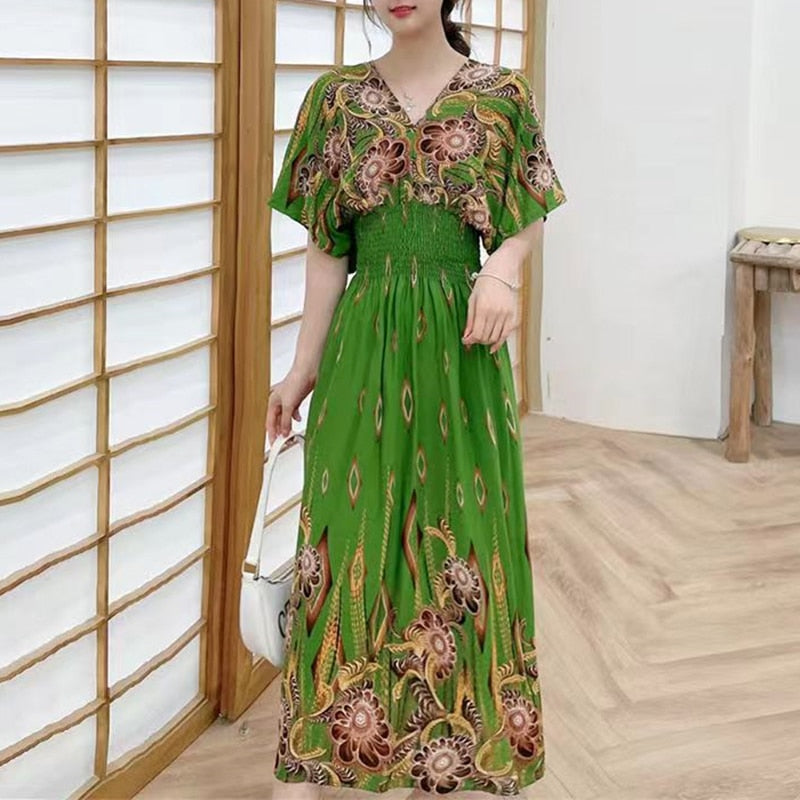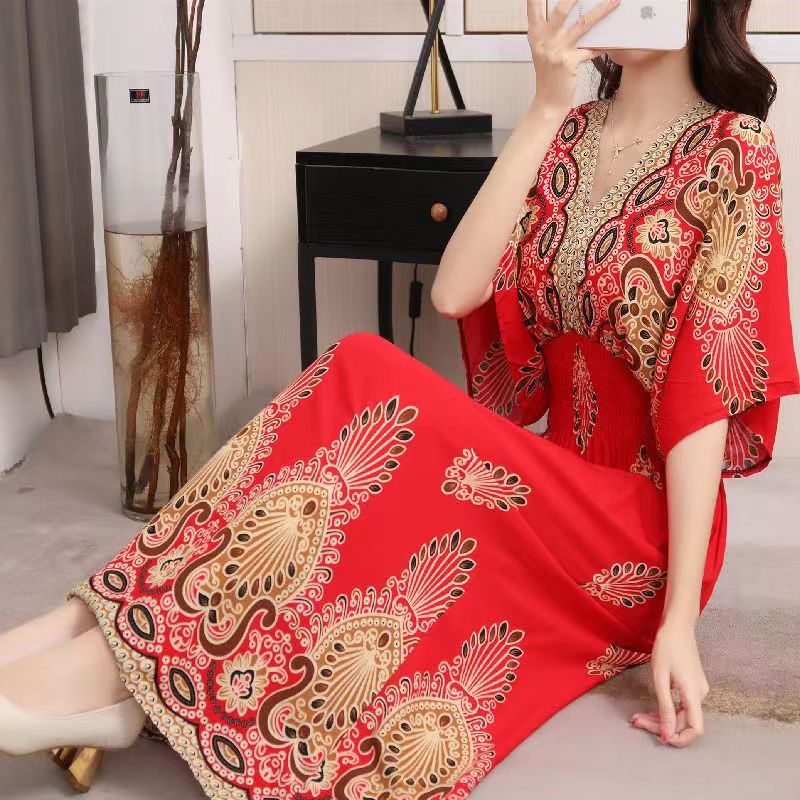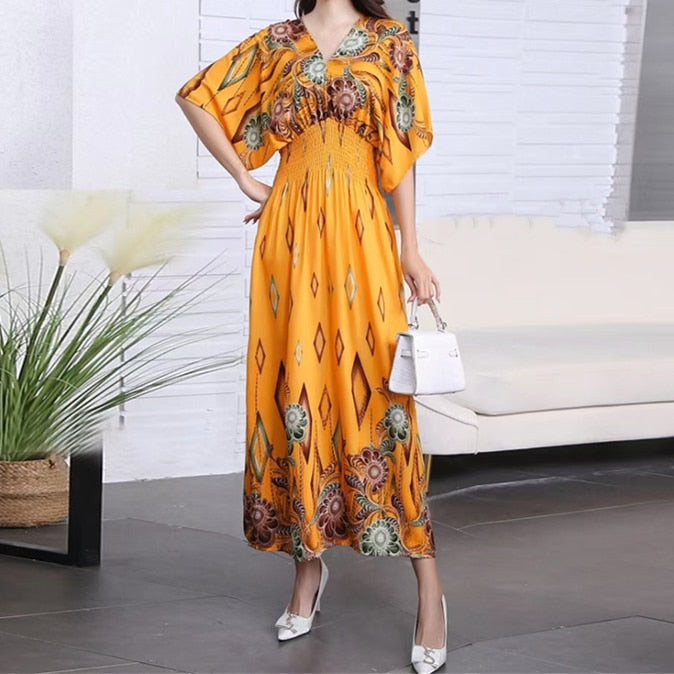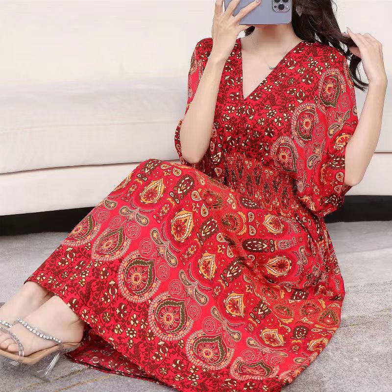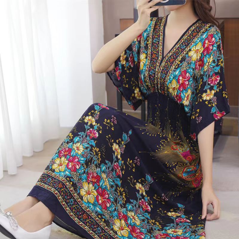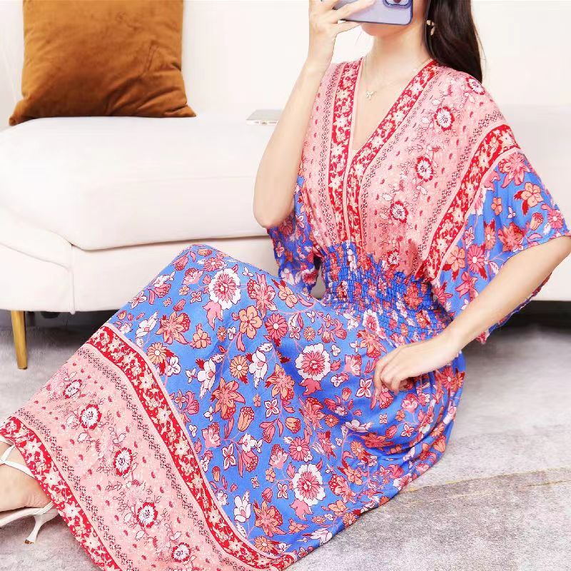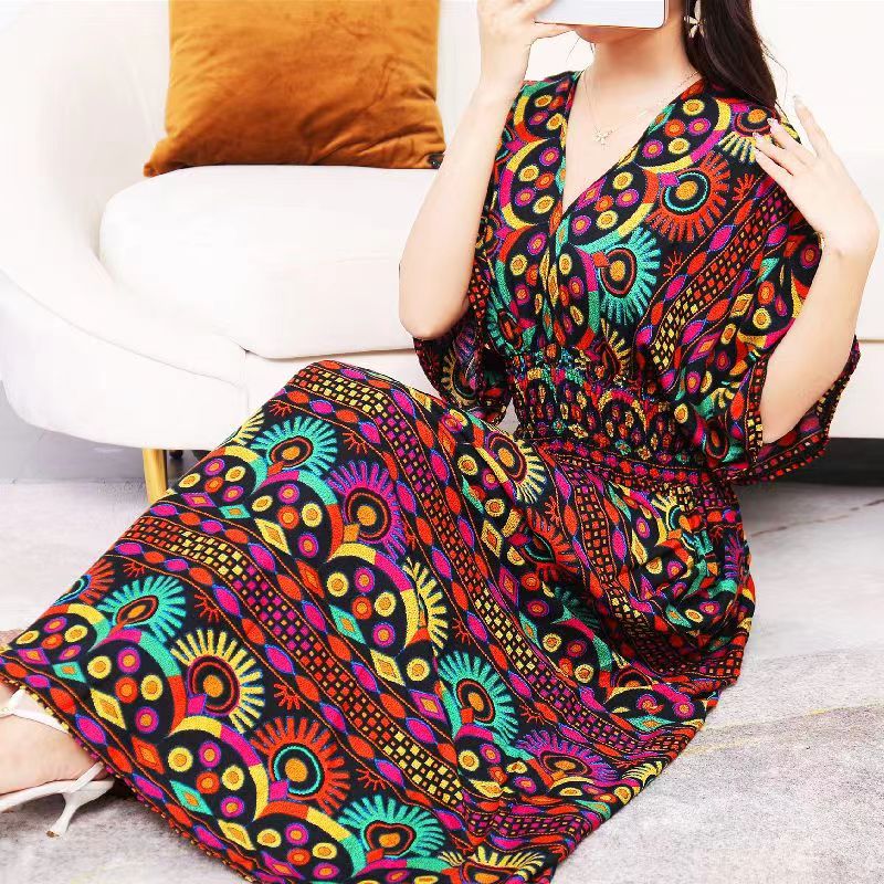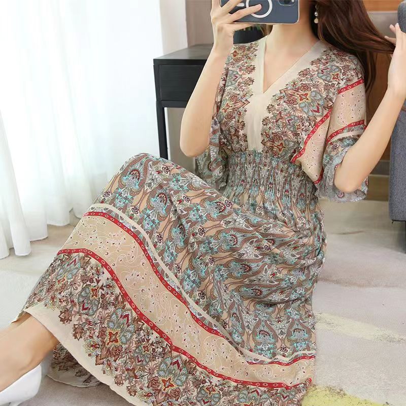 Casual Elegant Retro Style V-neck Tunic Large Swing Printed Dress Long Skirt