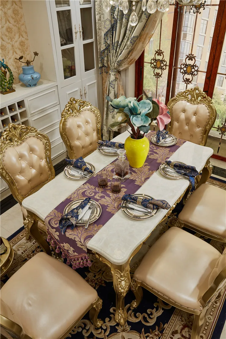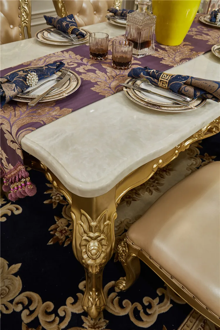 Champagne Marble Dining Table and Chairs European-style Long Luxury Dining Table Villa Solid Wood Carved Table