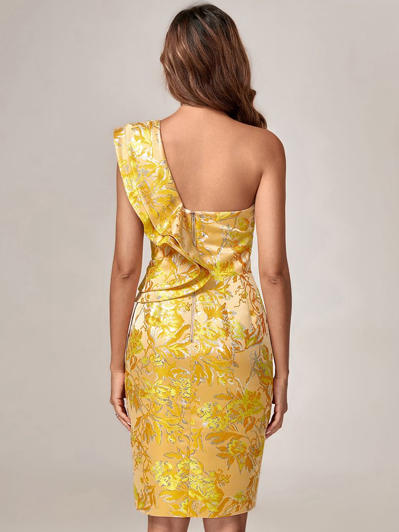 Elegant Party Dresses for Women 2023 Summer Ruffle Bodycon Dress Yellow jacquard One Shoulder Evening Birthday Club Outfits