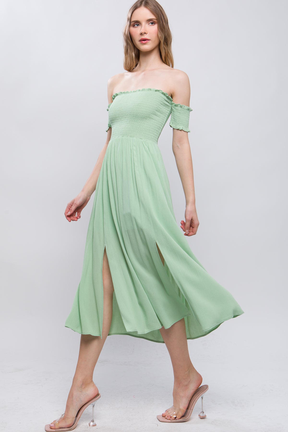 Lightweight woven rayon shapes a smocked bodice with short, off-the-shoulder sleeves. Flowy midi skirt has twin side slits.