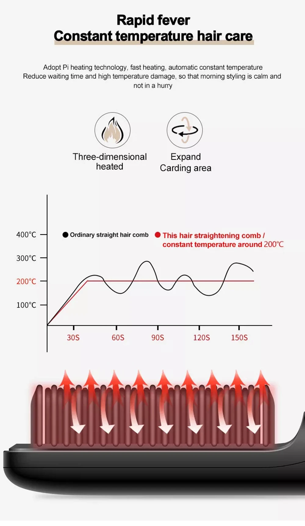 1. ABS high-temperature material, anti-scalding comb design, simple and large hair, effectively protect the use from scalp damage and contact with possible burns due to excessive temperature during use