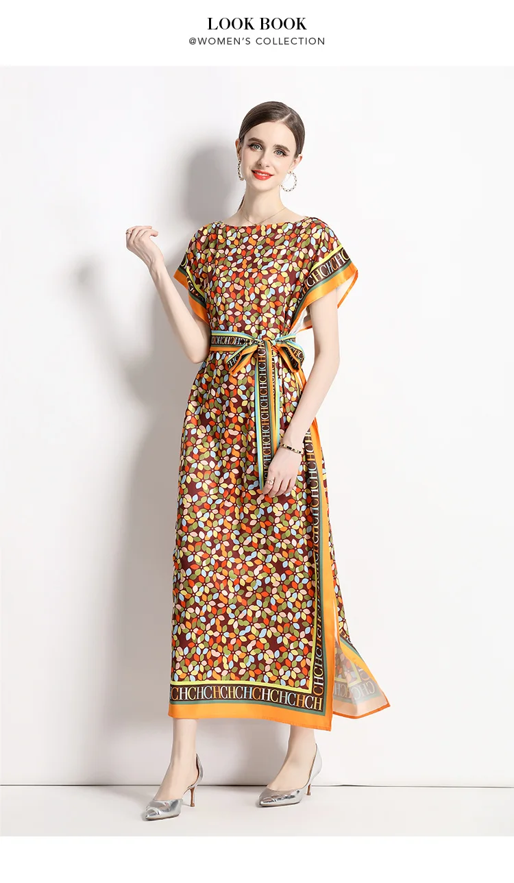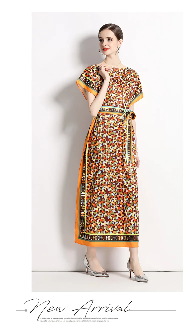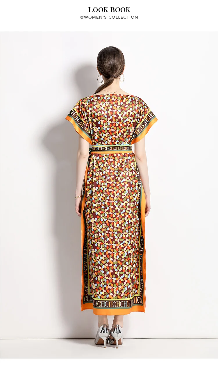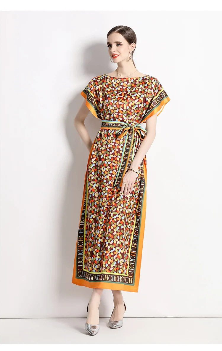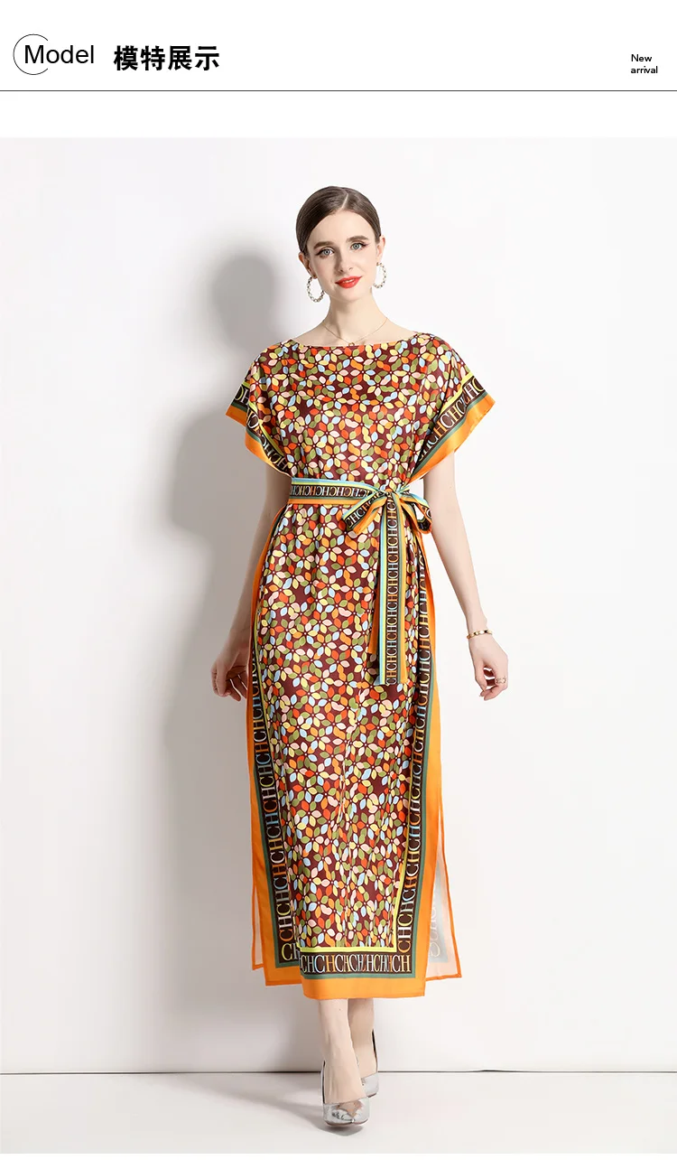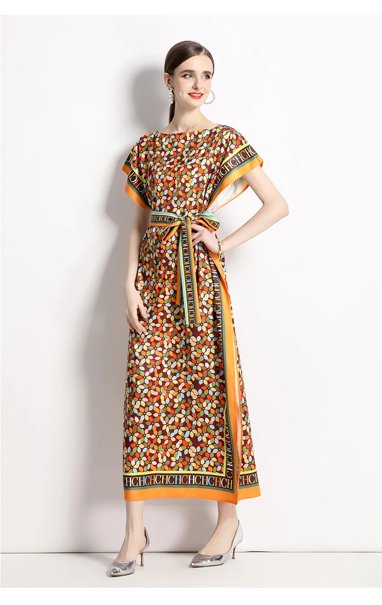 Runway Summer Designer Maxi Dress Women Slash Neck Bat Sleeve Flower Letter Print Lace Up Belt Split Holiday Long Robes N2060