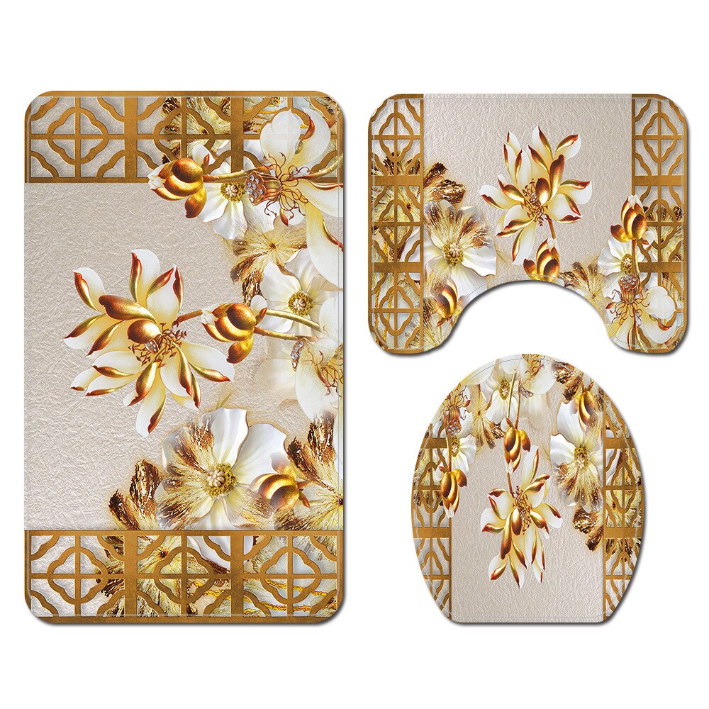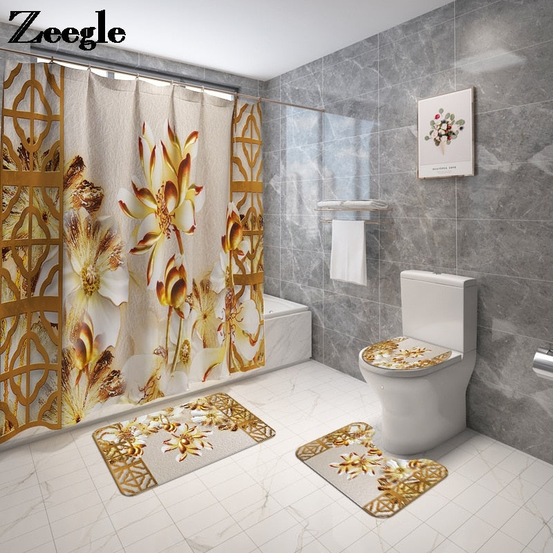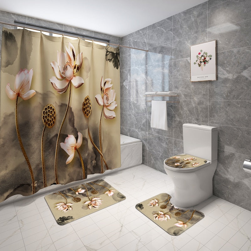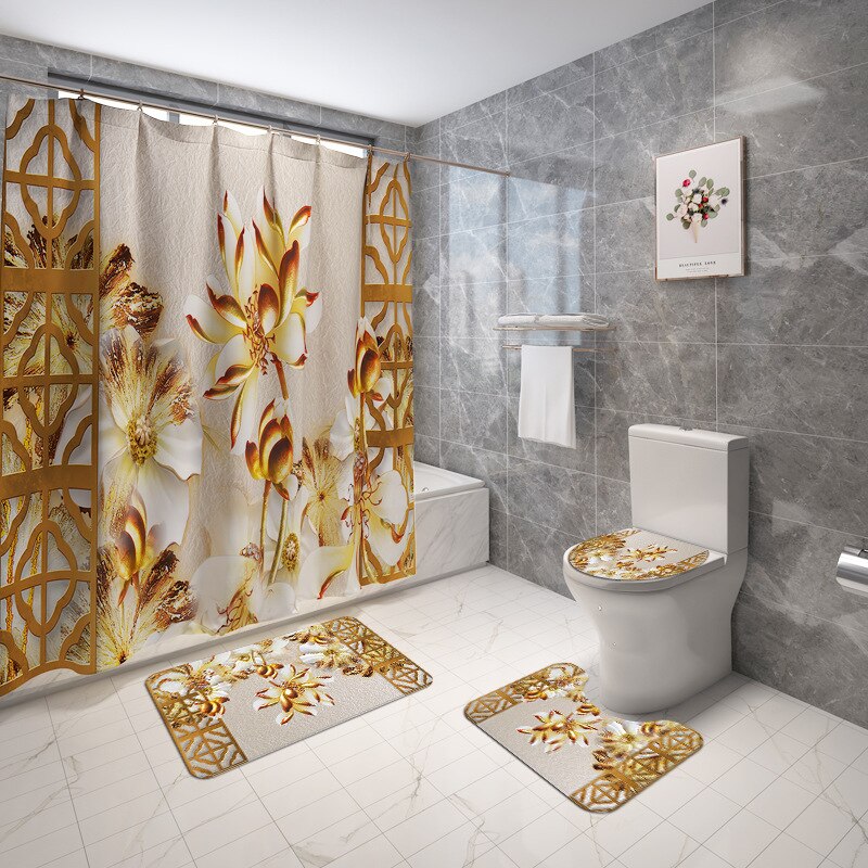 4pcs Floral Bathroom Carpet Bath Curtain Set Toilet Rugs and Shower Curtain Toilet Seat Cover Floor Mat Bathroom Mat Shower Mat