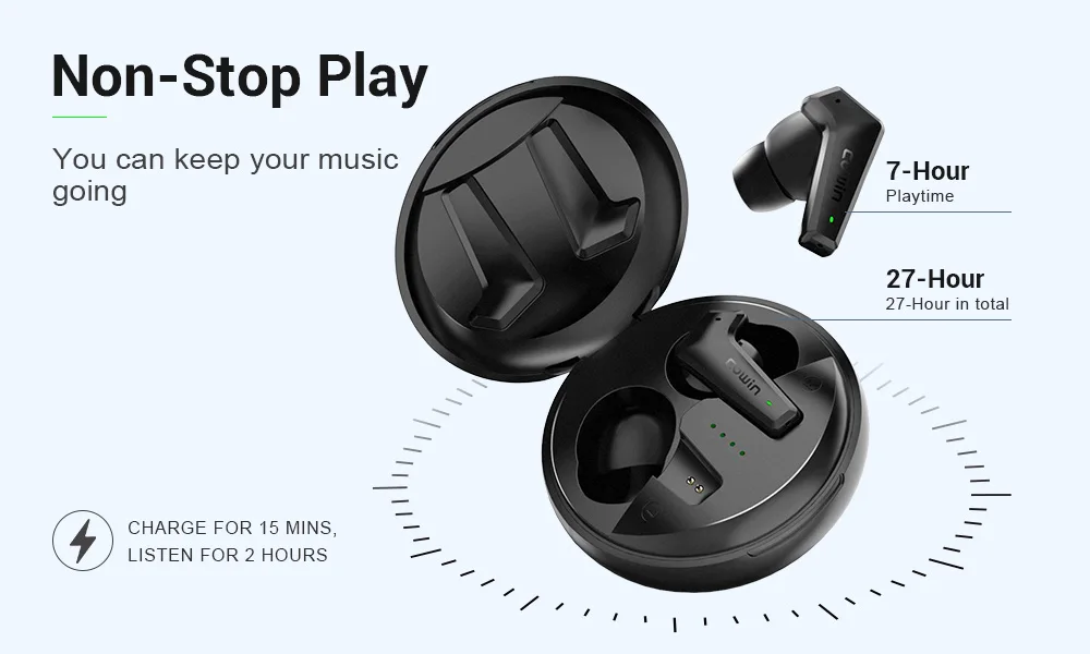 Up to 7 hours playtime on a single charge with additional 20 Hours of battery life with the charging case.