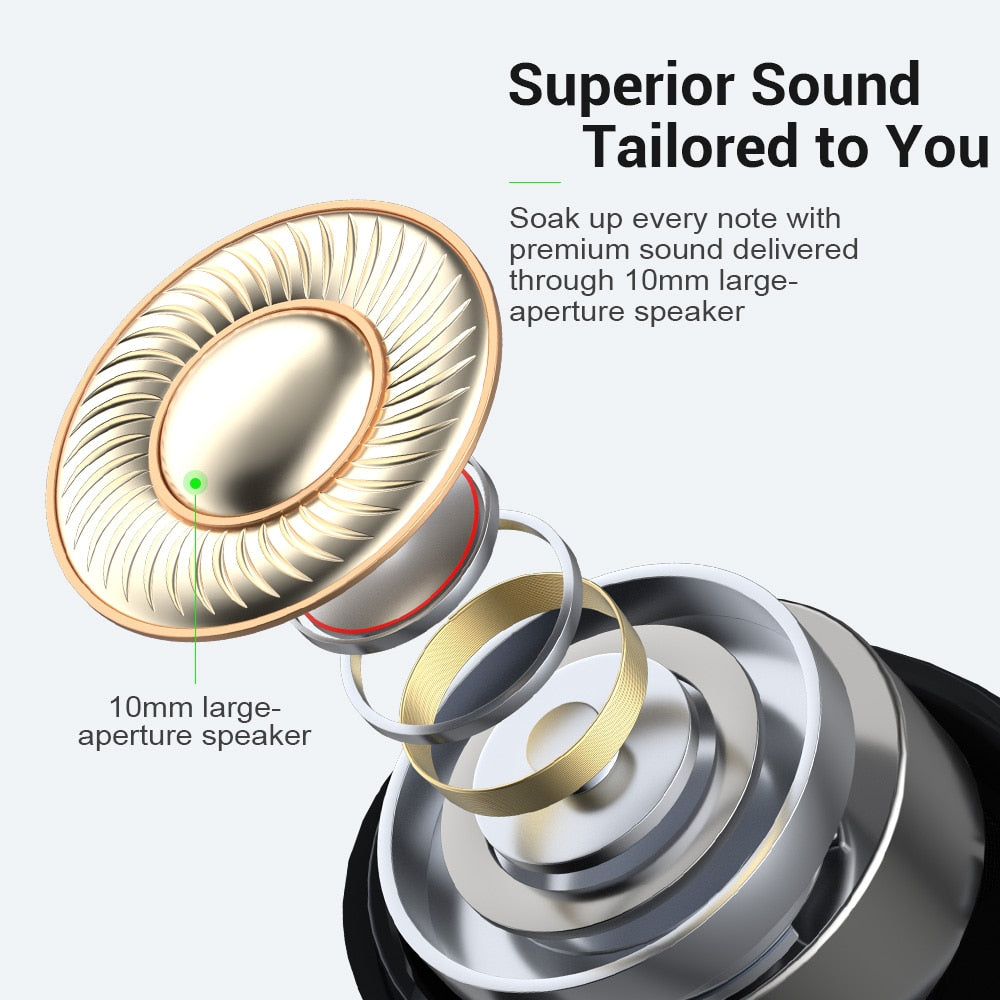 Bluetooth 5.2 true wireless connection technology keeps your music and calls connected without wire. With these Bluetooth earbuds, you can enjoy a stable connection during conversations and music with no audio dropouts or interruptions. Supports AAC, SBC codec.
