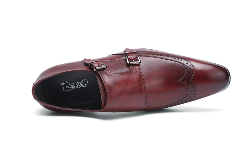 FELIX CHU High Quality Genuine Leather Men Formal Shoes Party Pointed Toe Dressy Wedding Burgundy Black Monk Strap Dress Shoes